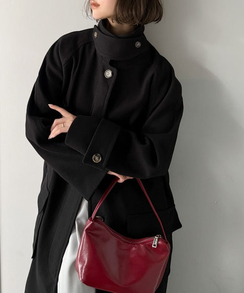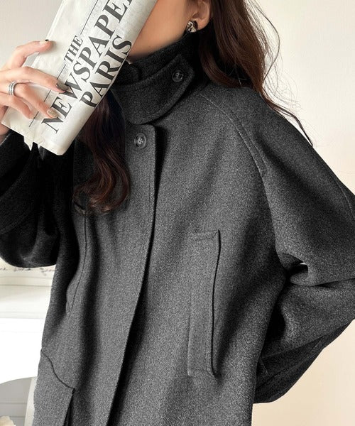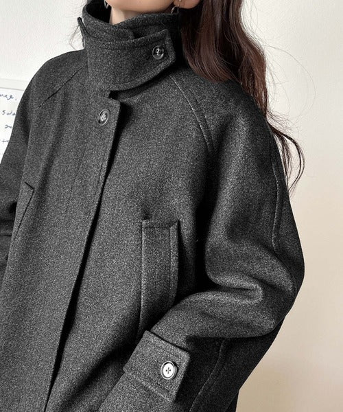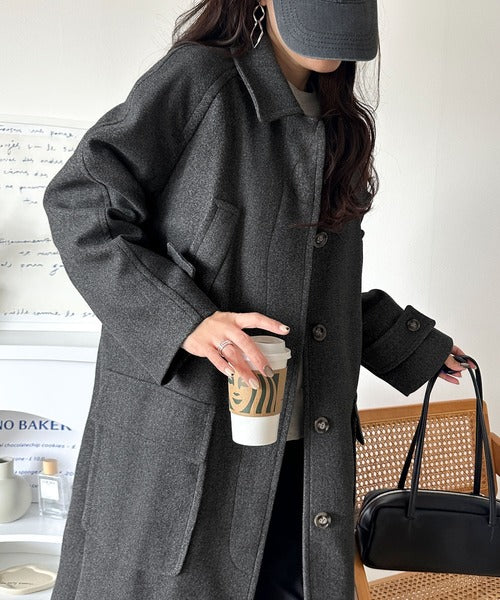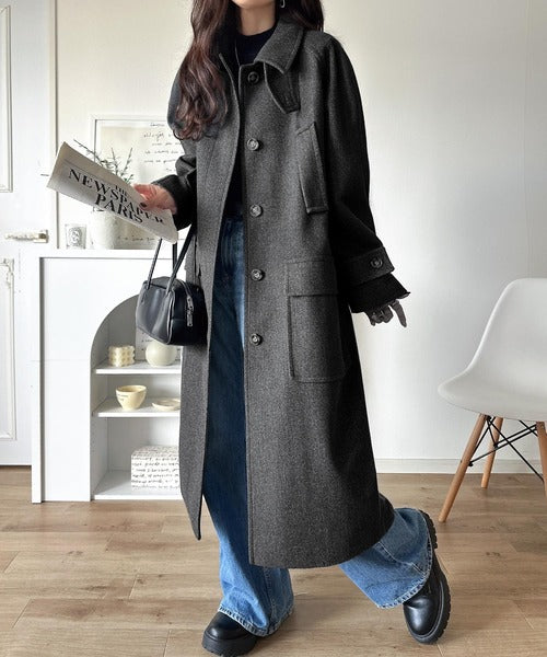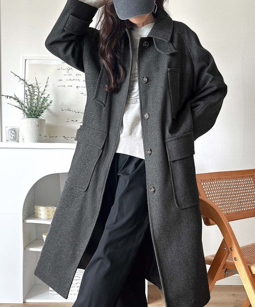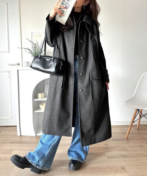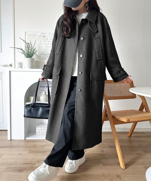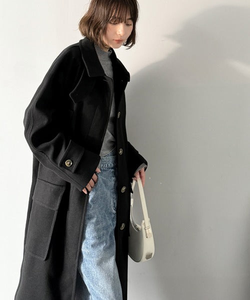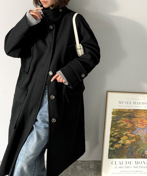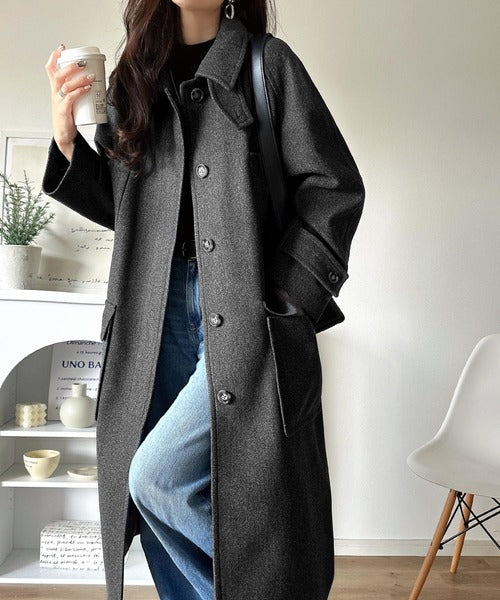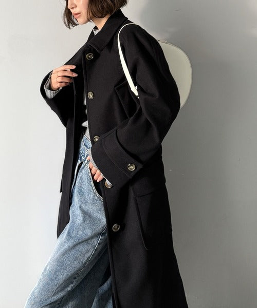 シンプルながらも高級感あふれるロング丈比翼ステンカラーコート。