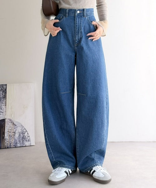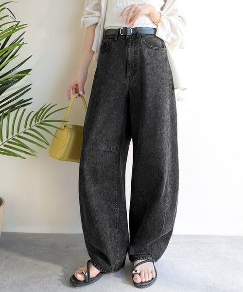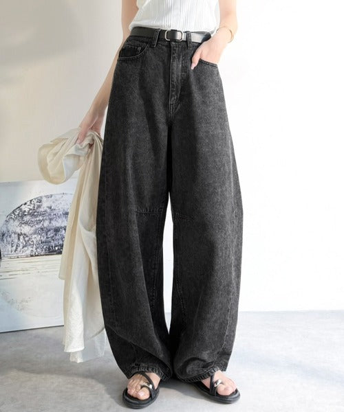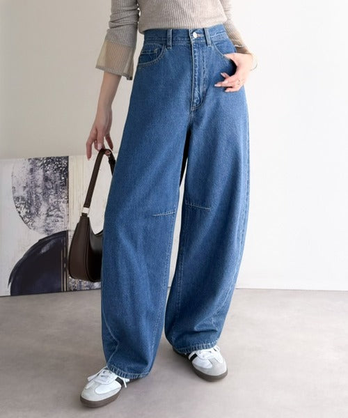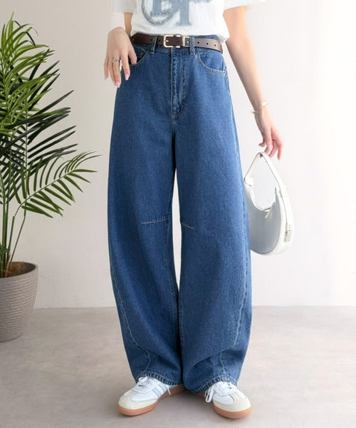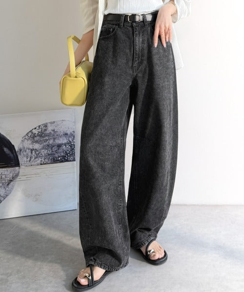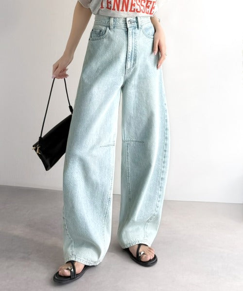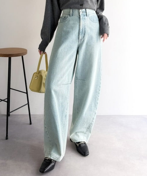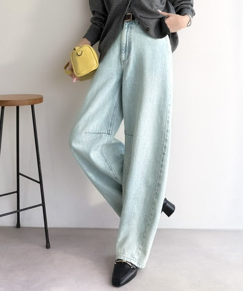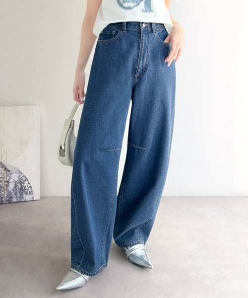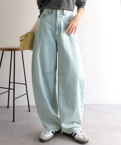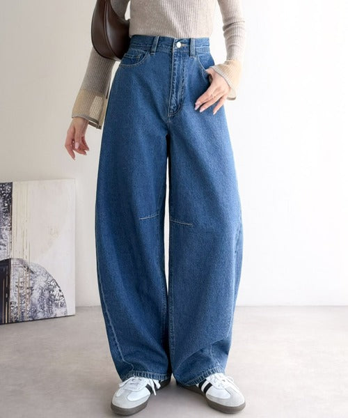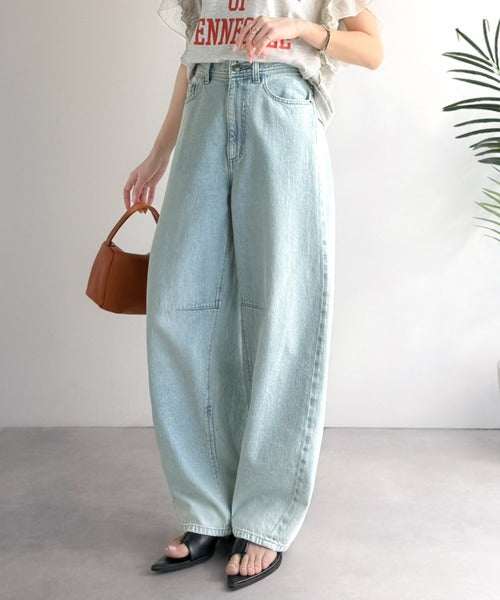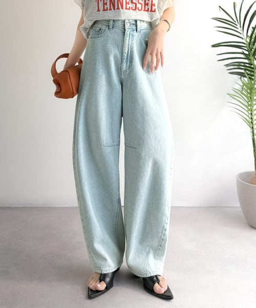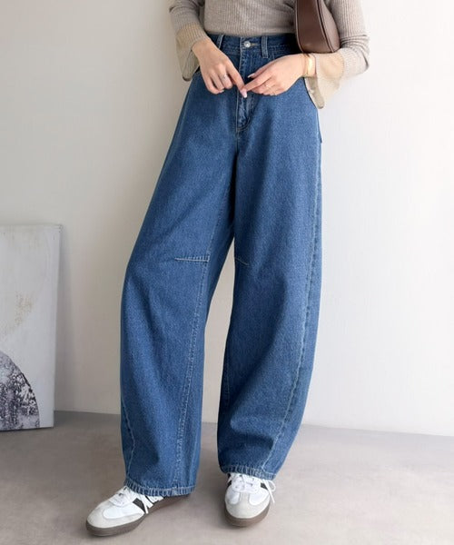 ウエストから膝に向かって緩やかなカーブラインを描き、膝下はすっきりと整えたバレルレッグデニム。