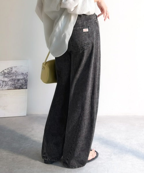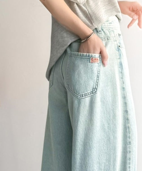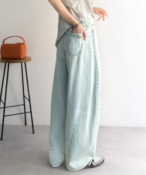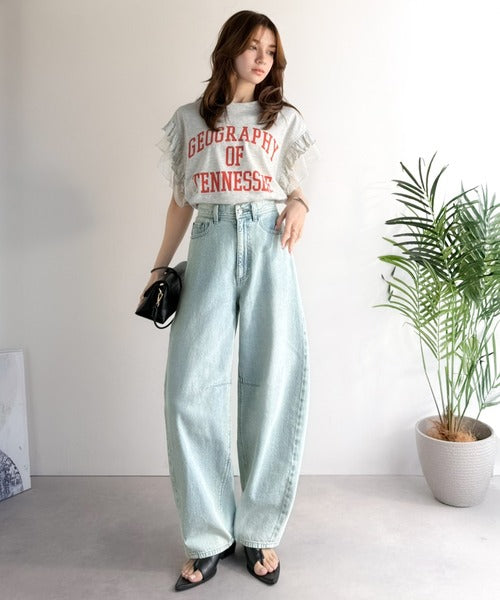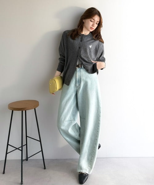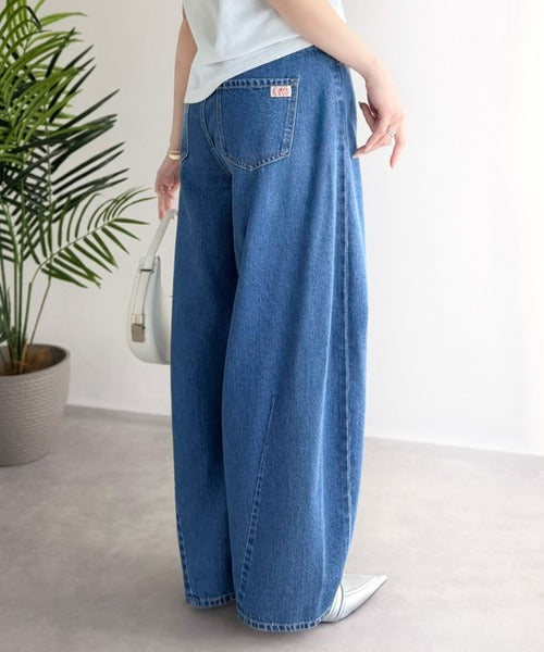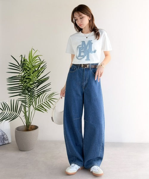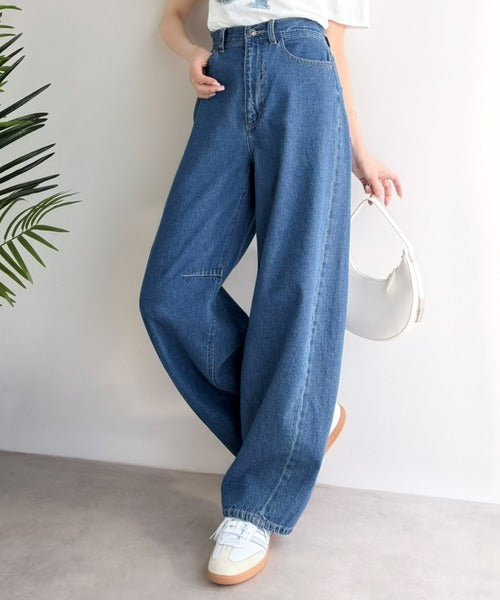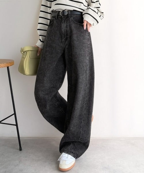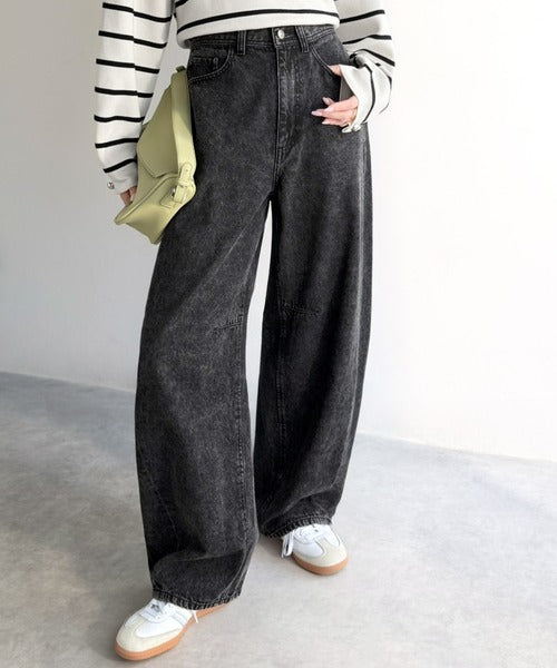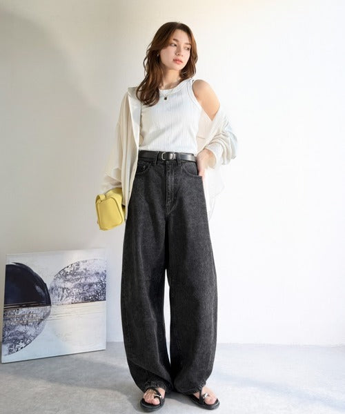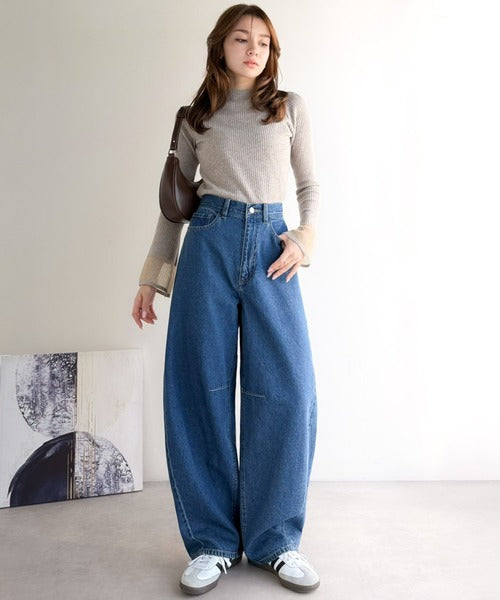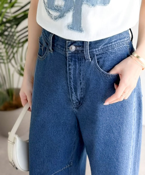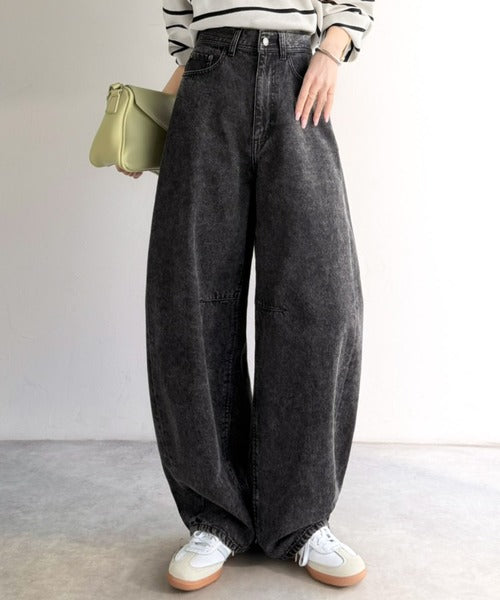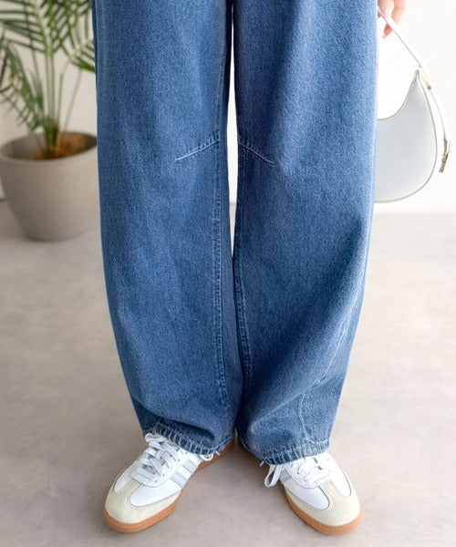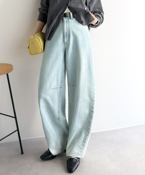 ウエストから膝に向かって緩やかなカーブラインを描き、膝下はすっきりと整えたバレルレッグデニム。