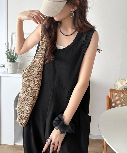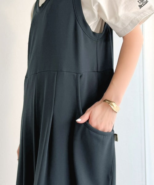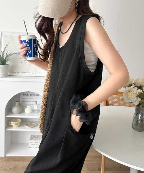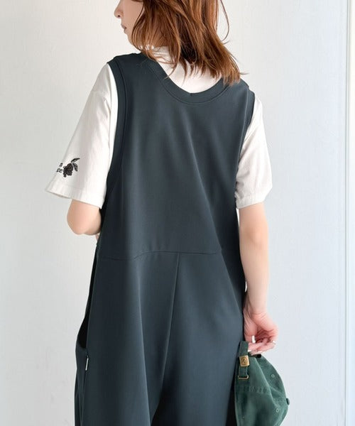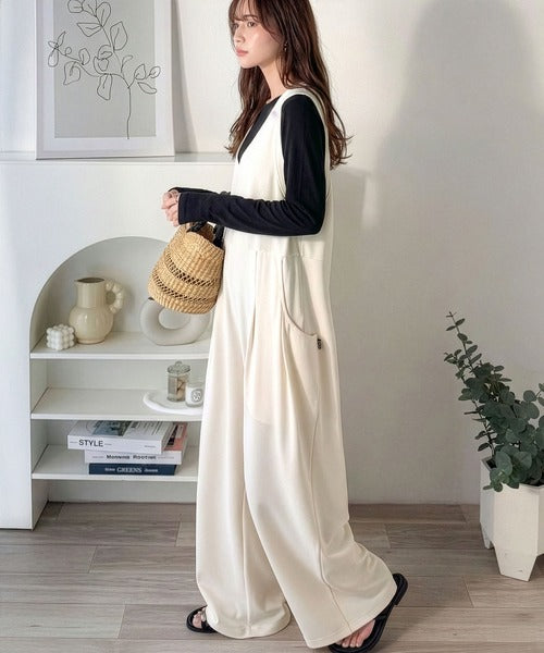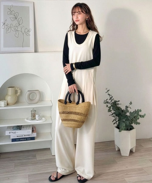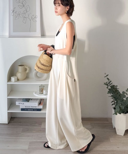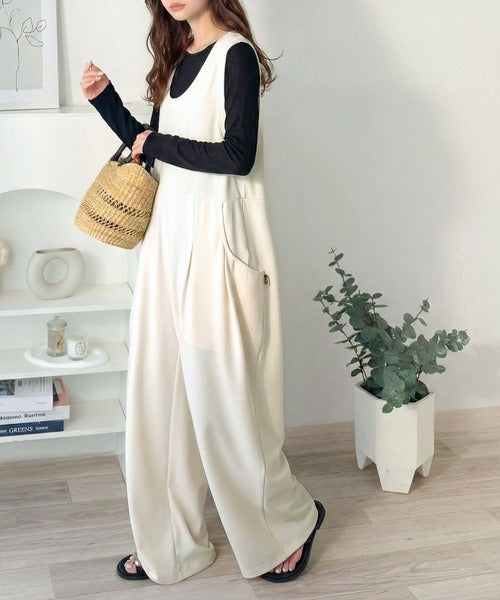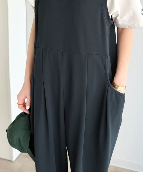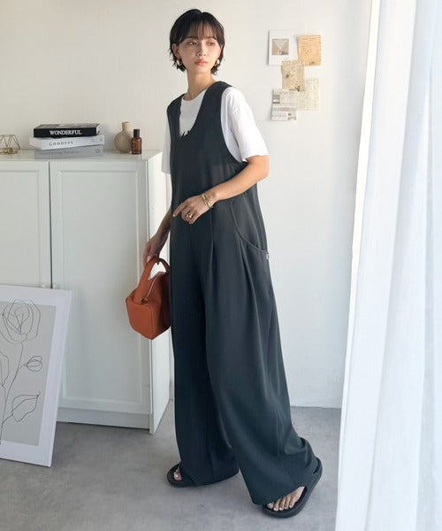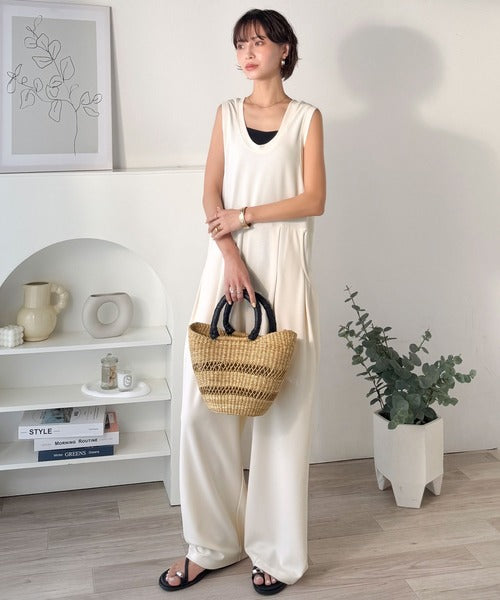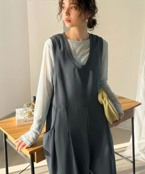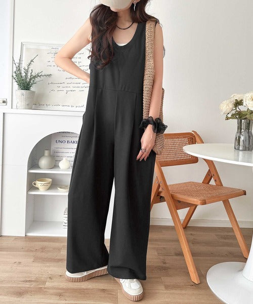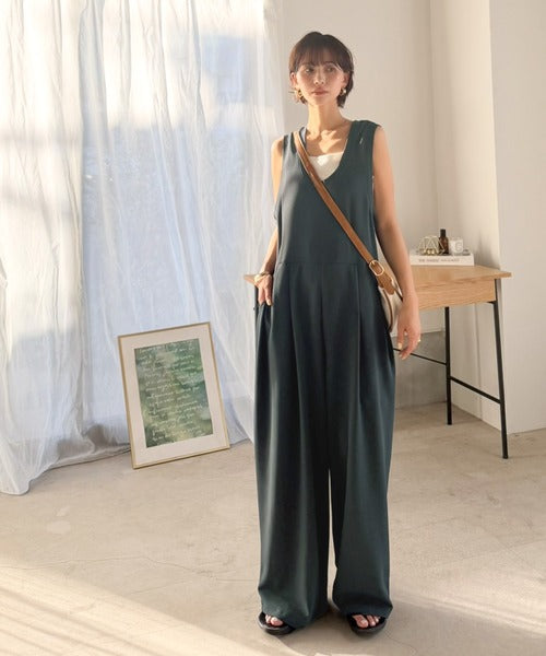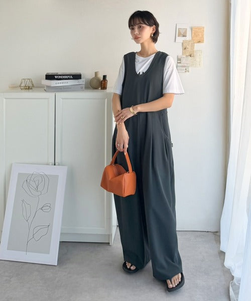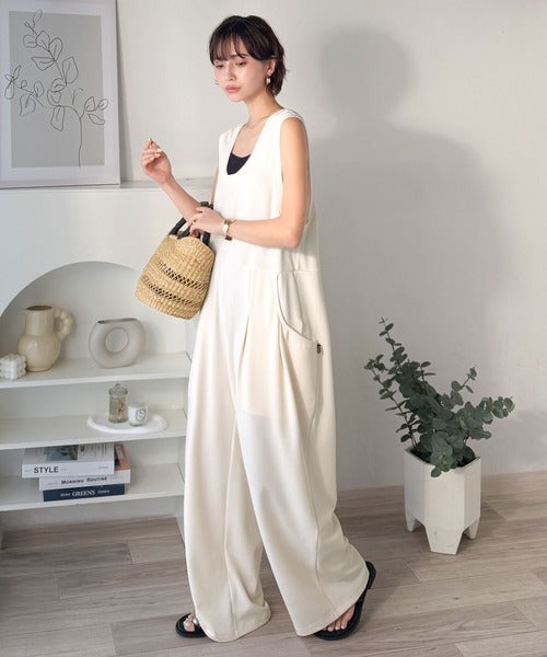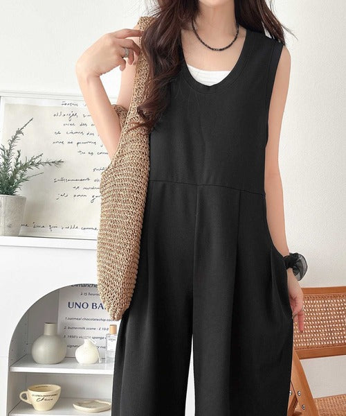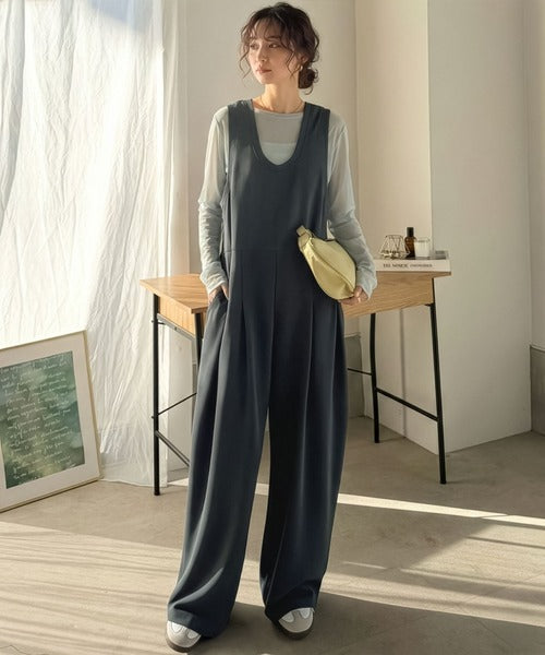 カジュアルすぎず大人が着やすい、すっきりとしたUネックのオールインワン。