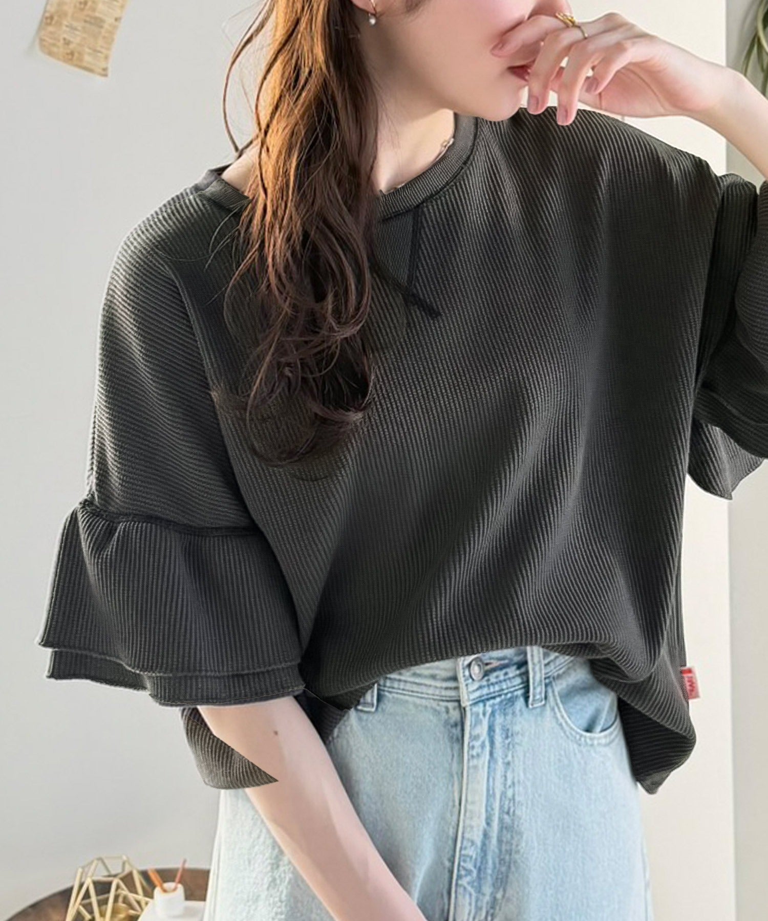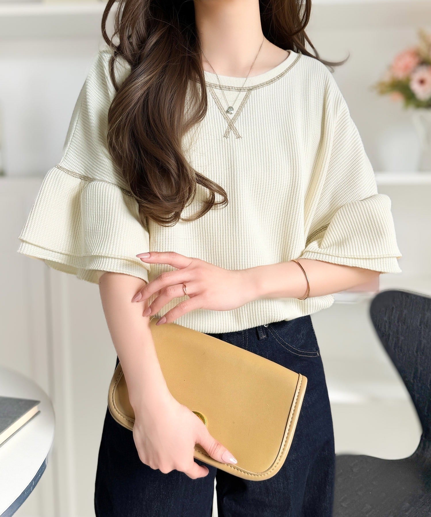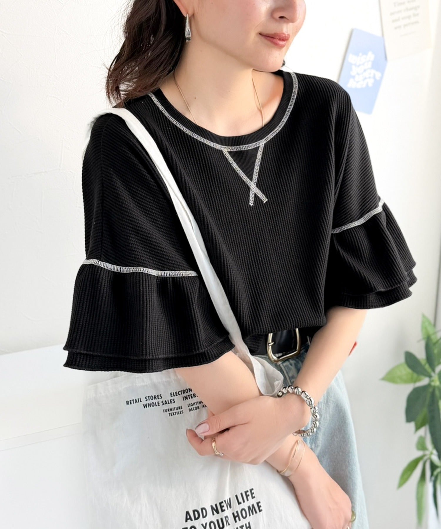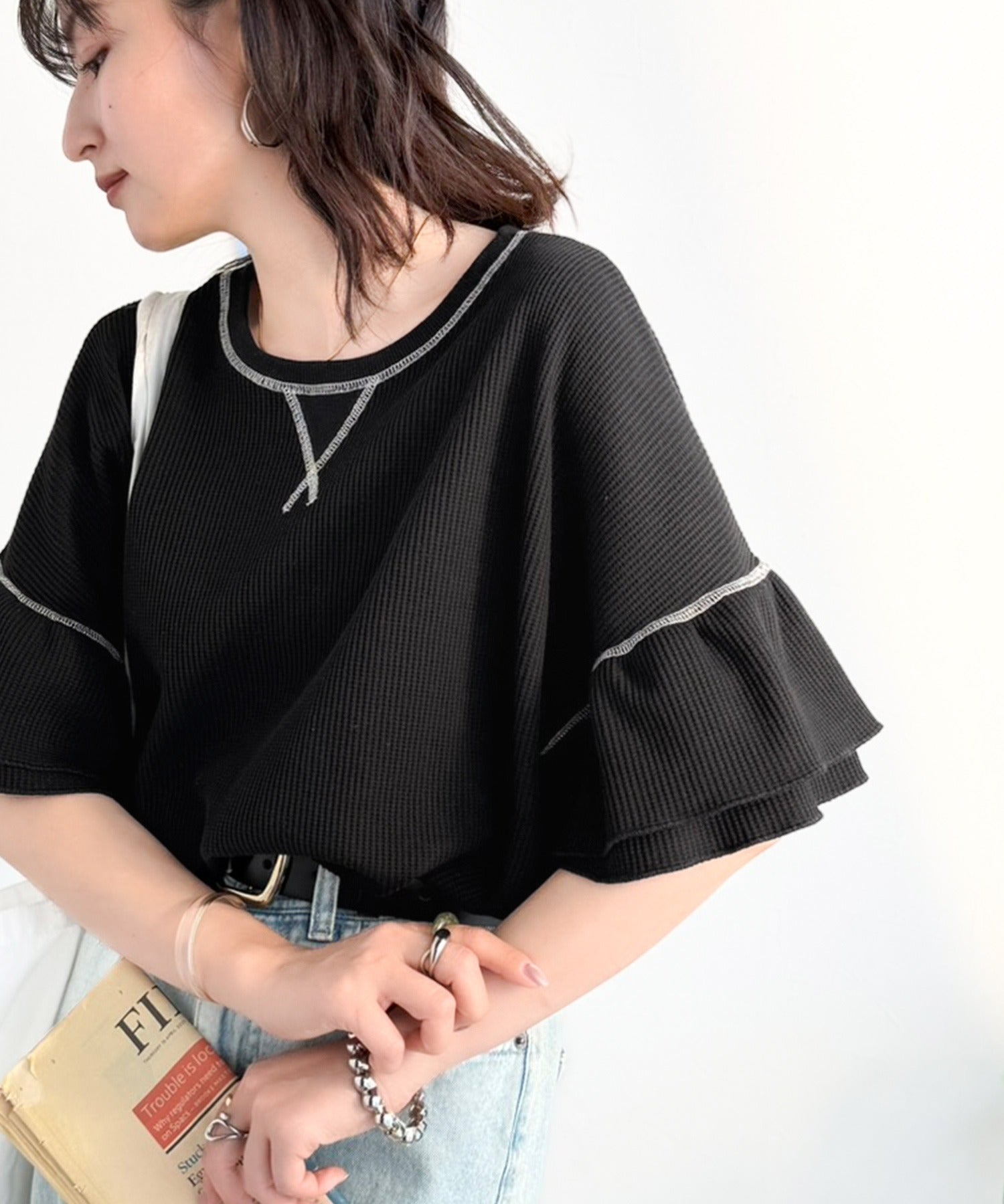 甘くなりすぎないダブルフリル袖が可愛いトップス。