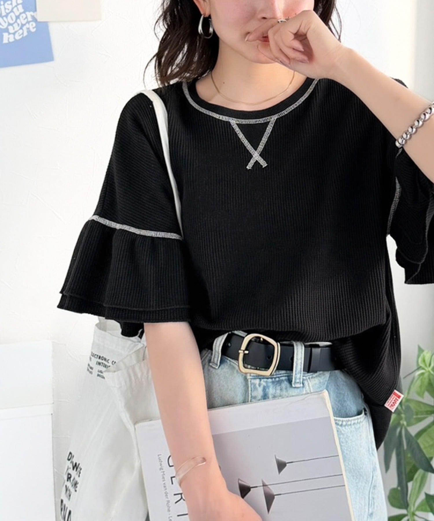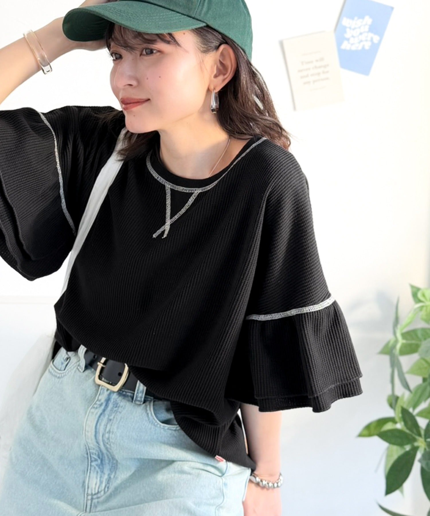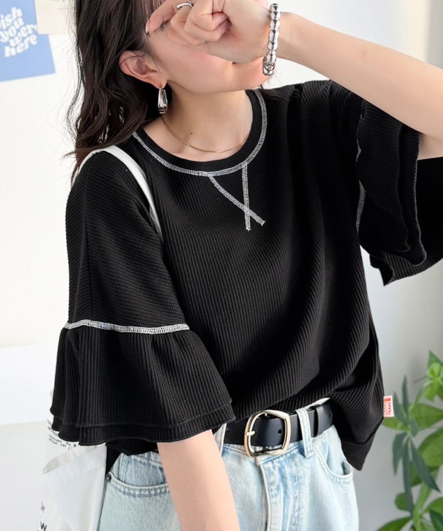 甘くなりすぎないダブルフリル袖が可愛いトップス。