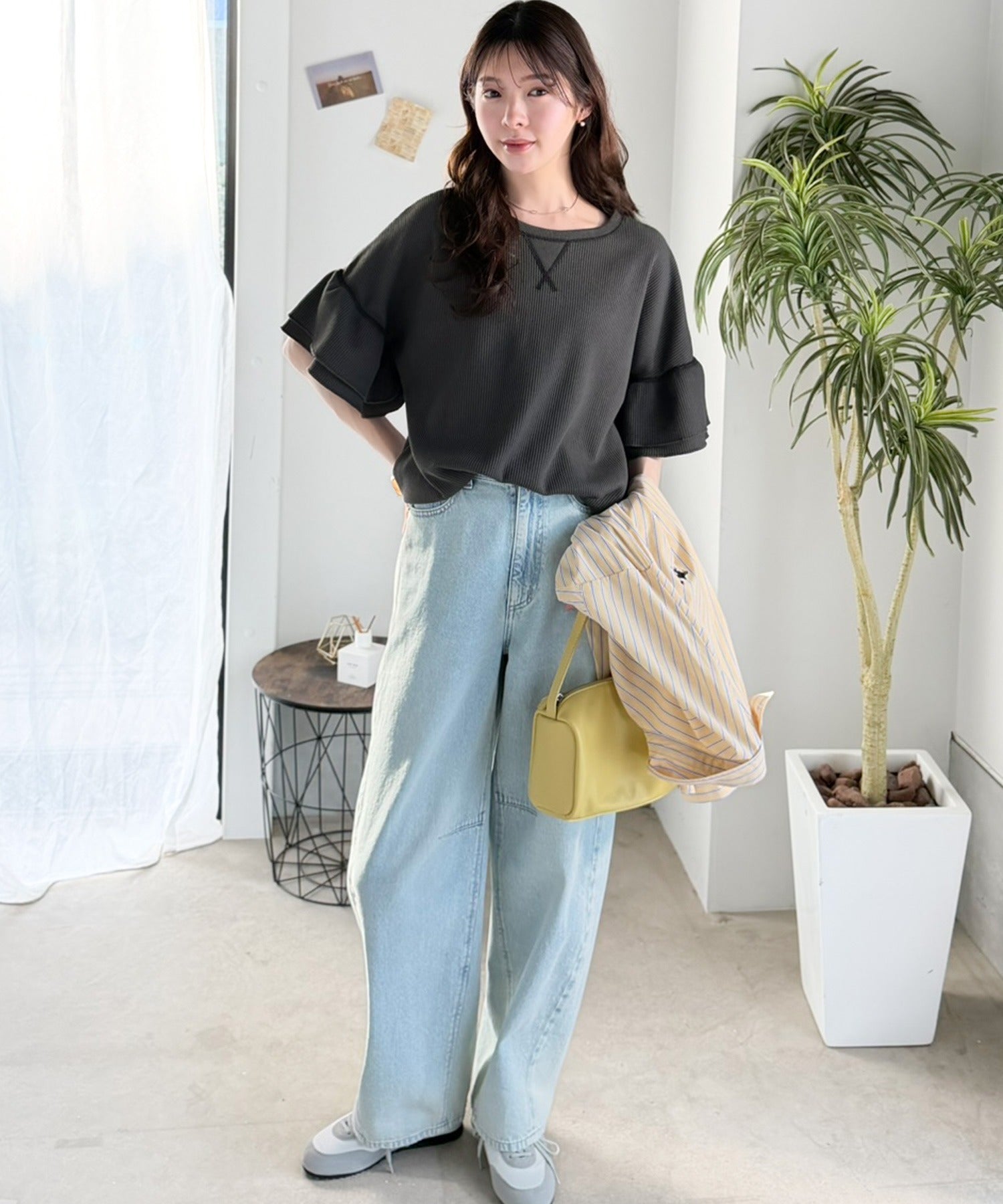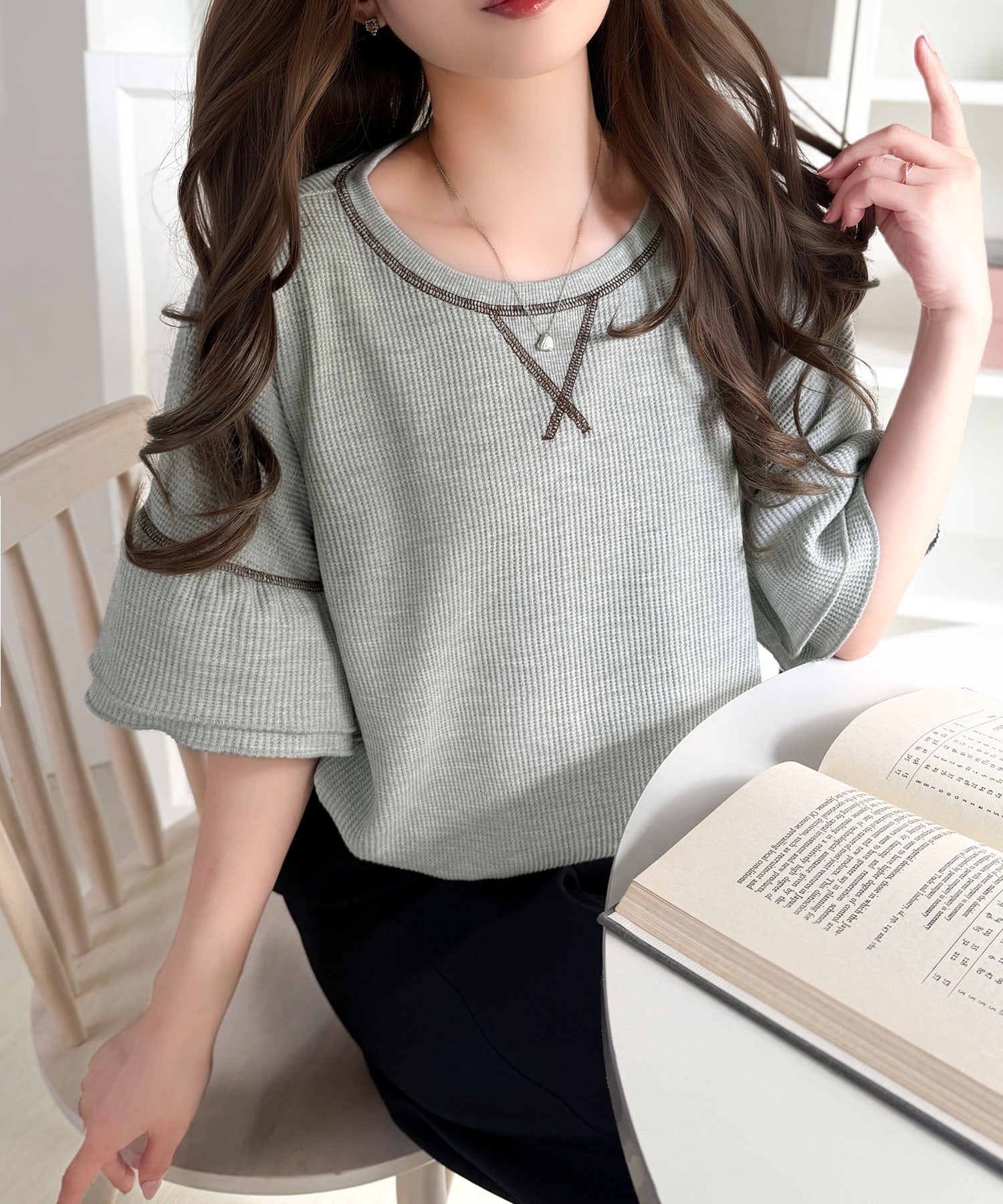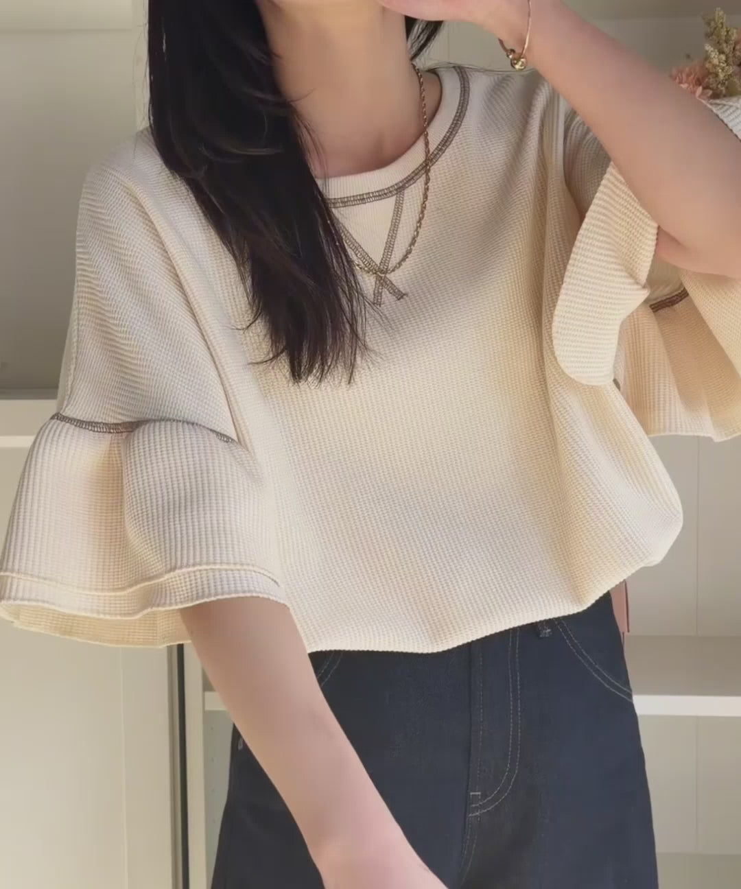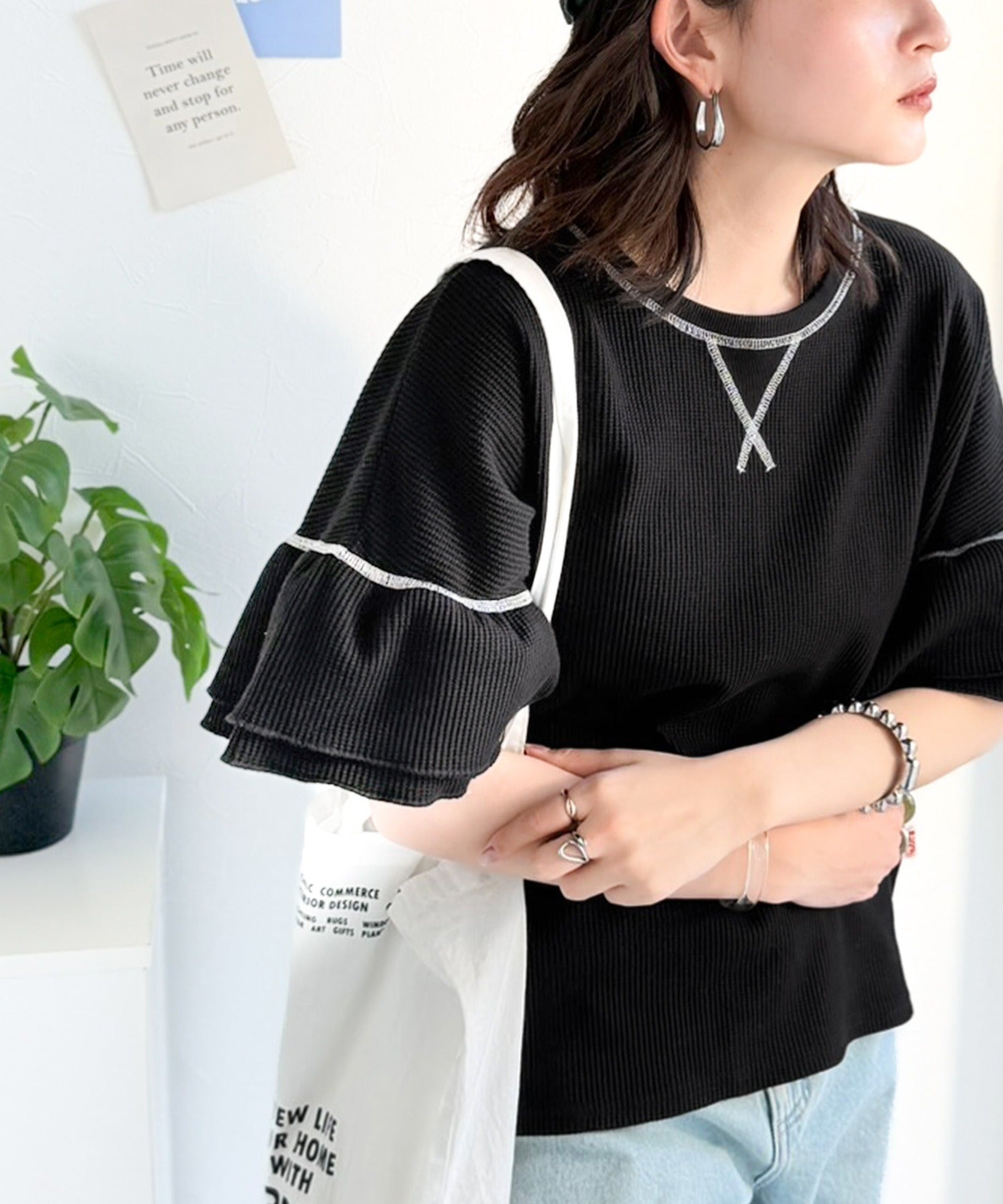 甘くなりすぎないダブルフリル袖が可愛いトップス。