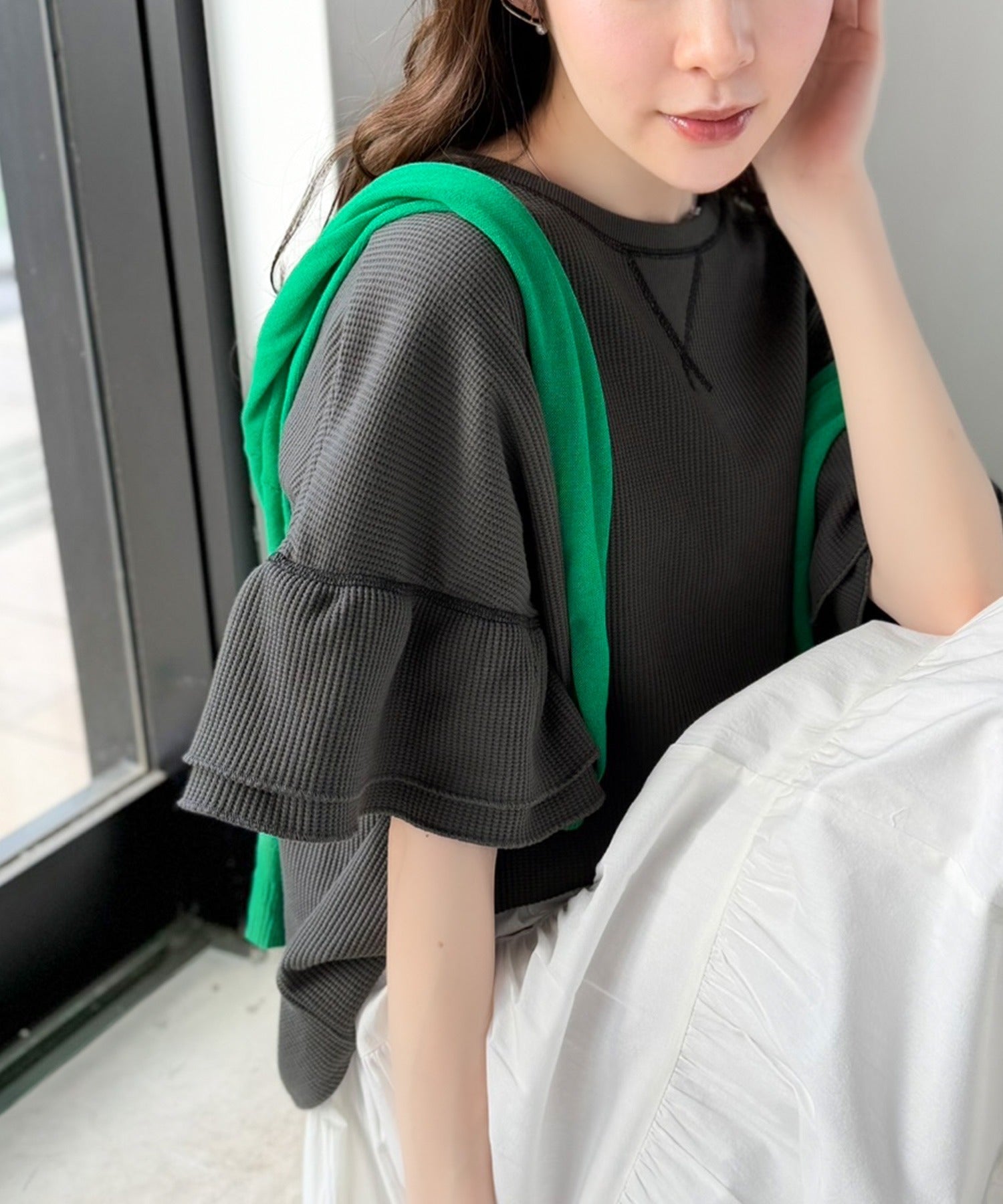 袖のダブルフリルが二の腕をカバーしつつ、