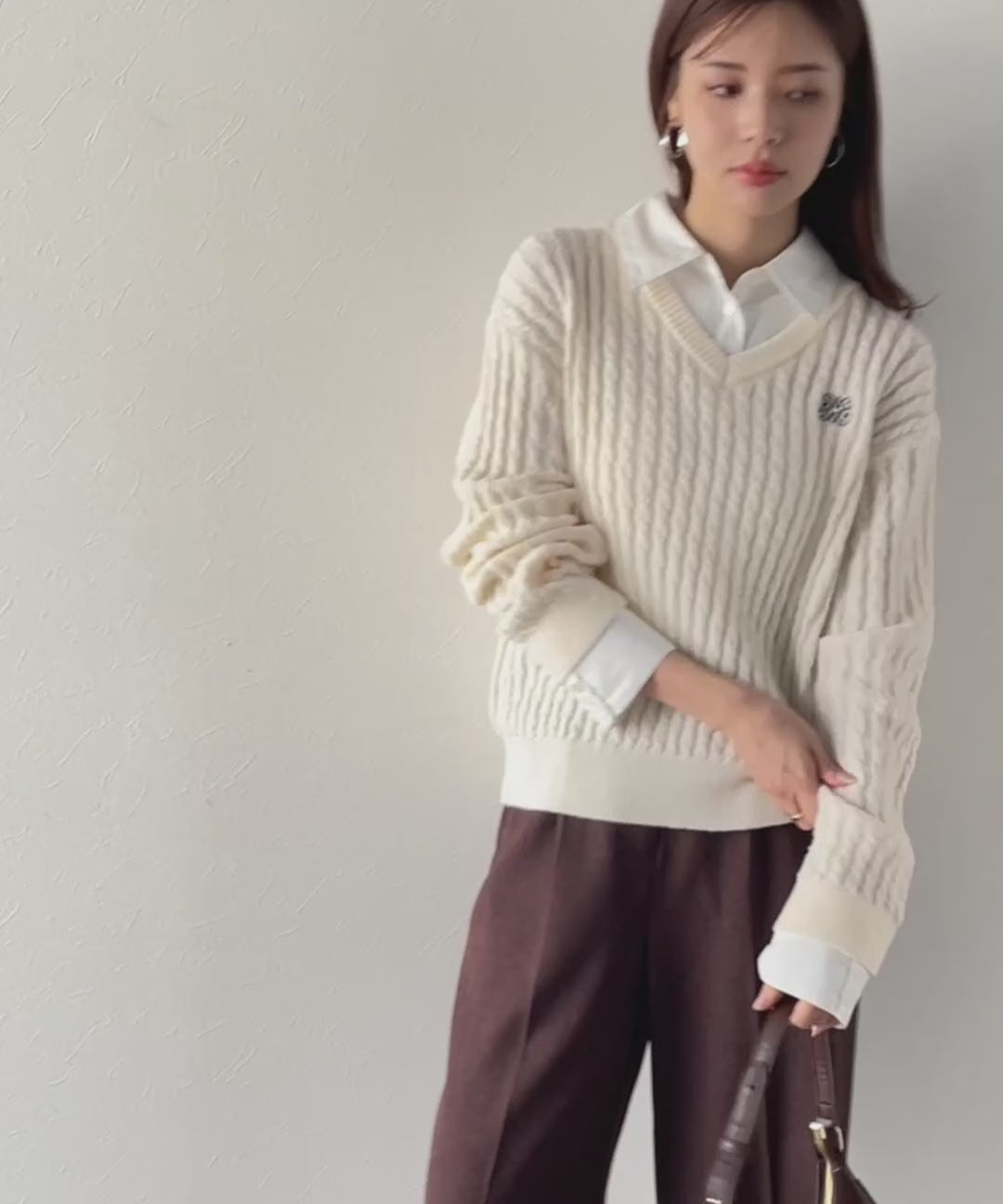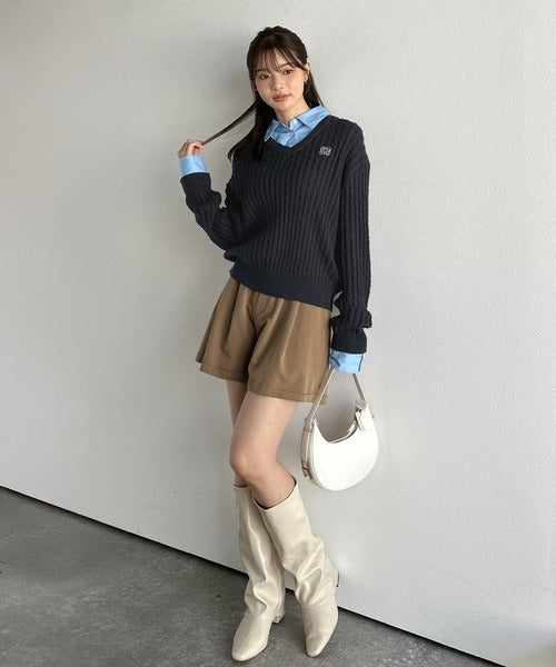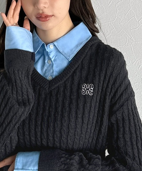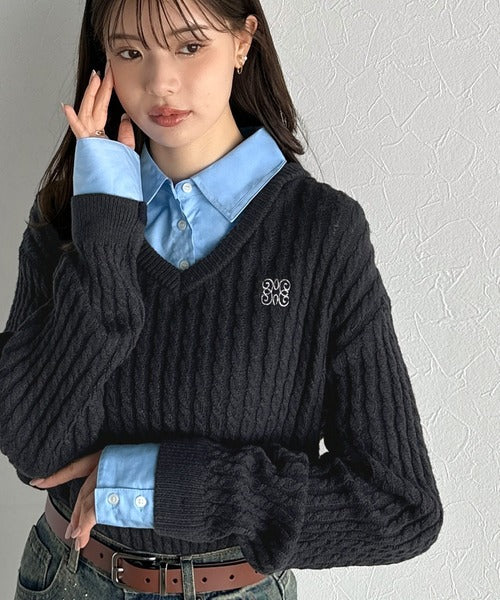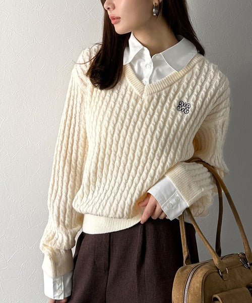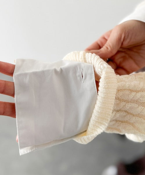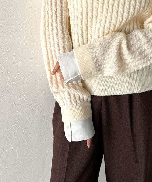 レイヤード風デザインのケーブルニットプルオーバー。襟と袖カフスは取り外し可能で、