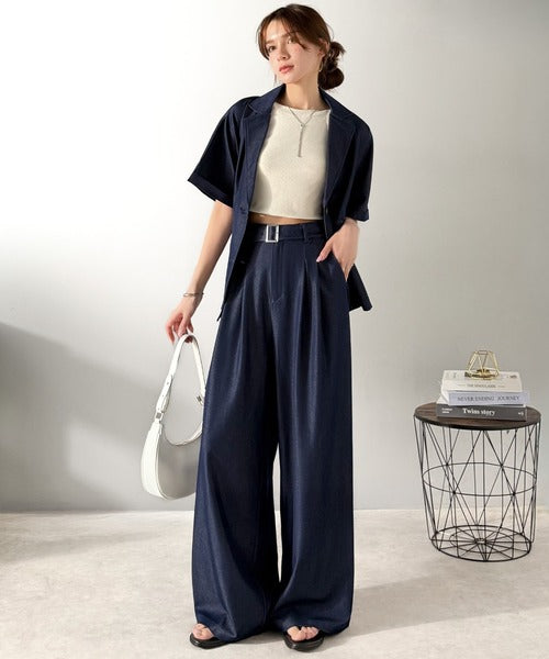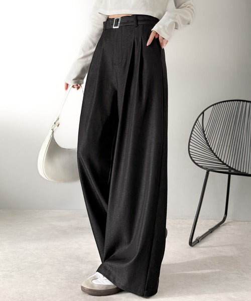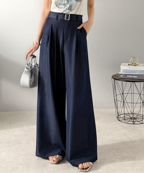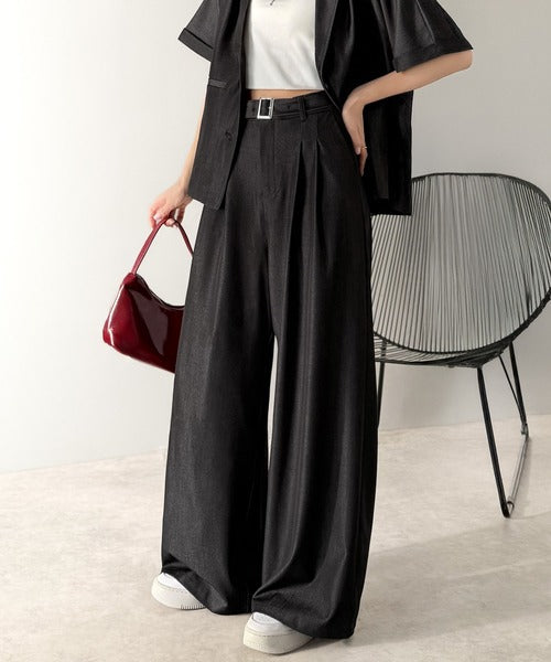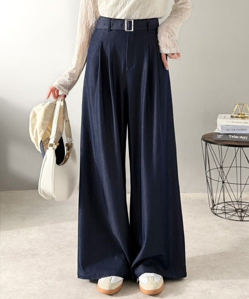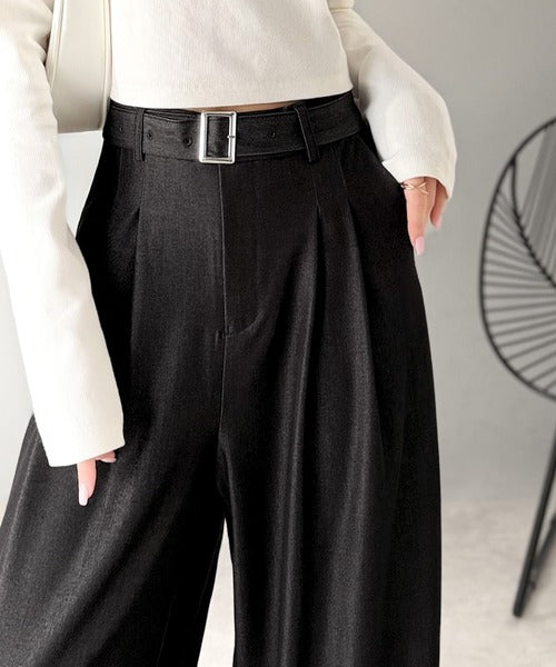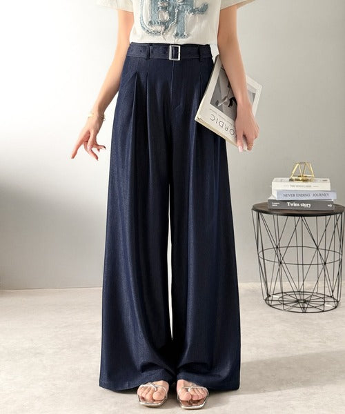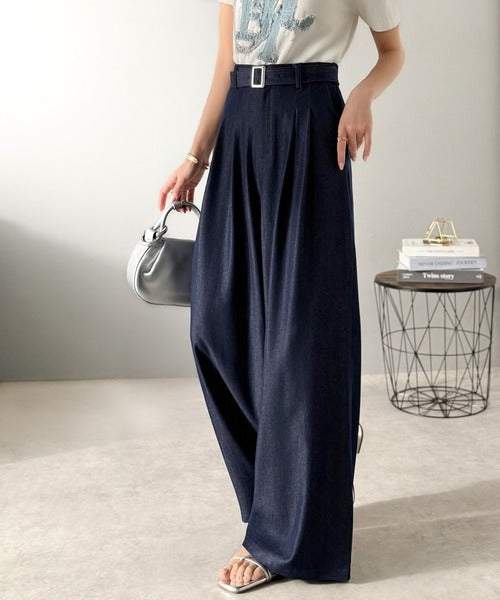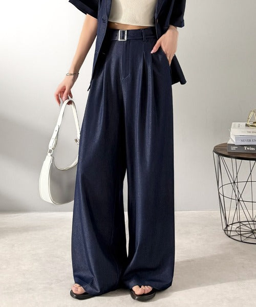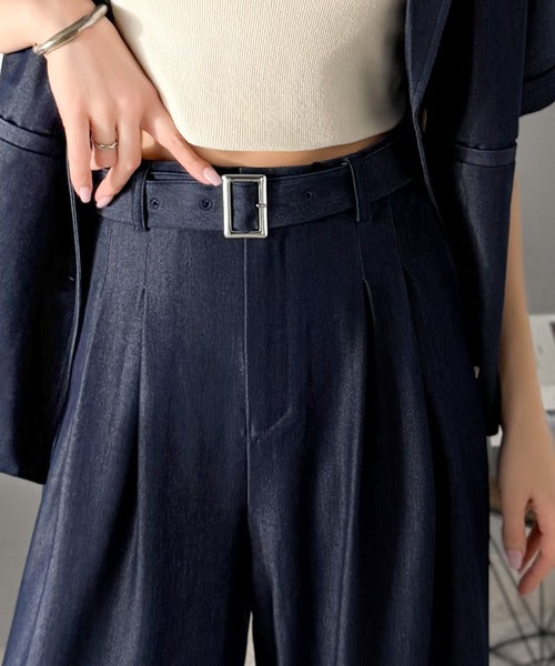 【mily bilet】【速乾機能・接触冷感機能付き】ほのかな光沢と落ち感で美脚見え。ベルト付きハイウエストデニムスラックスパンツ(セットアップ可能) mi1329067
