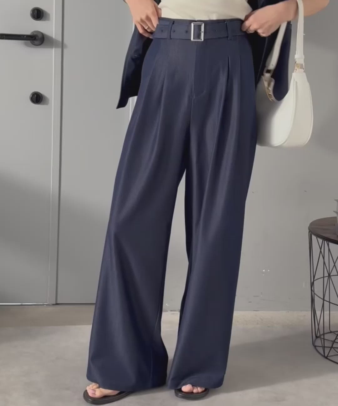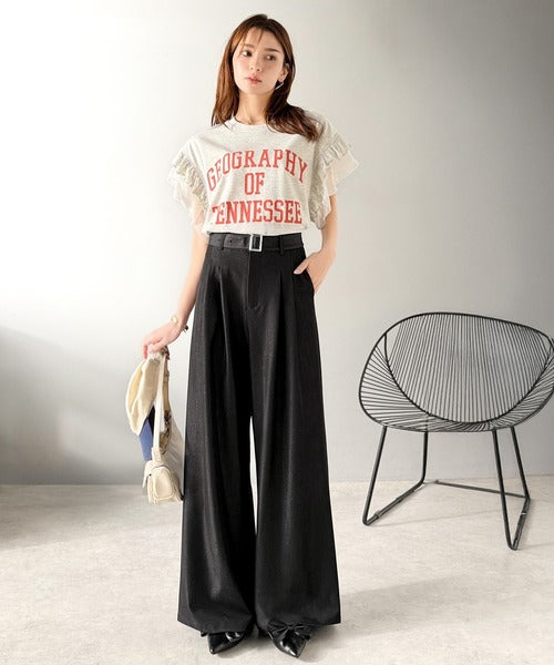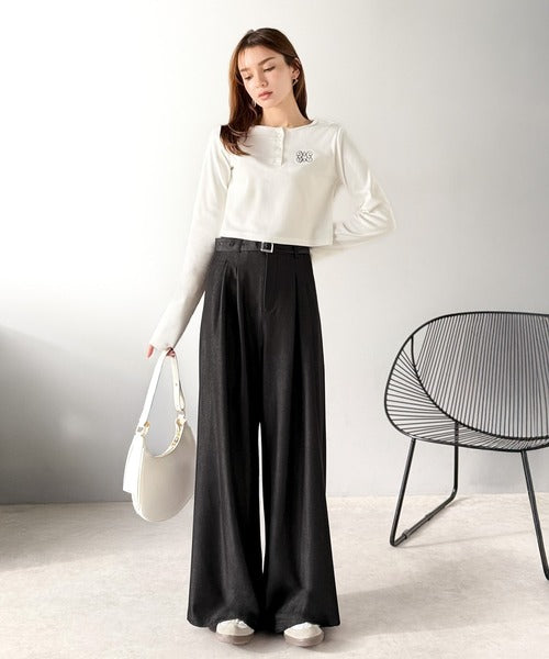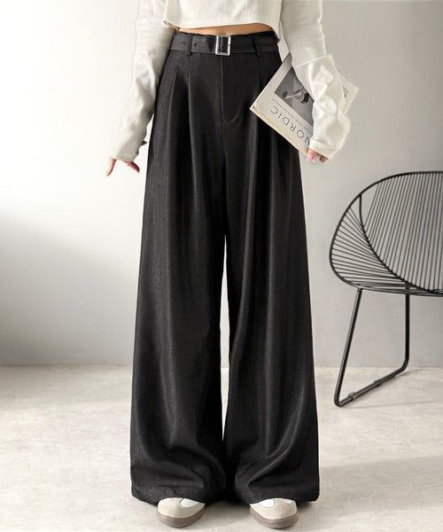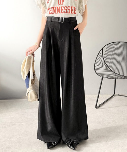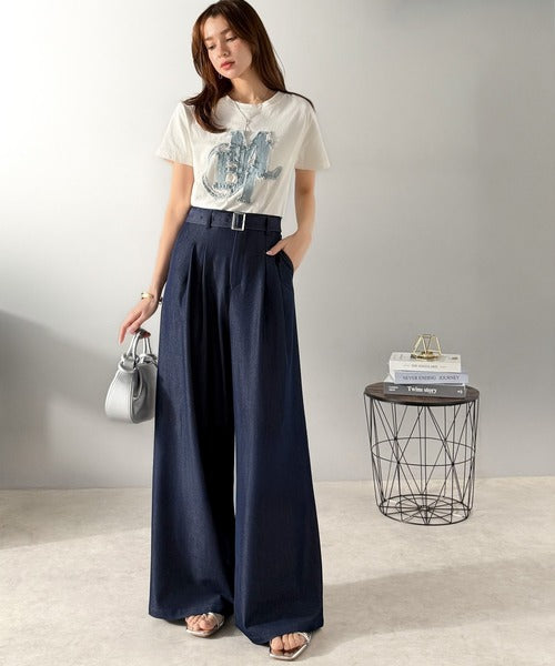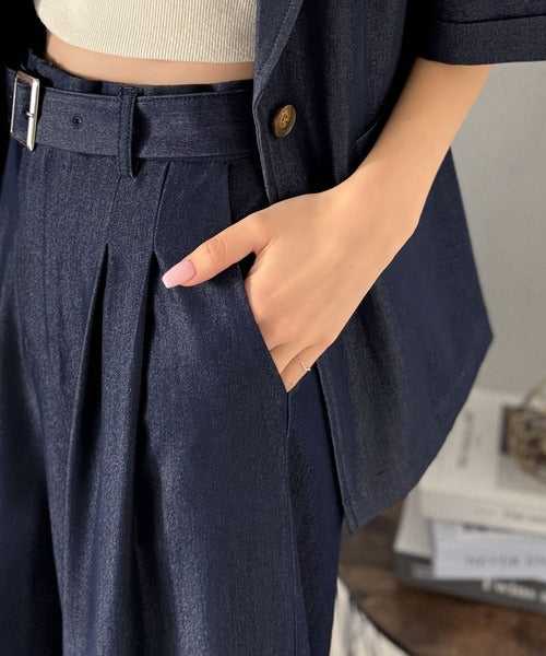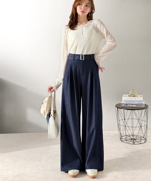 【mily bilet】【速乾機能・接触冷感機能付き】ほのかな光沢と落ち感で美脚見え。ベルト付きハイウエストデニムスラックスパンツ(セットアップ可能) mi1329067