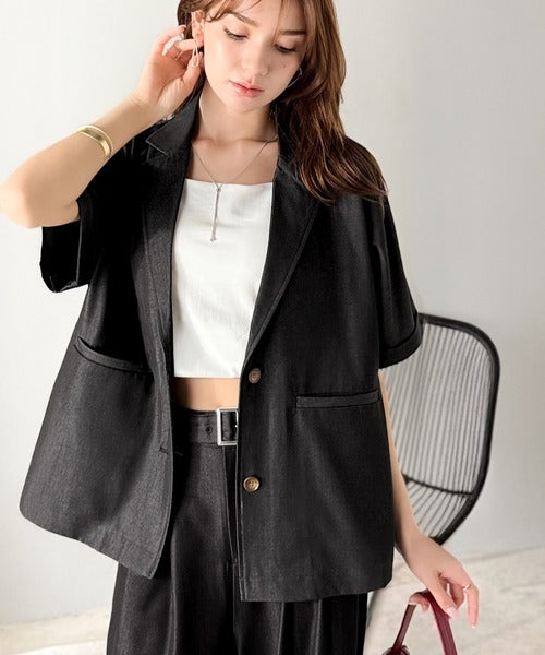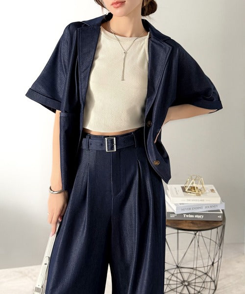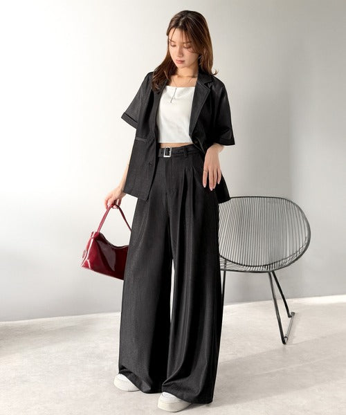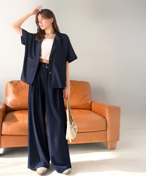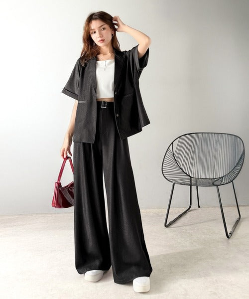 また、セットアップアイテムのジャケットと合わせればトレンド感あふれるコーディネートが完成!