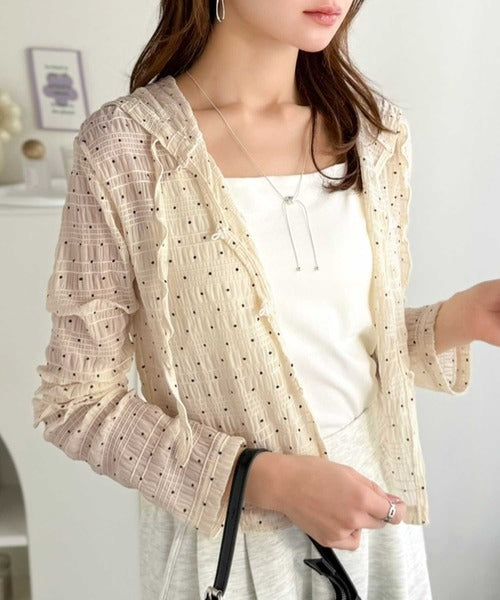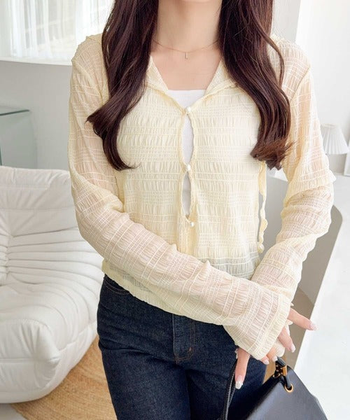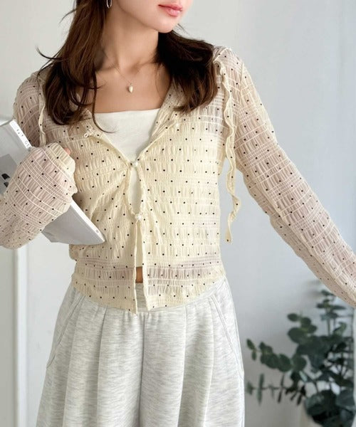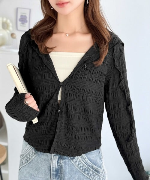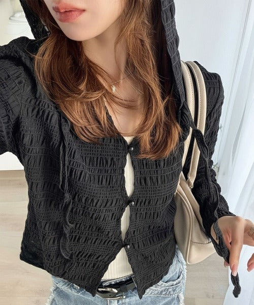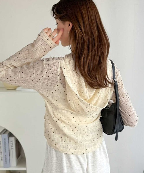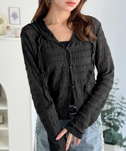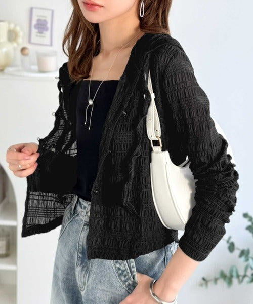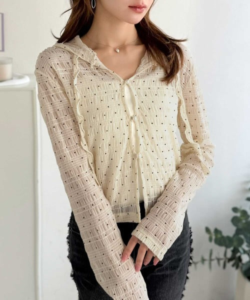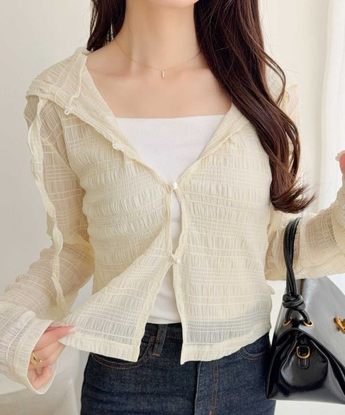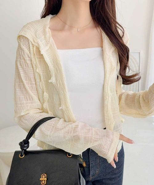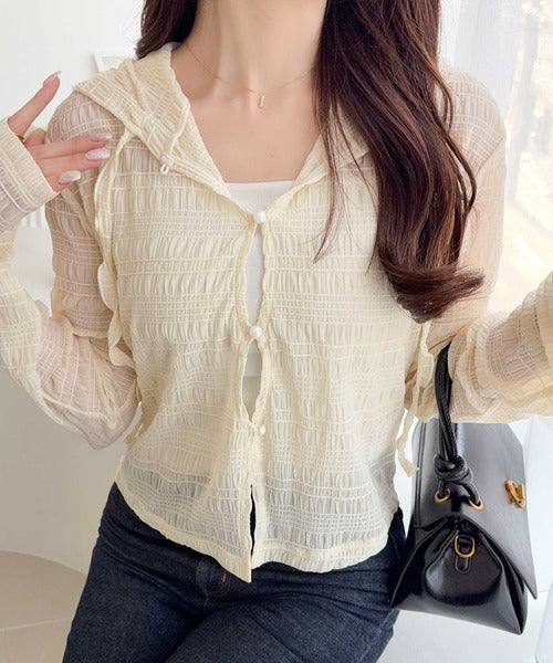 【mily bilet】カジュアルと清楚のドッキング。大人可愛い軽やかな一枚♪フード付き カーディガン風シアートップス mi1359046