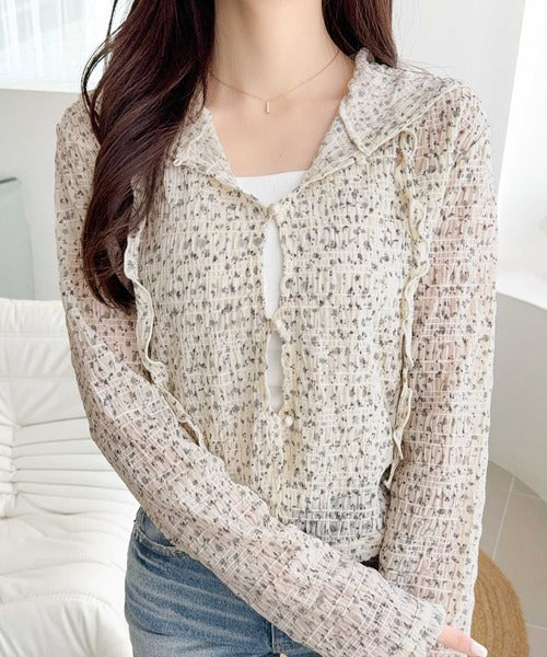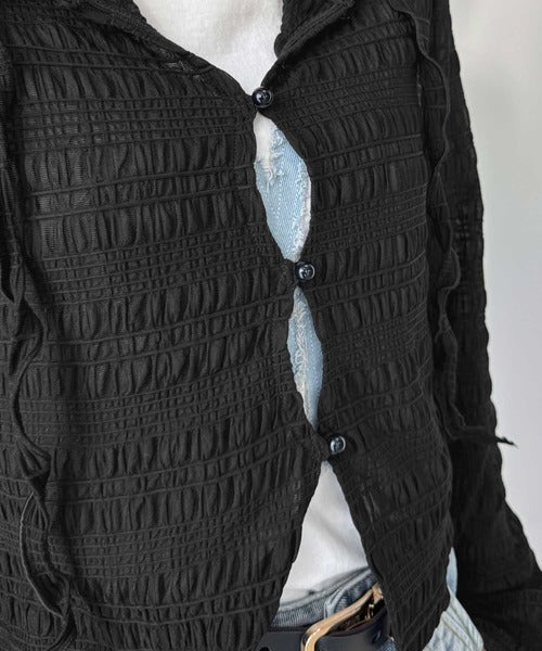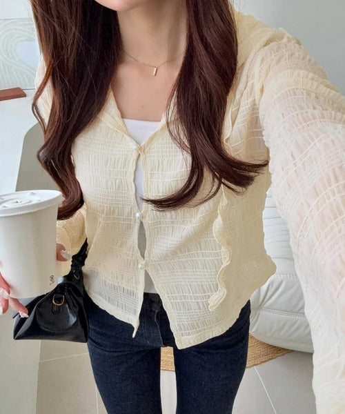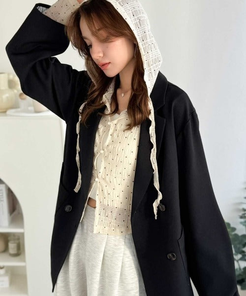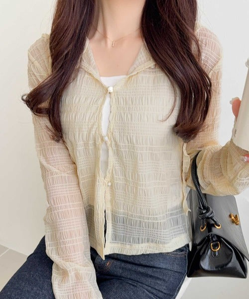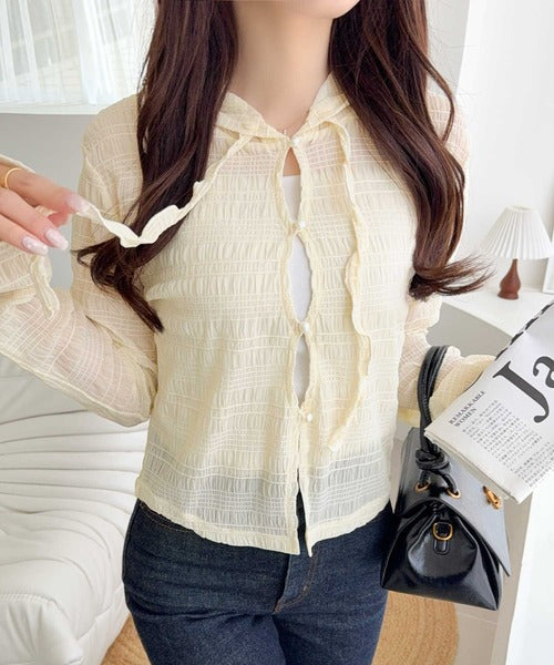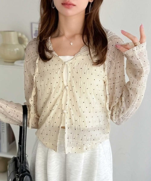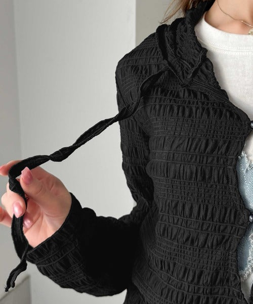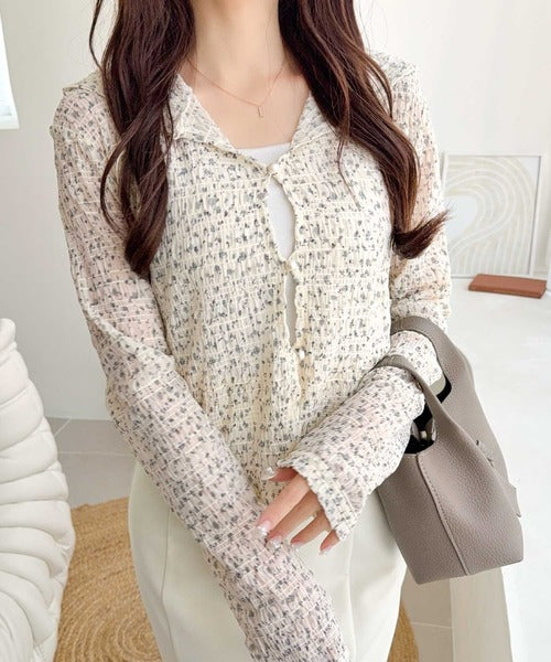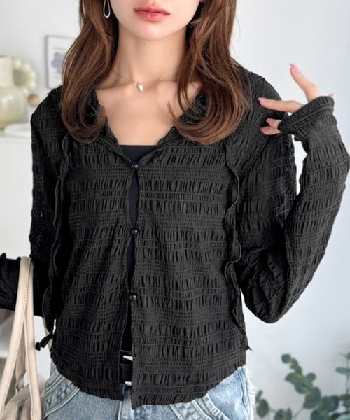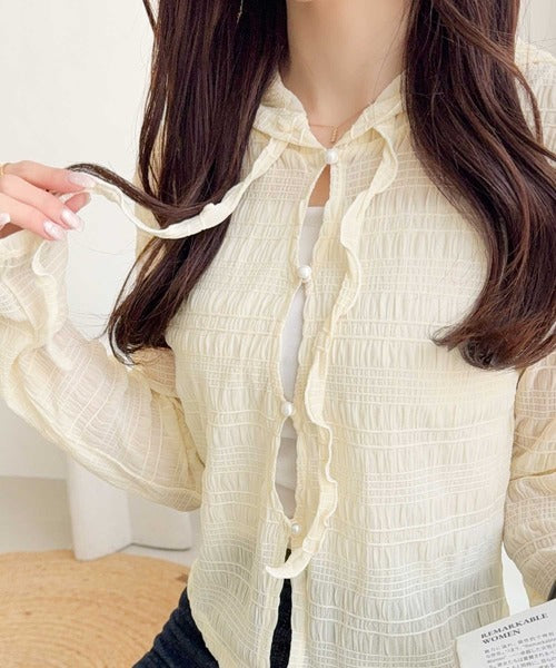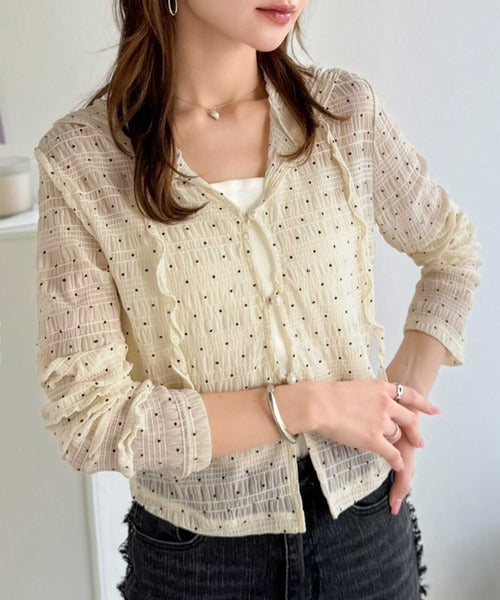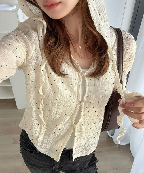 【mily bilet】カジュアルと清楚のドッキング。大人可愛い軽やかな一枚♪フード付き カーディガン風シアートップス mi1359046
