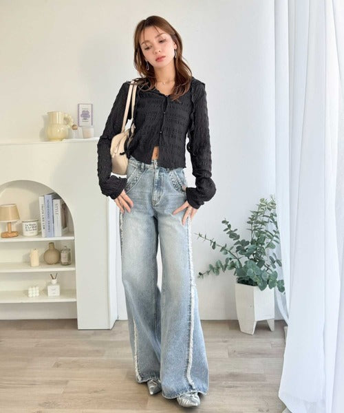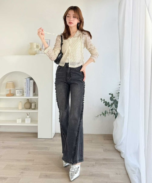 デニムやワイドパンツなどのカジュアルなアイテムと合わせれば甘すぎないスタイルに仕上がります。