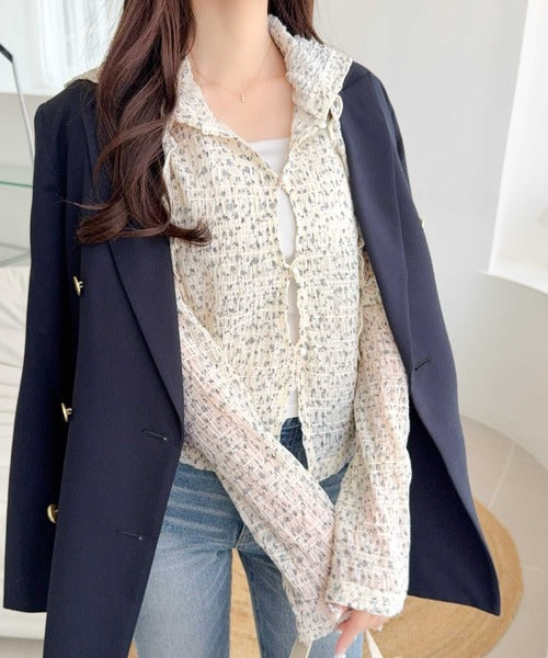 パール釦とメロー紐で、さりげなく甘さをひとさじ。