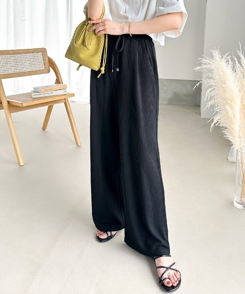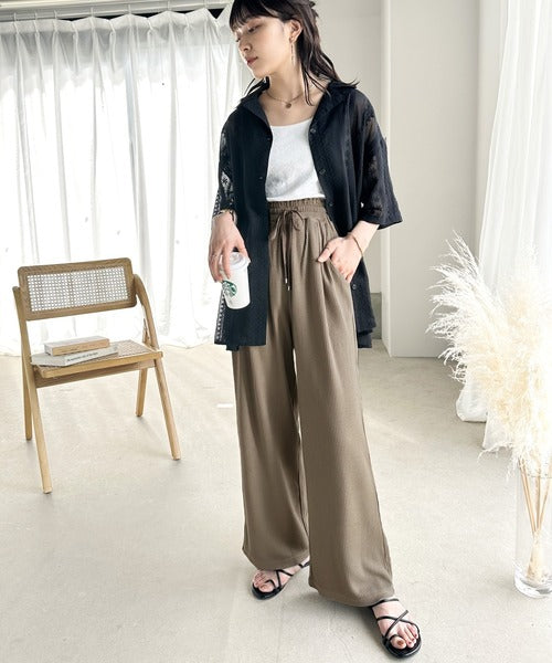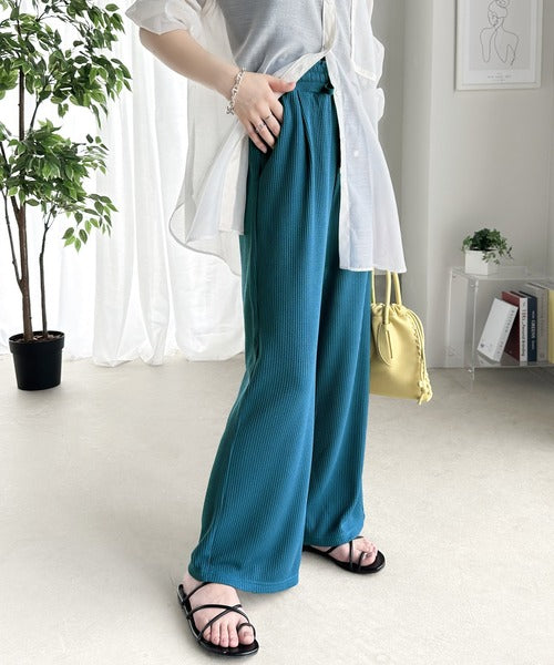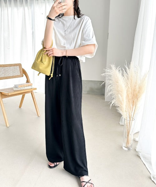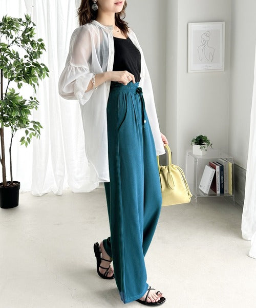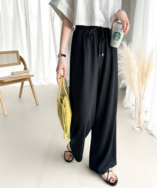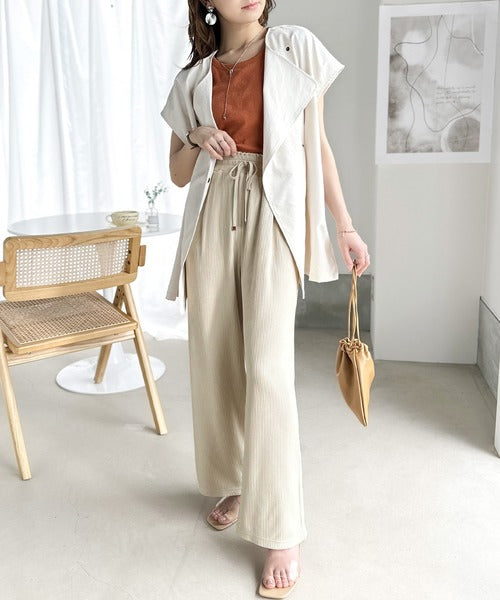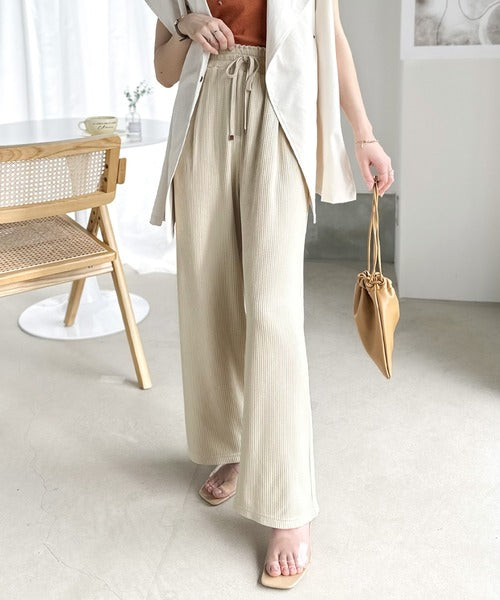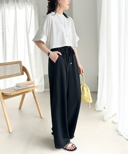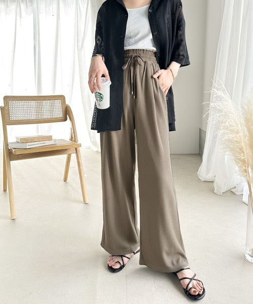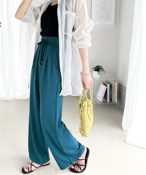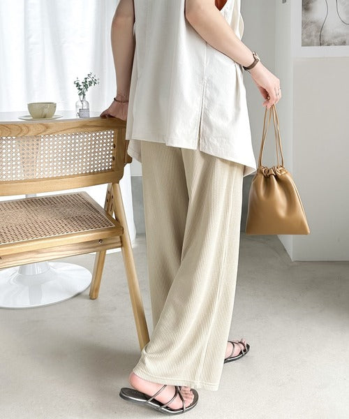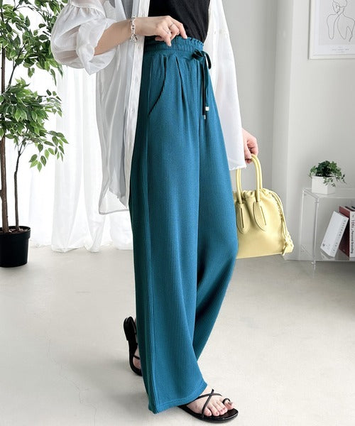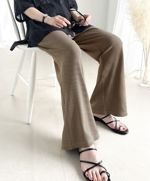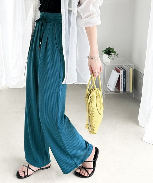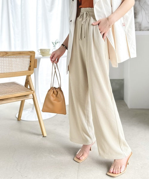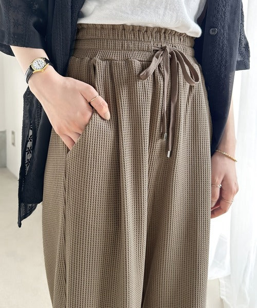 柔らかなワッフル素材を使用したラクチンワイドパンツ。