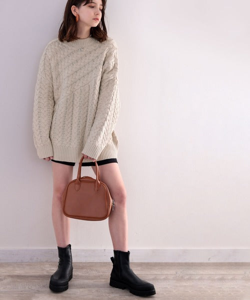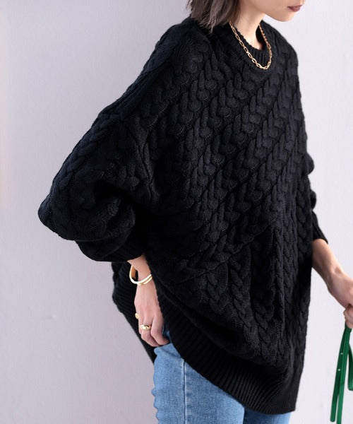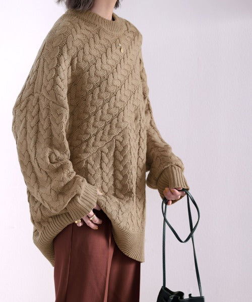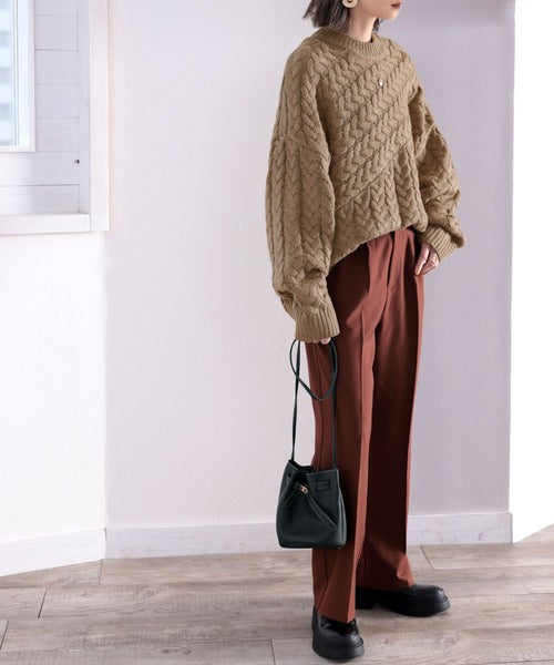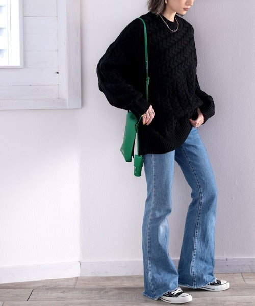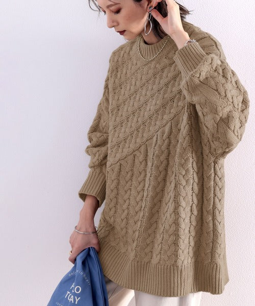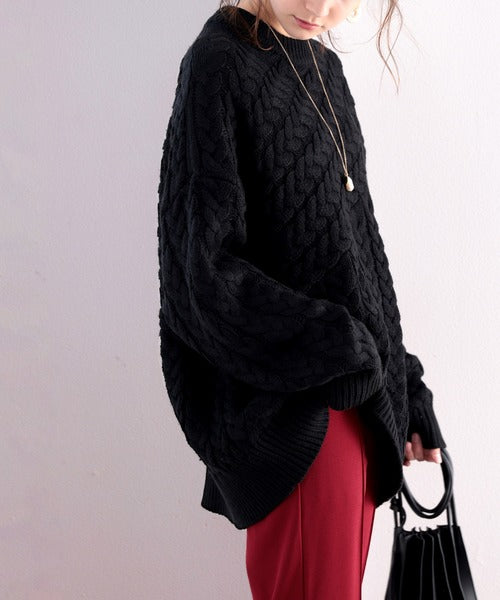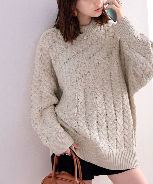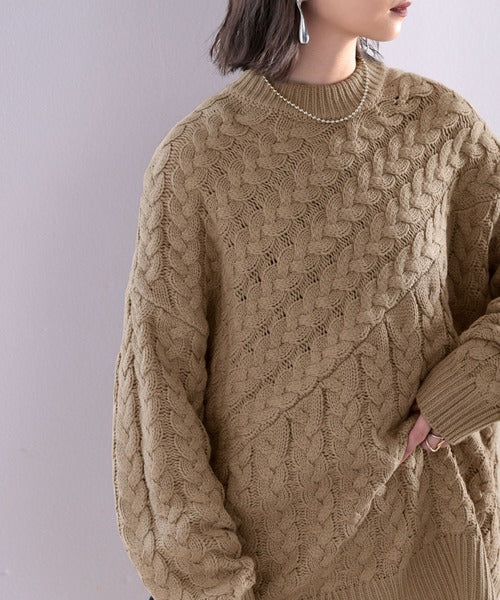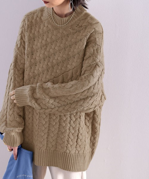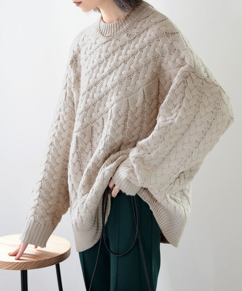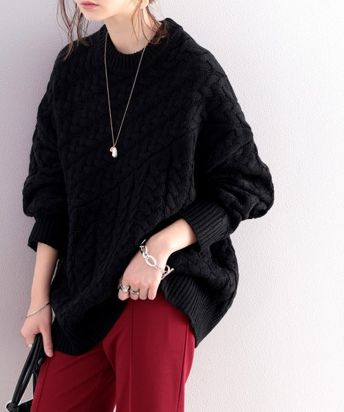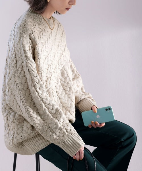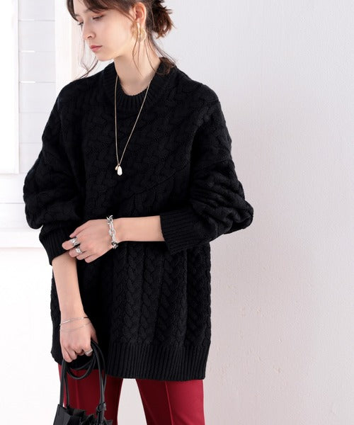 ほどよいボリュームのケーブル柄は一枚でオシャレ見えする万能ニット。
