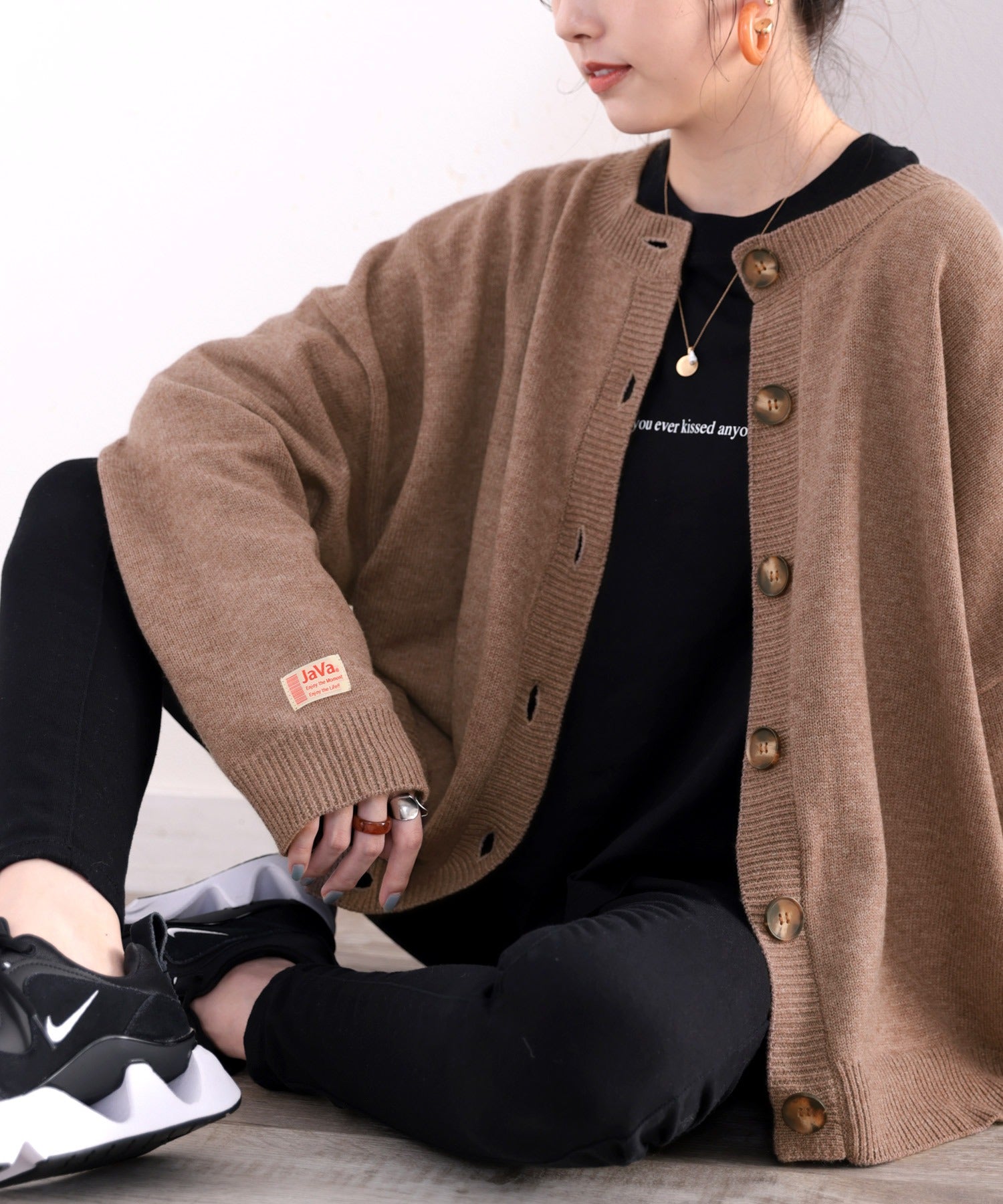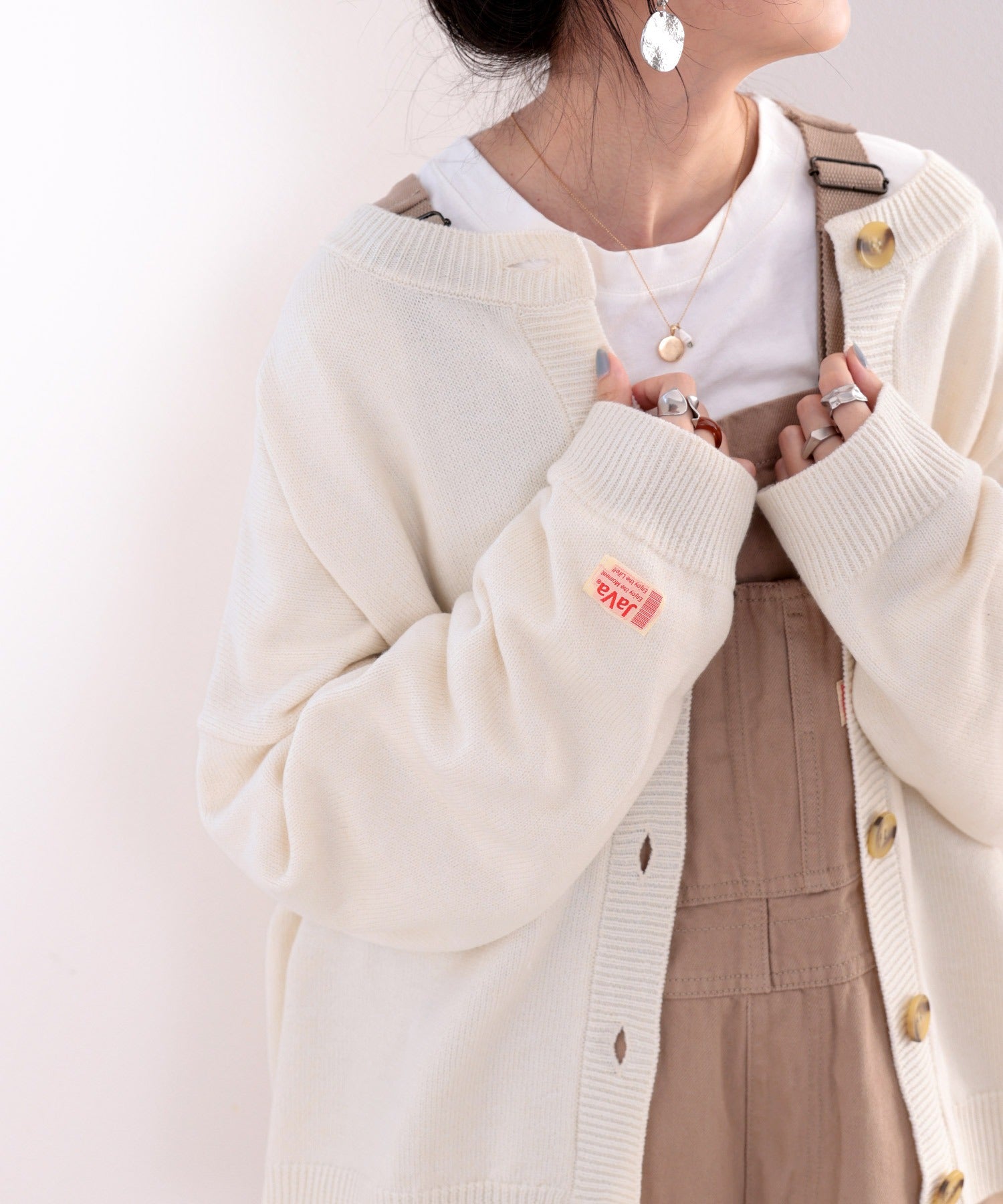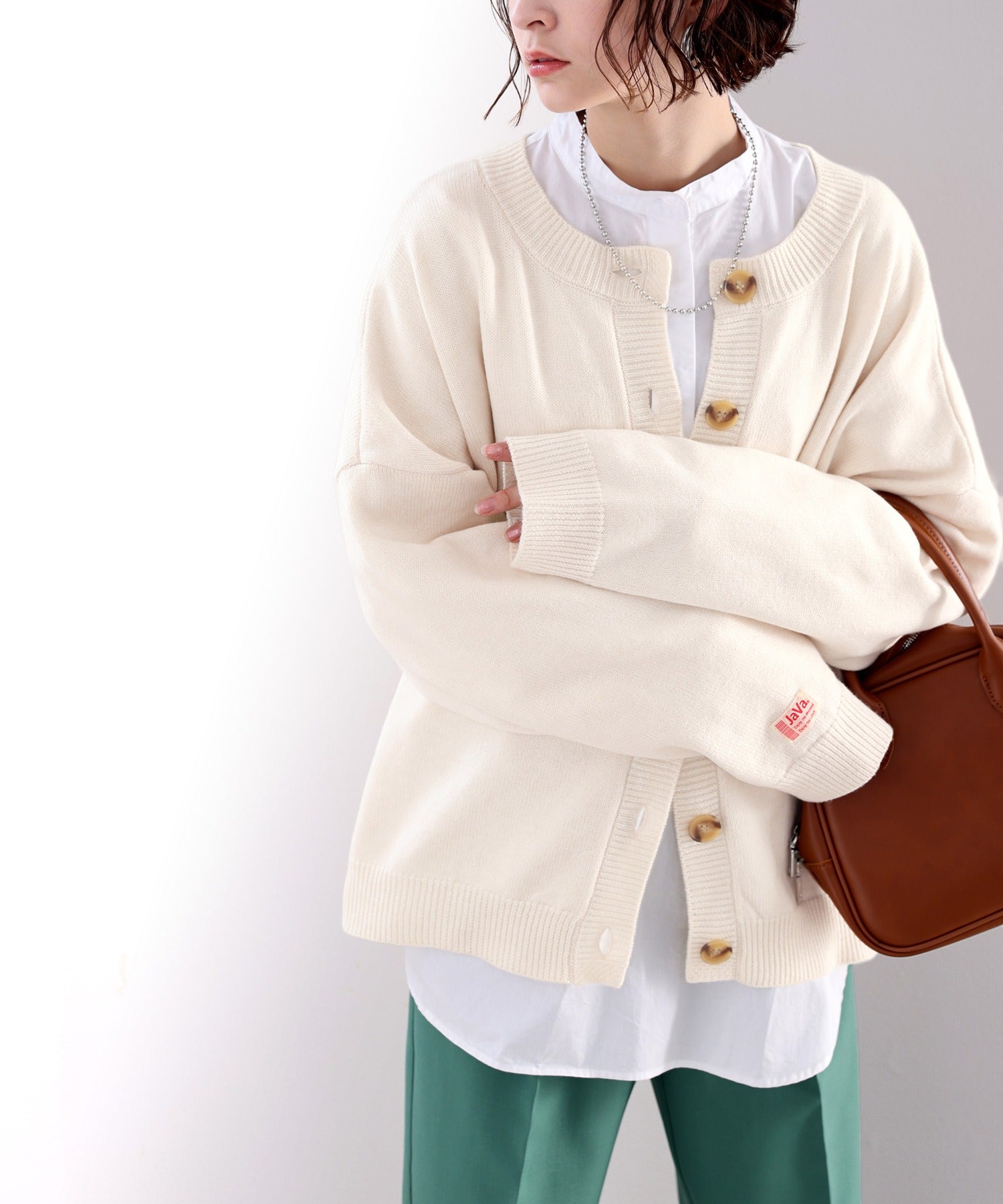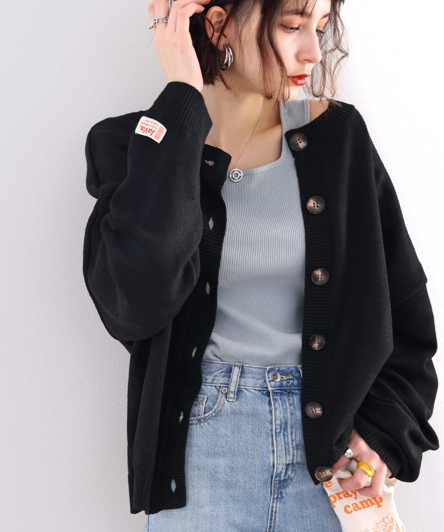 袖のJaVaタグがさり気ない、お洒落なボタンデザインの2WAYカーディガン。