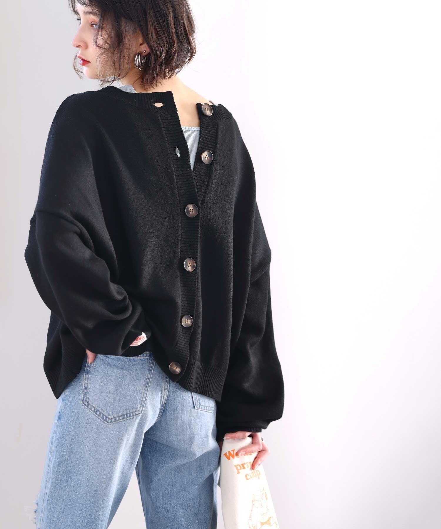 ボタンを後ろにしてプルオーバーにもできて、ルーズな華奢魅せシルエットが叶います。