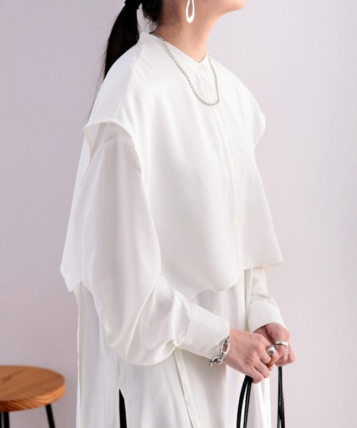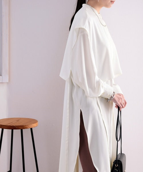 ベストを重ねたようなデザインが今年らしい、バンドカラーシャツワンピース。