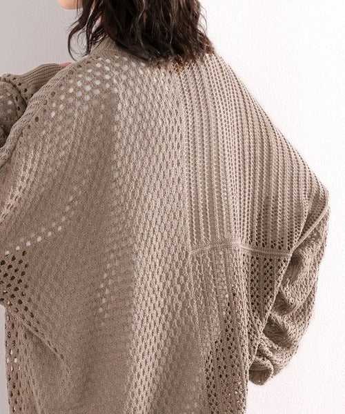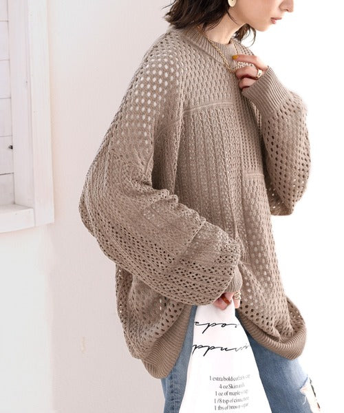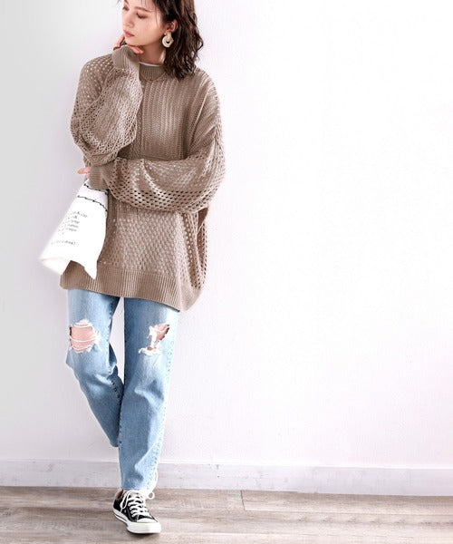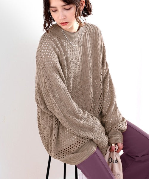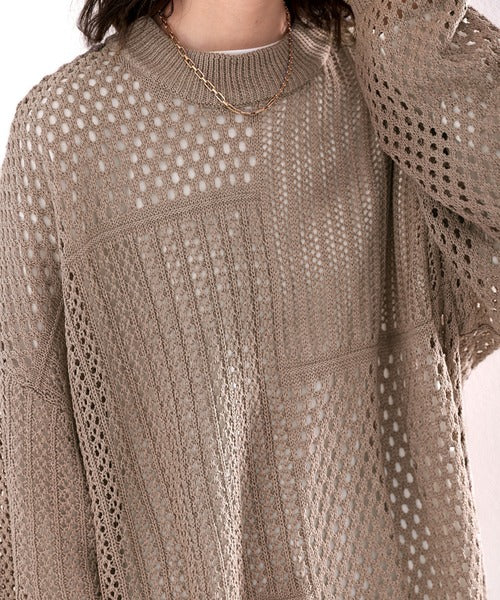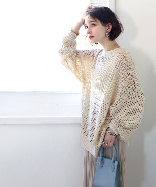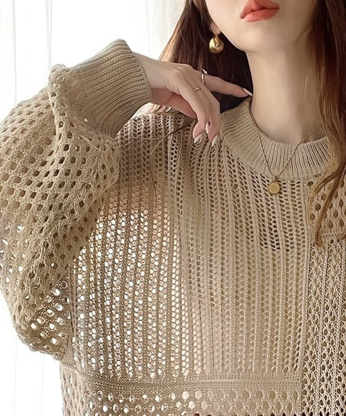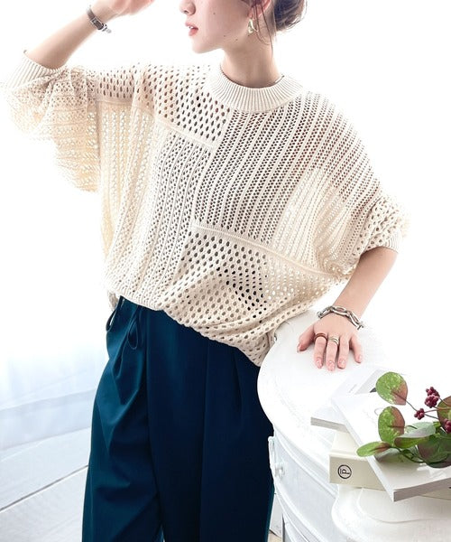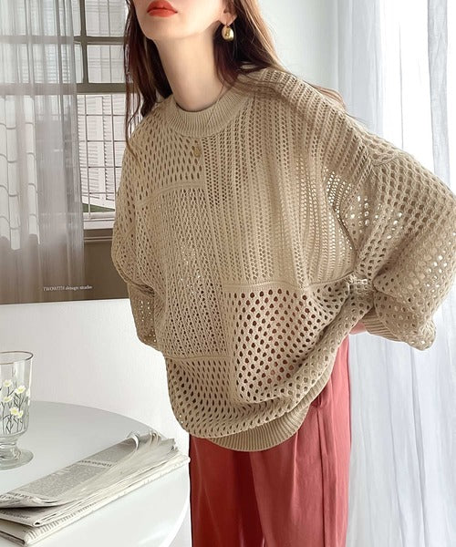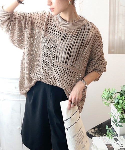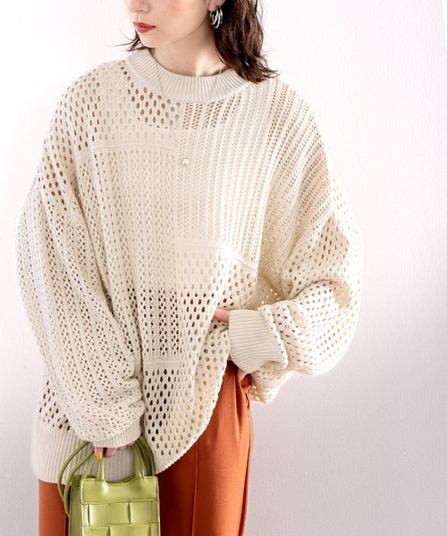 春トレンドの重ね着が決まる、ざっくり華奢感映え。パターン切替メッシュニット ce0420052