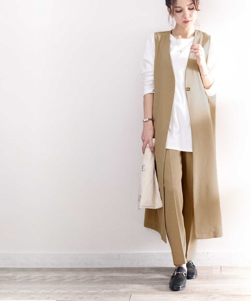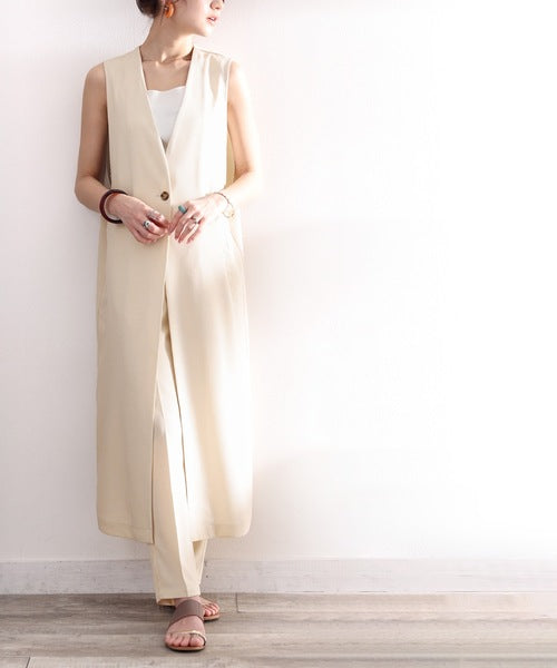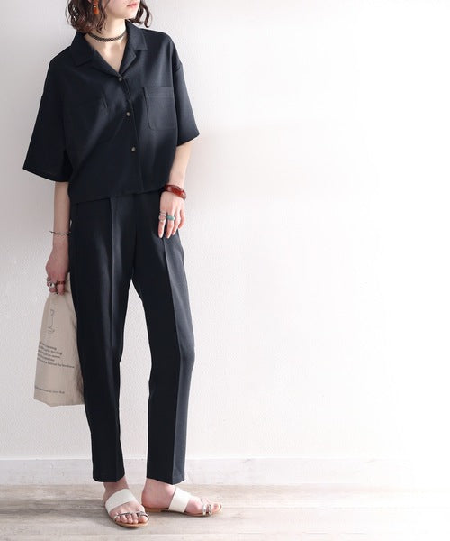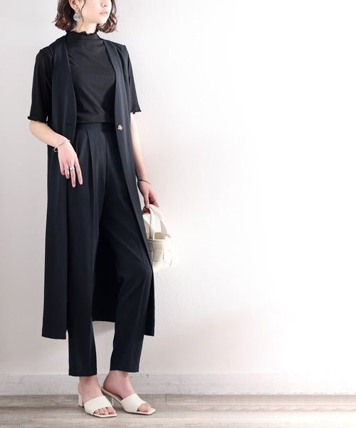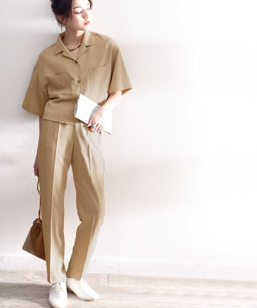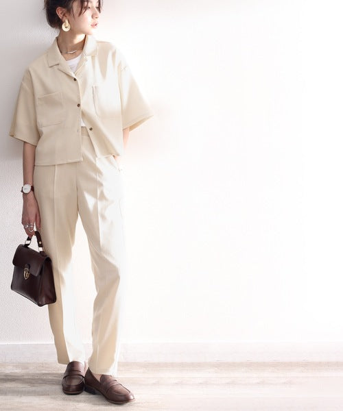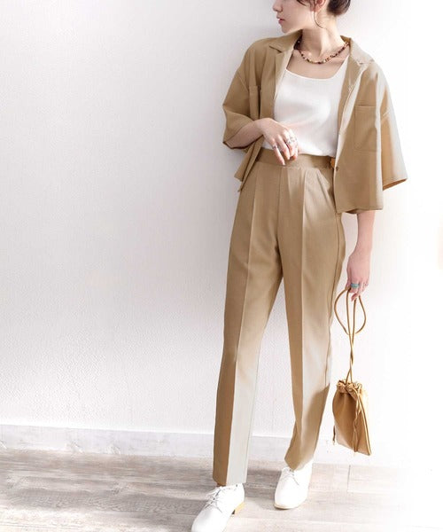 同素材のジレや開襟シャツと合わせて旬のセットアップコーデが完成します♪