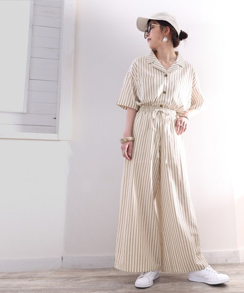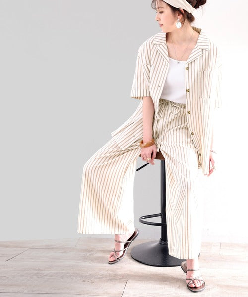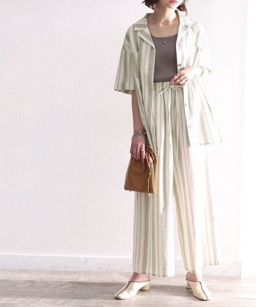 開襟シャツと合わせたセットアップコーデで一気にトレンド感アップ。