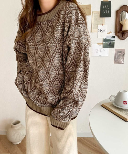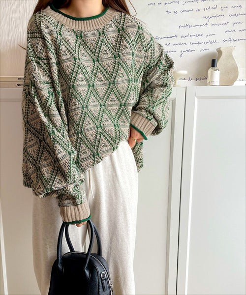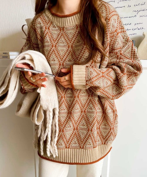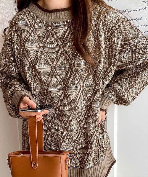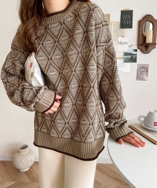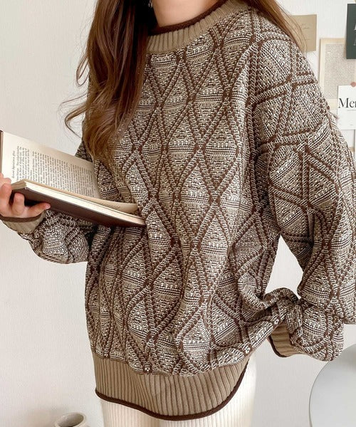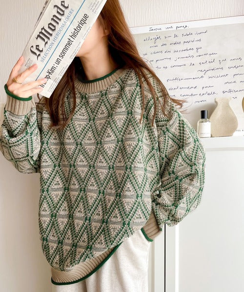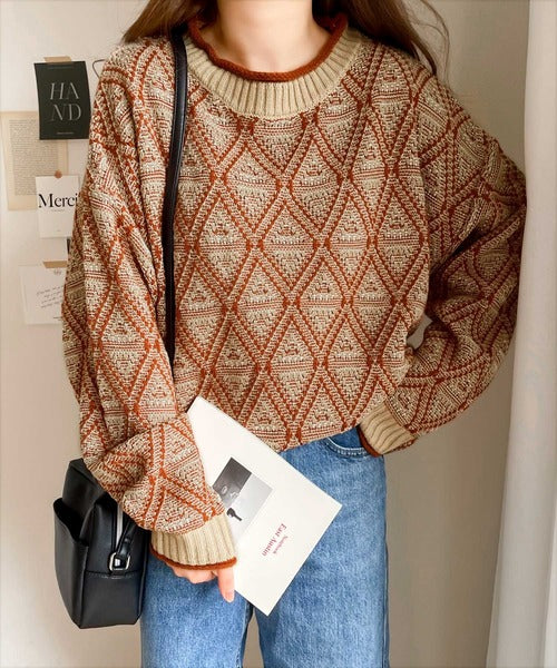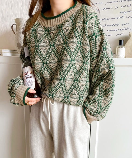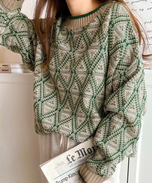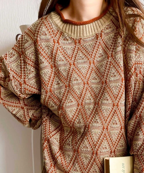 レトロムード満開。配色ダイヤ柄ジャガードニットプルオーバー ce0420134