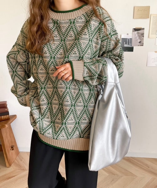 パッと目に留まる大振りダイヤ柄ジャガードニット。