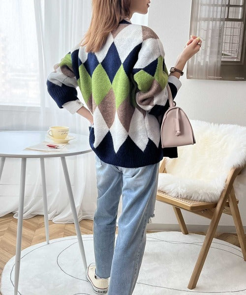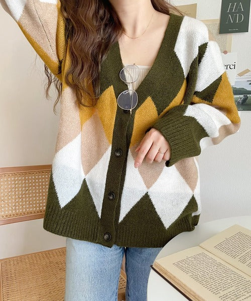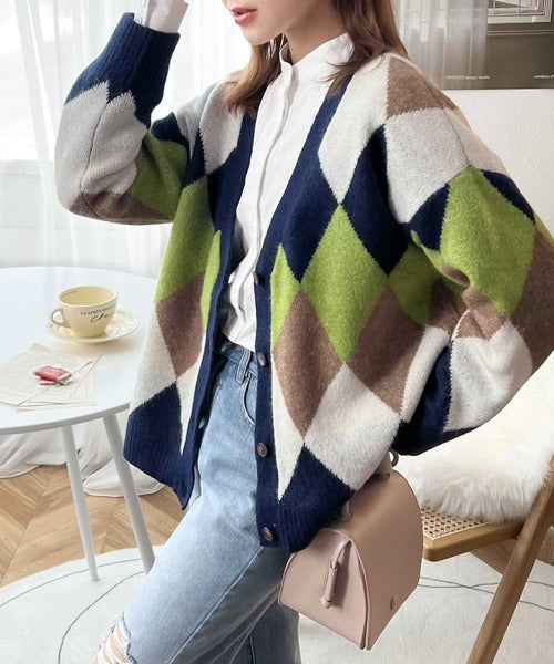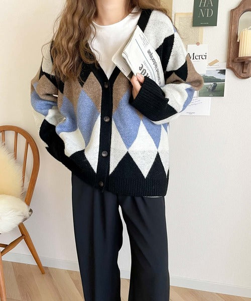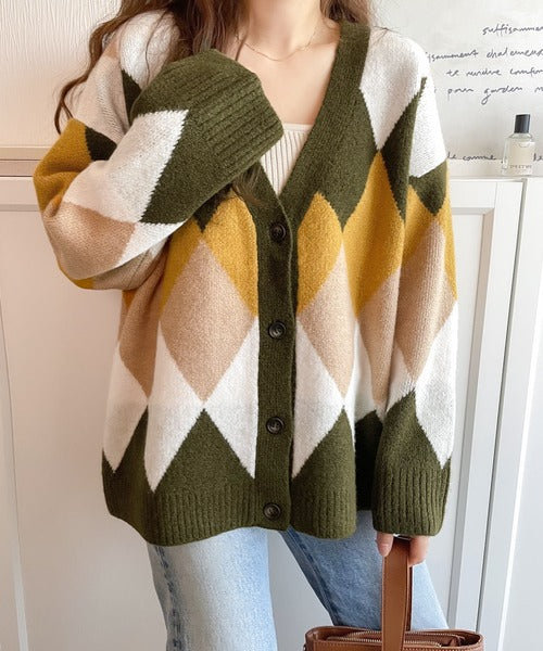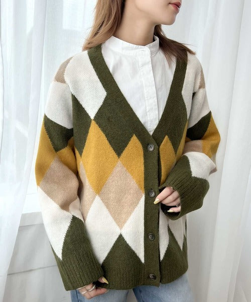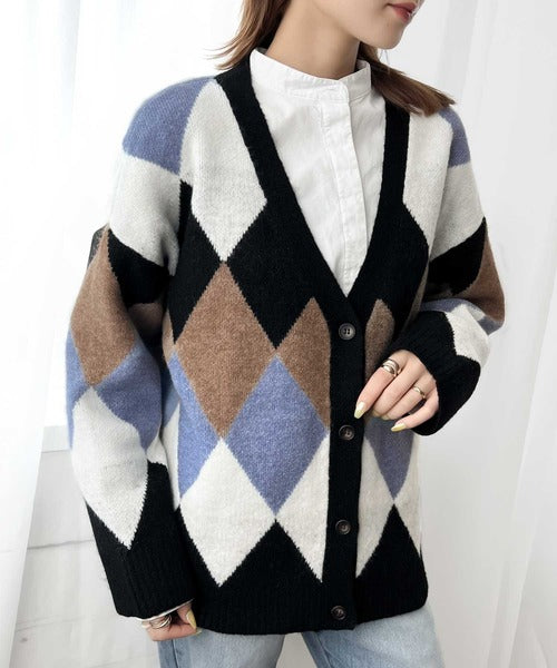 大きめアーガイル柄が存在感を引き立たせるオーバーカーディガン。