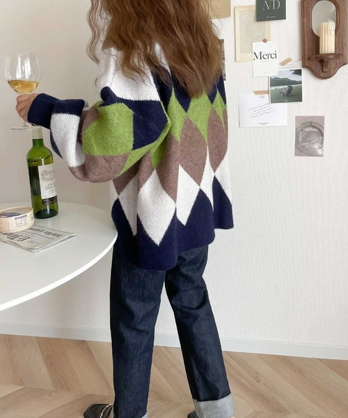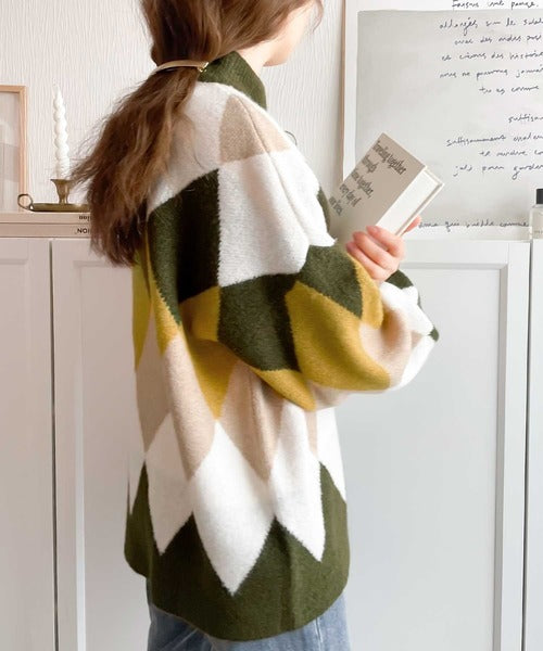 大きめアーガイル柄が存在感を引き立たせるオーバーカーディガン。