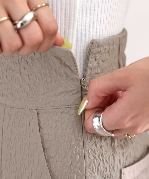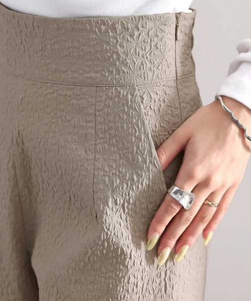 花柄模様のエンボス加工を施した上品魅えワイドパンツ。