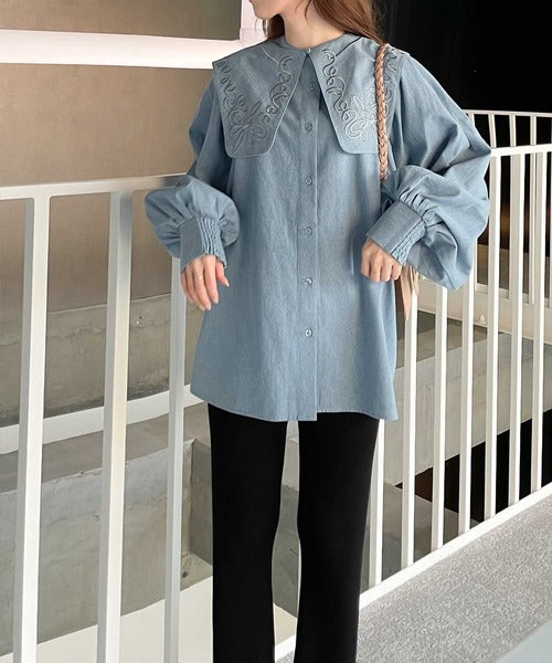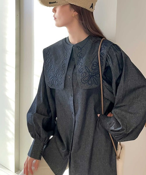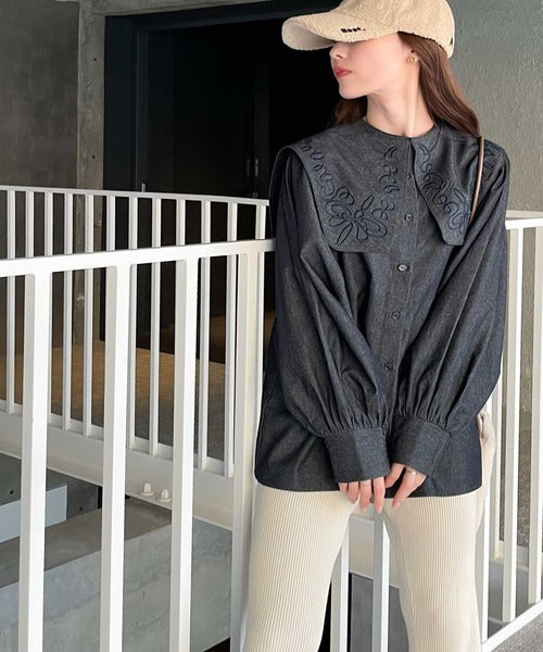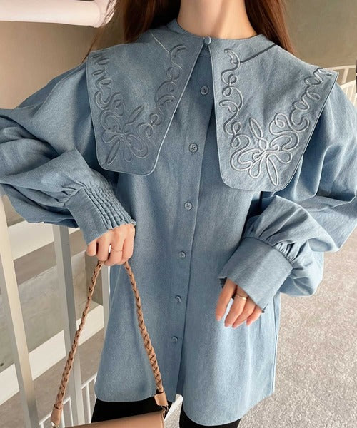華やかな刺繍の立体感がクラシカルなビッグカラーブラウス。
