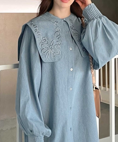 好印象で秋はじめ。綿100、3wayコード刺繍ビッグカラーダンガリーブラウス(取り外し可能) ce0420174