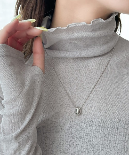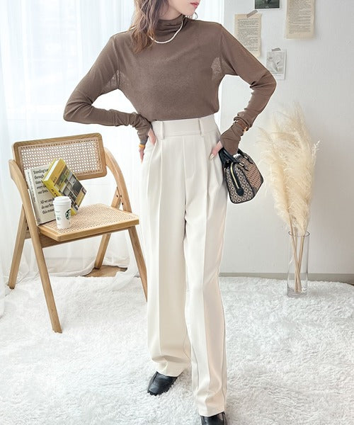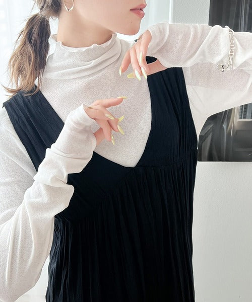 程よい透け感のあるスラブ素材のハイネックトップス。