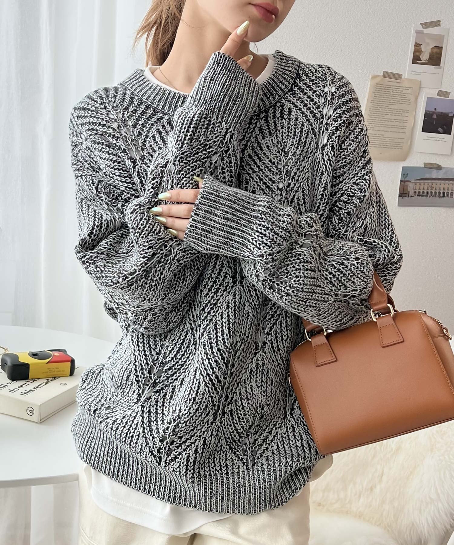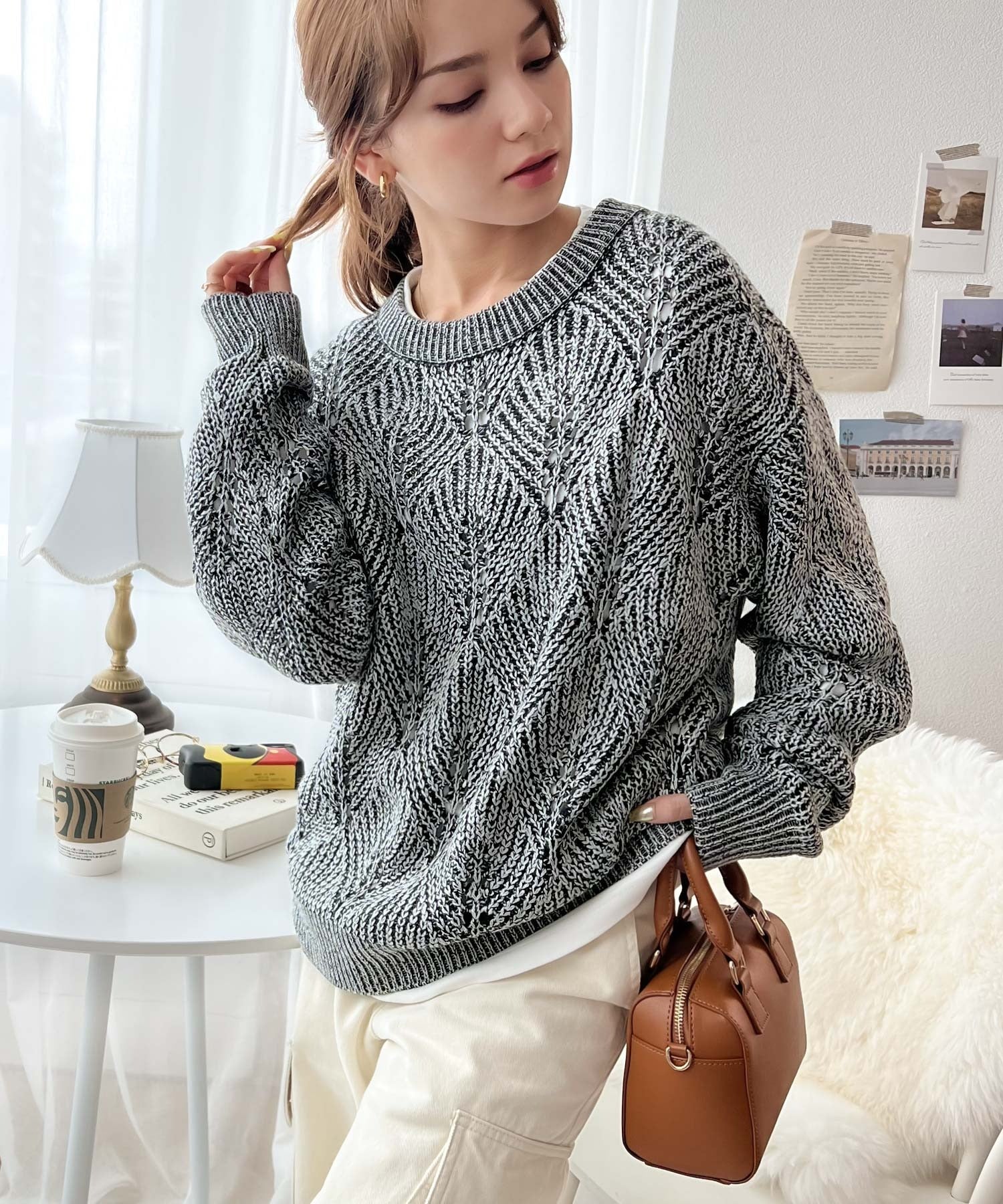ミックスカラー糸を楽しむ。ダイヤ柄透かし編みニット。 ce0590030