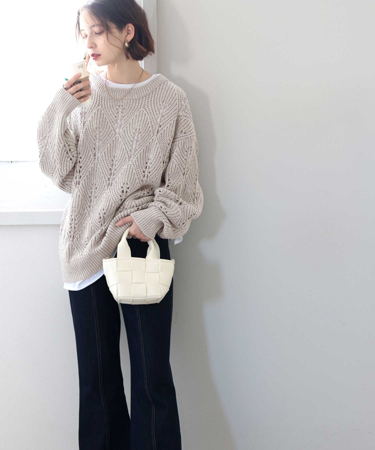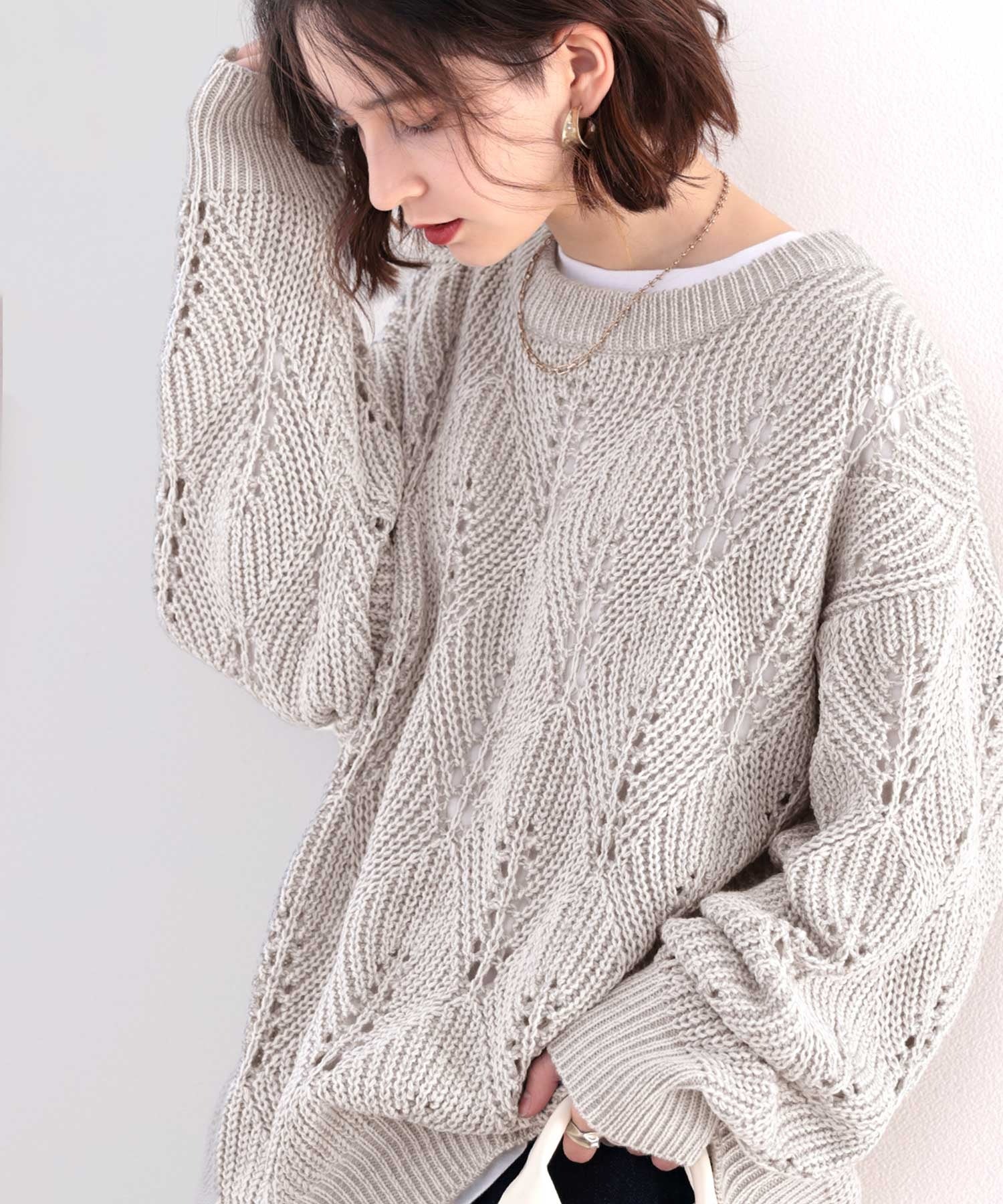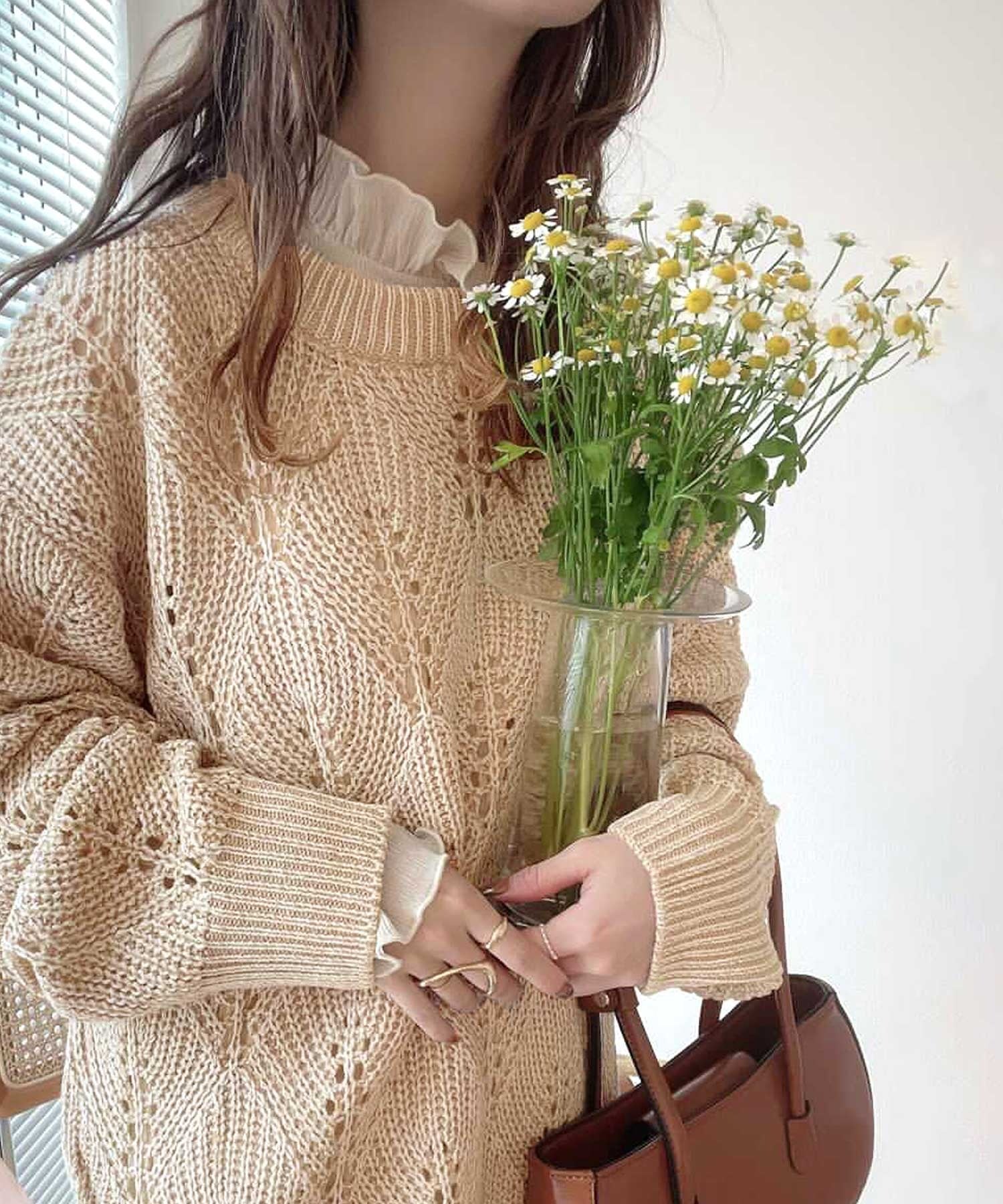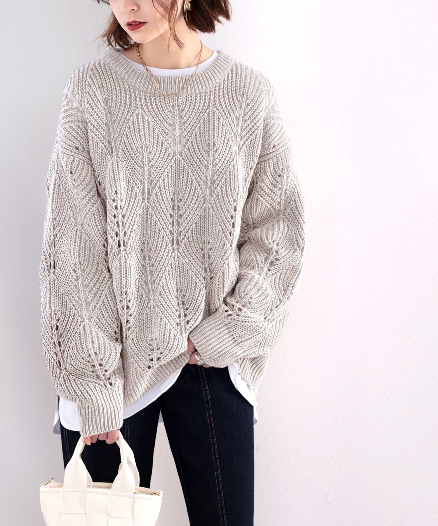 ダイヤ柄透かし編みが目を引く、1枚でコーデ映えのニット。