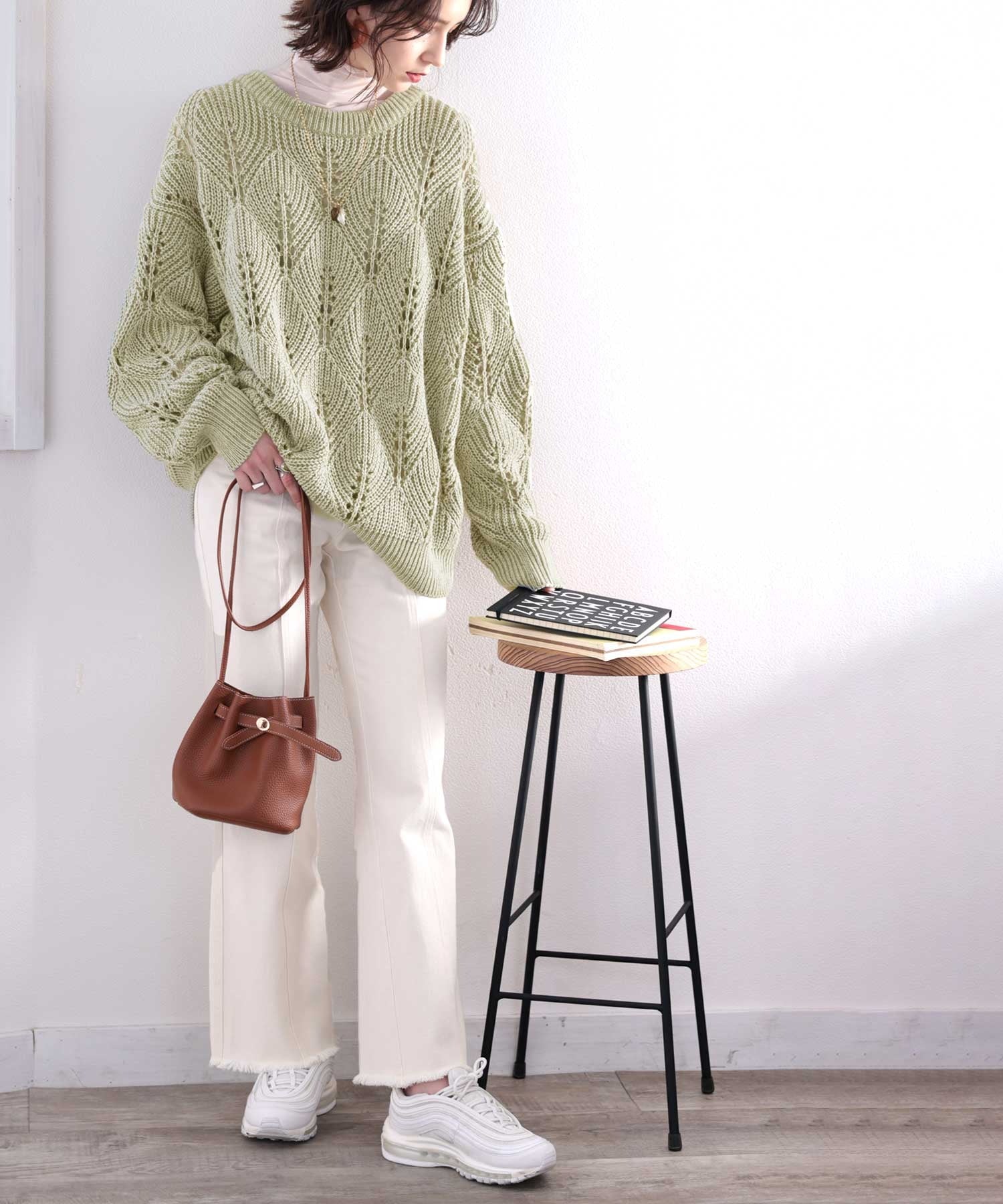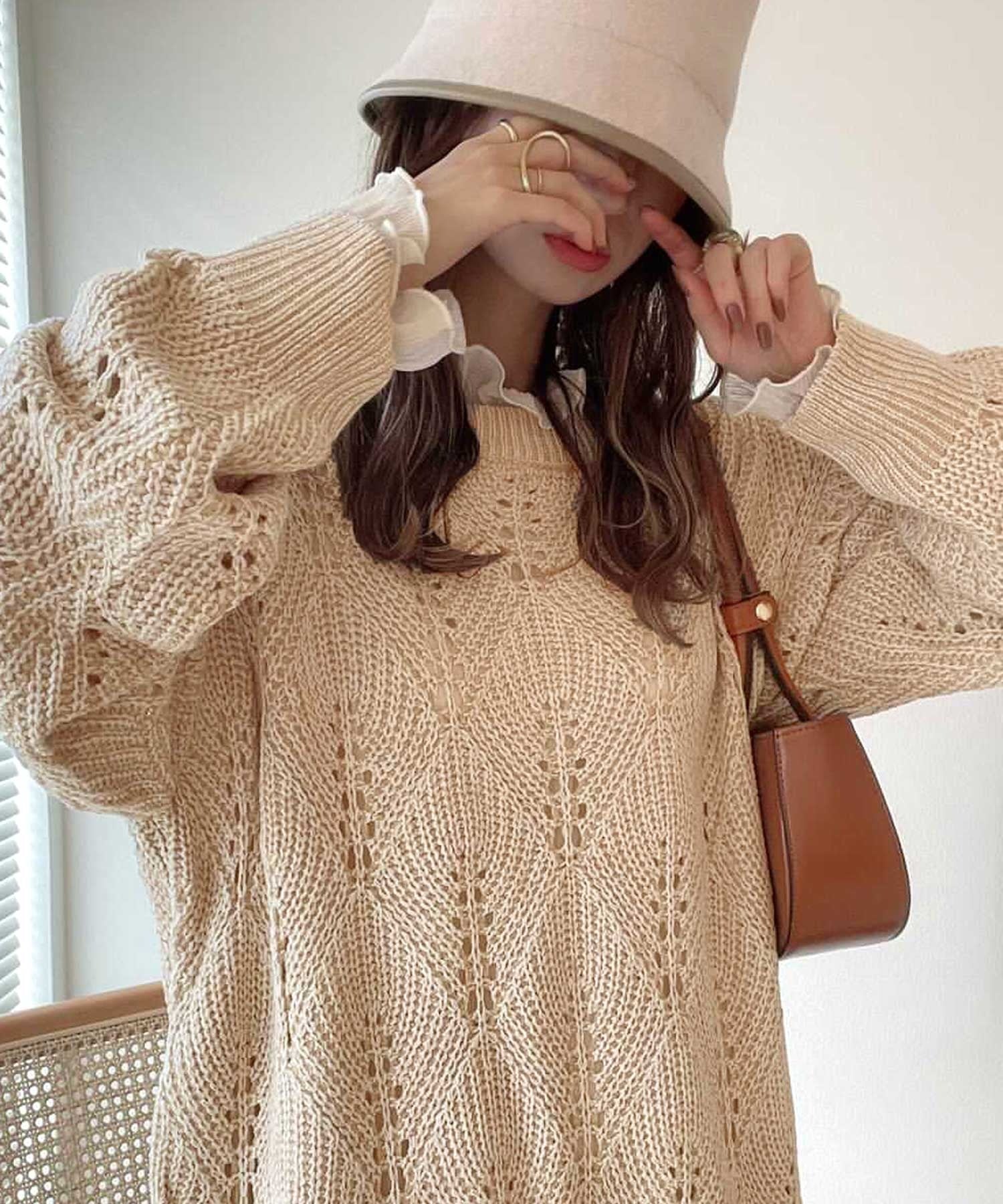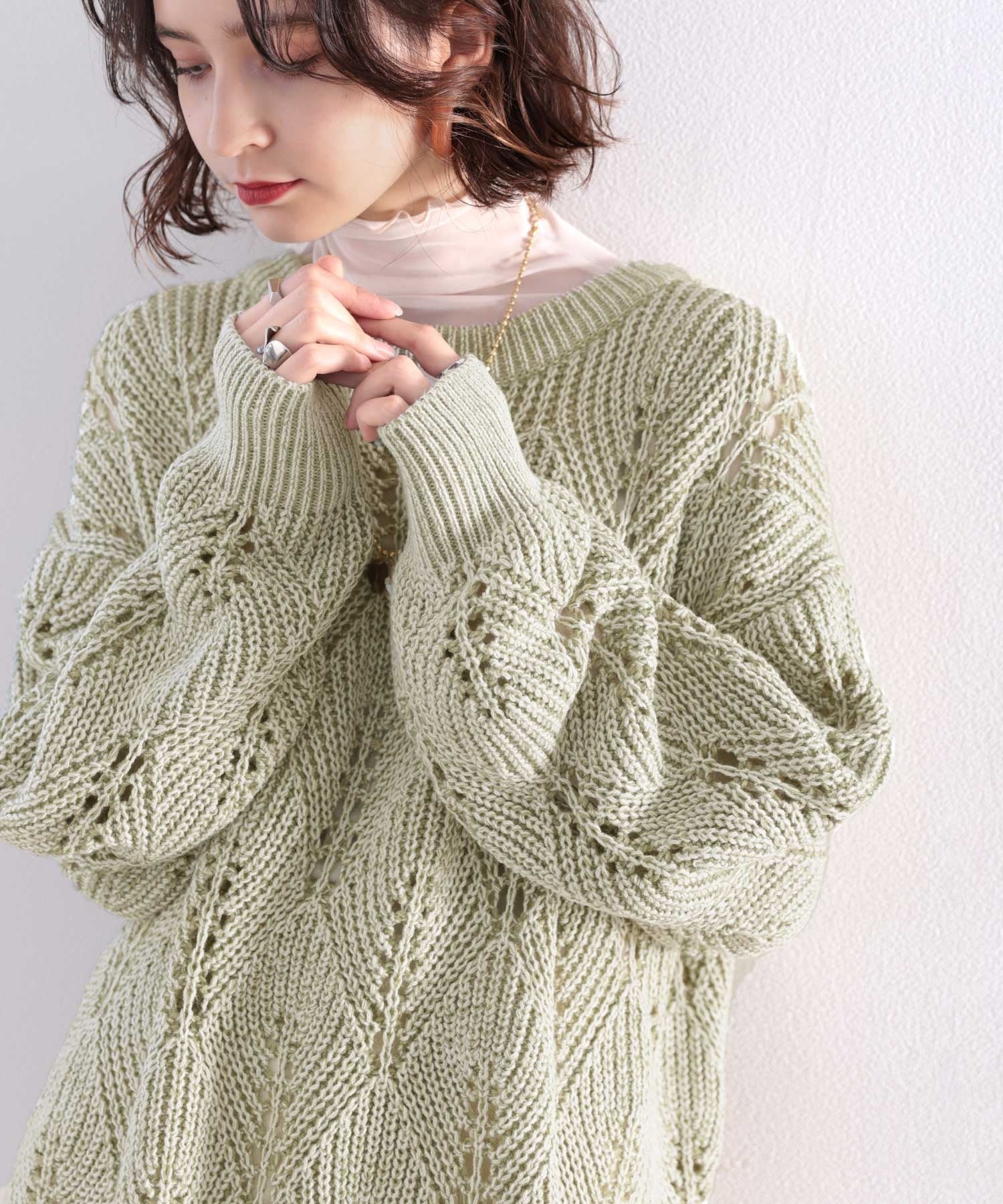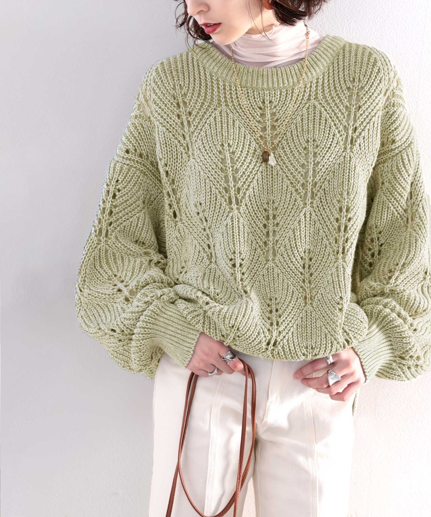 ダイヤ柄透かし編みが目を引く、1枚でコーデ映えのニット。