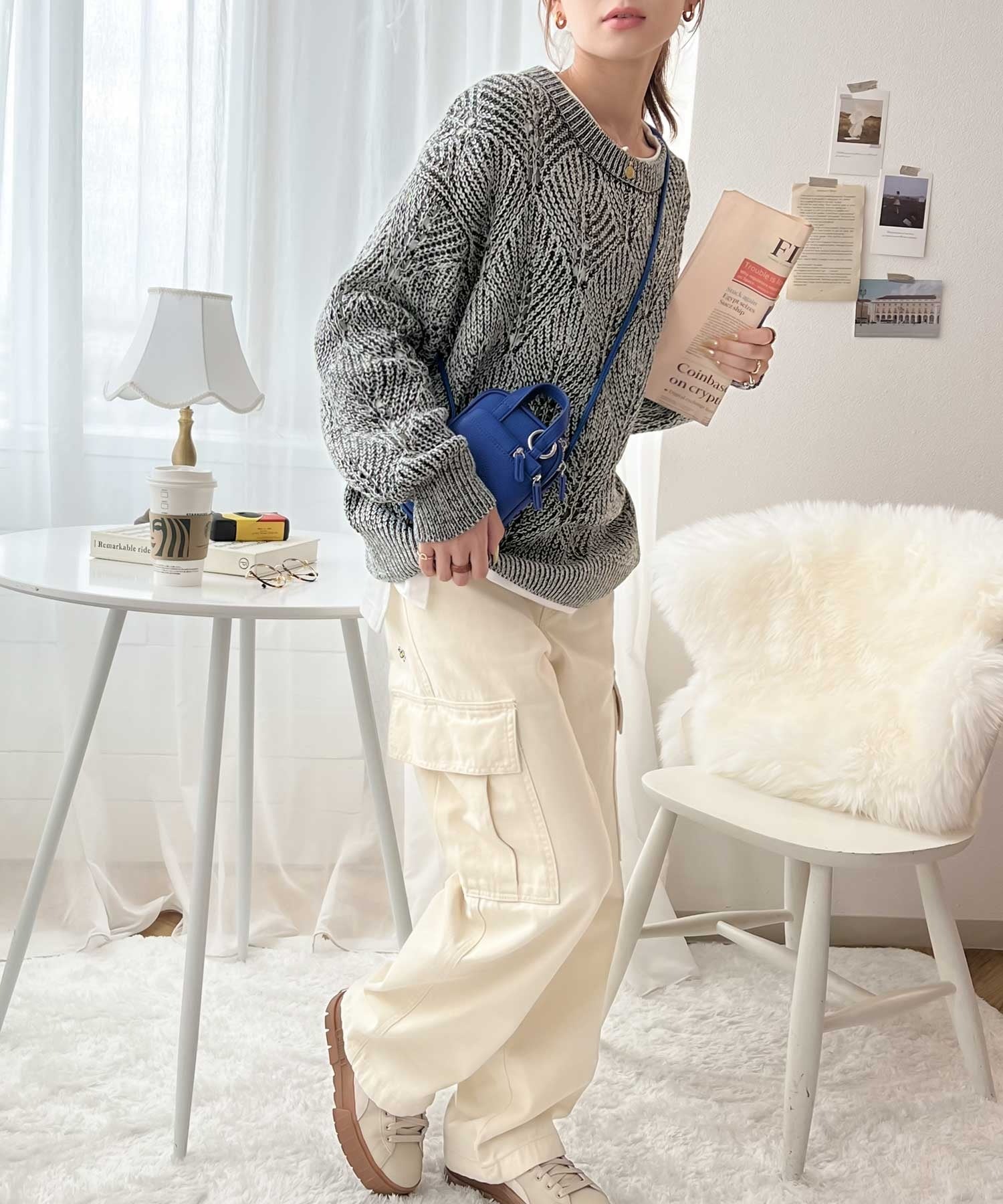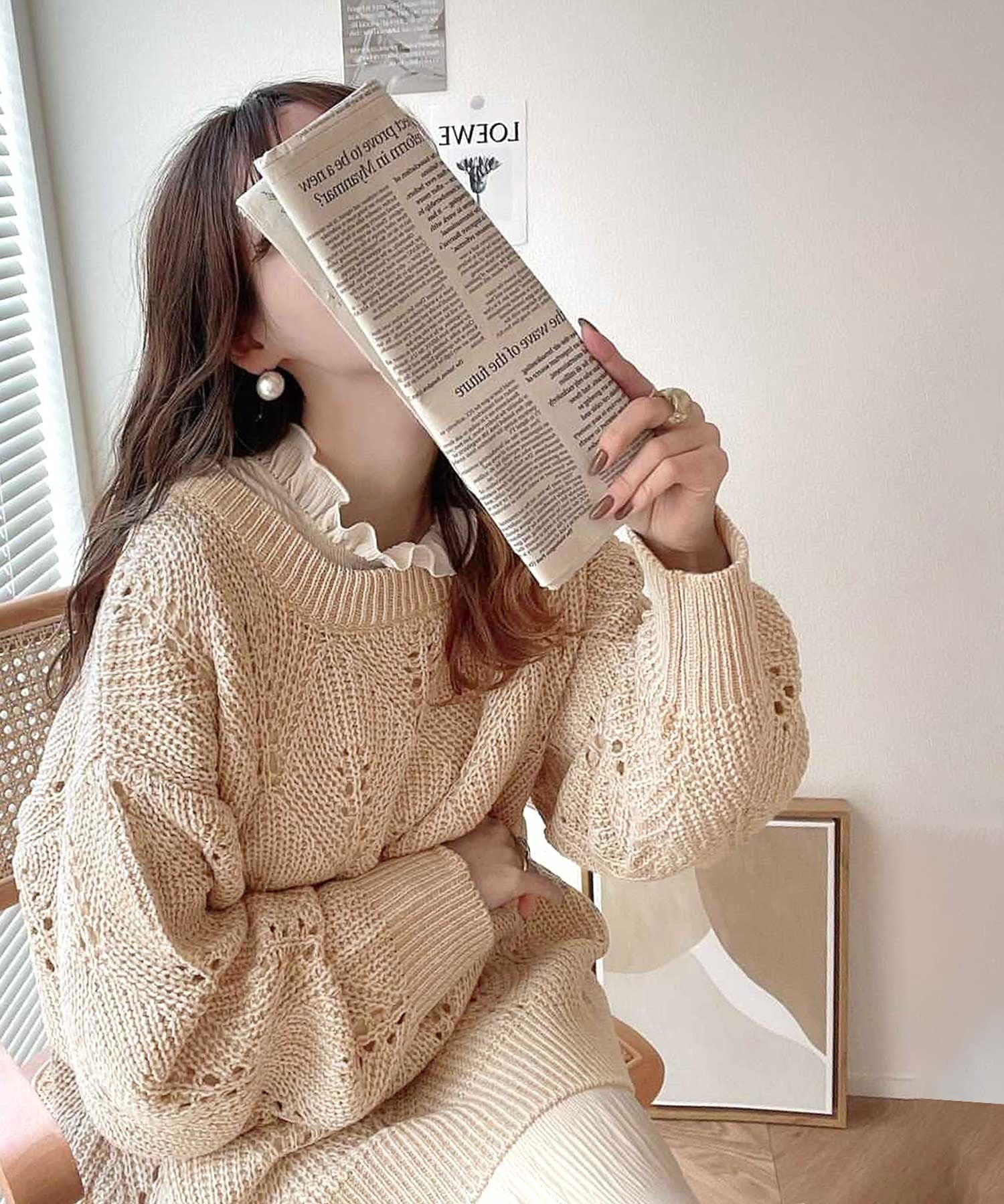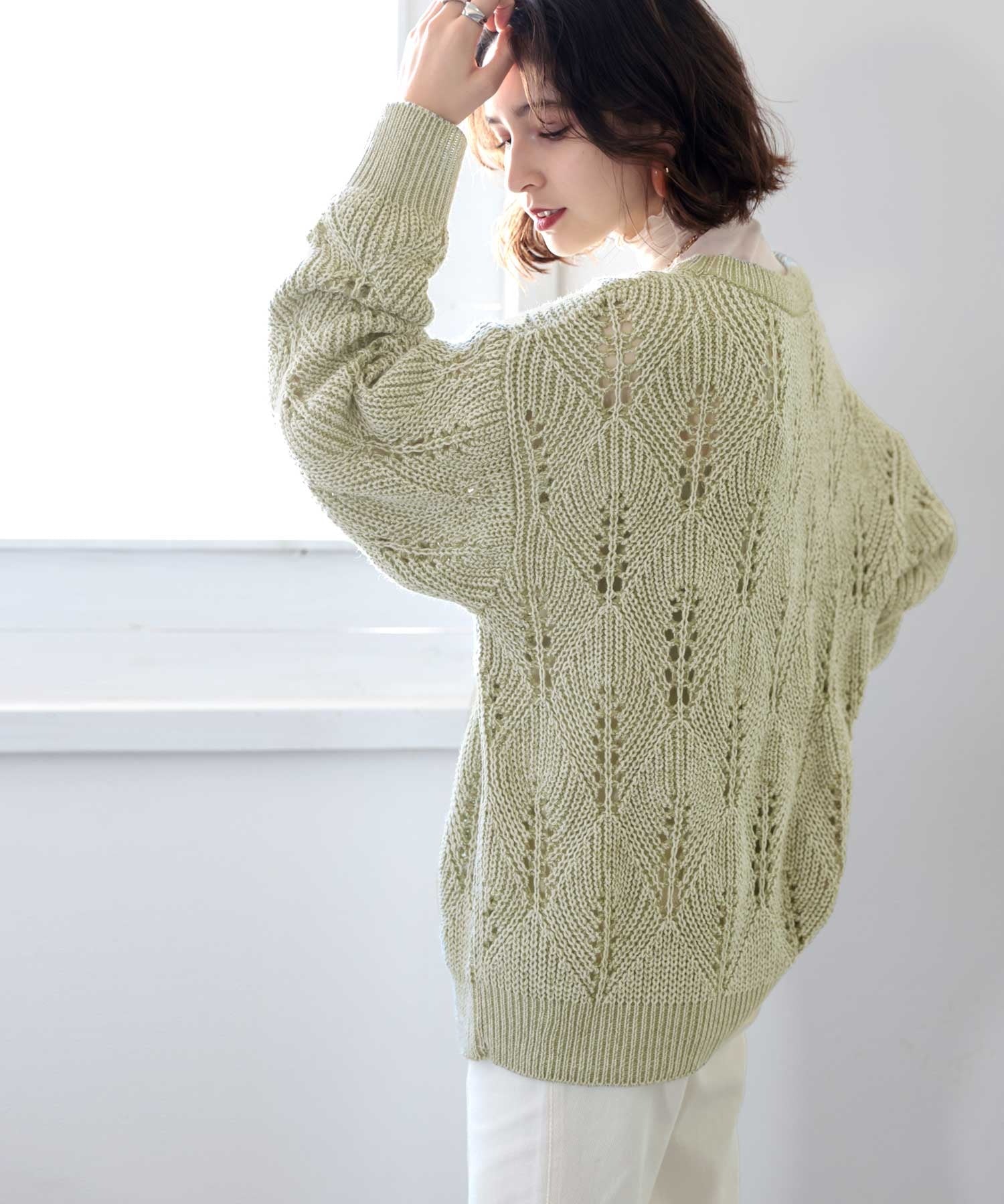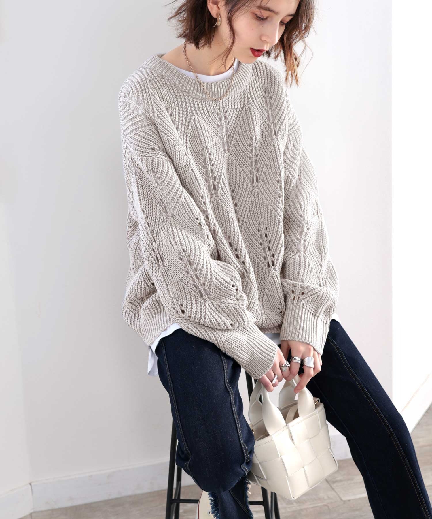 ダイヤ柄透かし編みが目を引く、1枚でコーデ映えのニット。