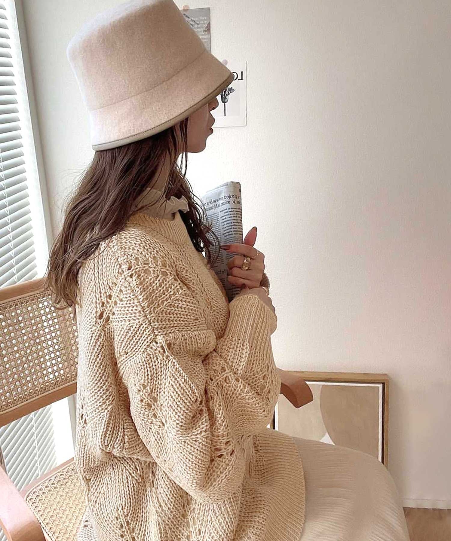 一枚で決まる春色ダイヤ柄透かし編みニット。