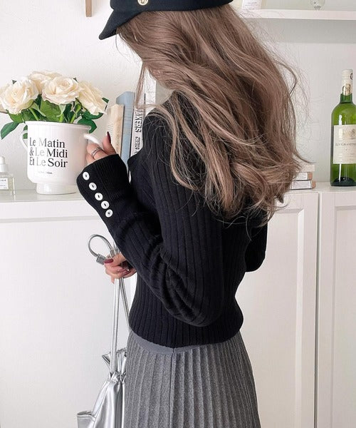 柔らかな肌触りと程よい収縮が心地いいリブ編みニット。