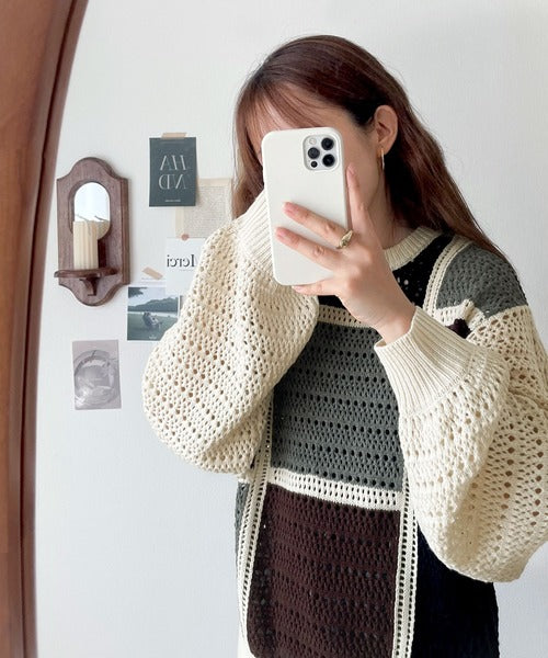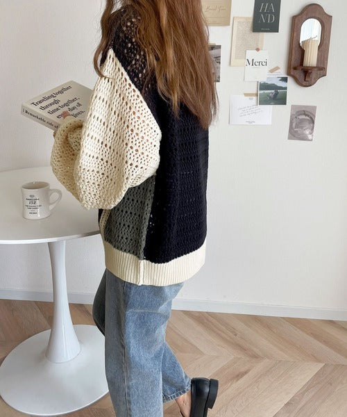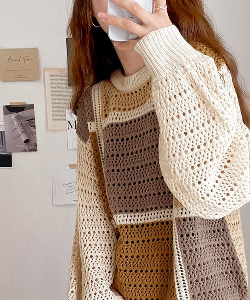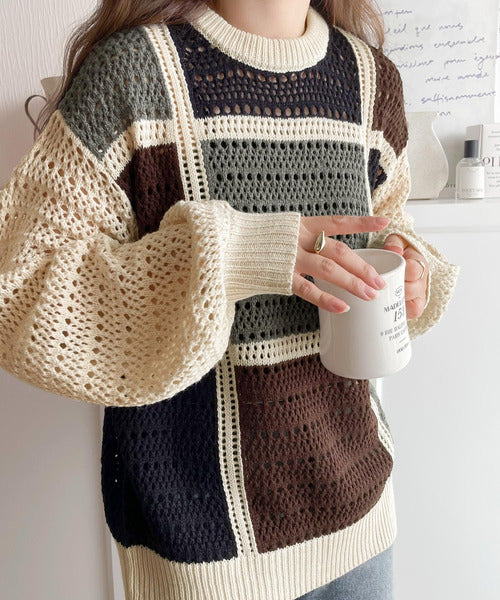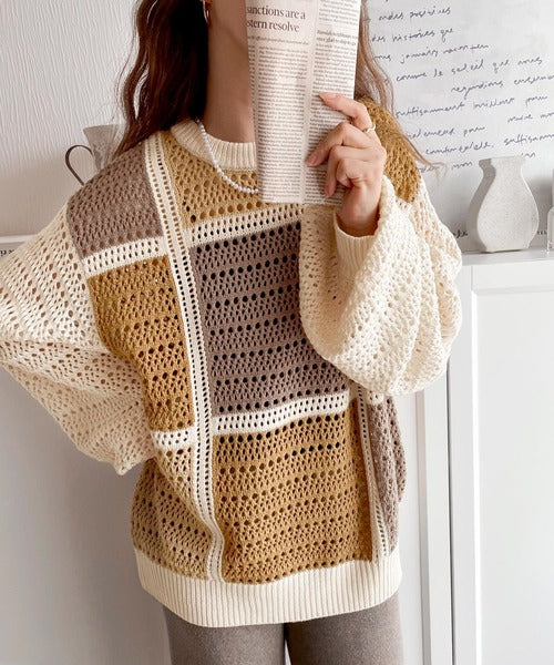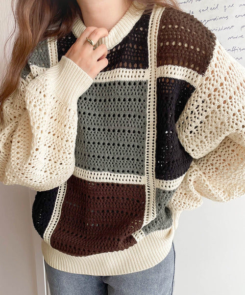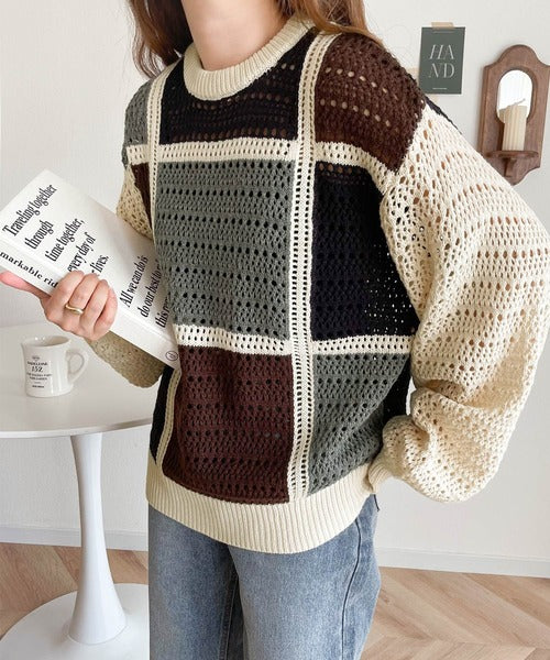 90'sレトロ配色の魅力。こっくり秋色パッチワーク風透かし編みニットプルオーバー ce0590056