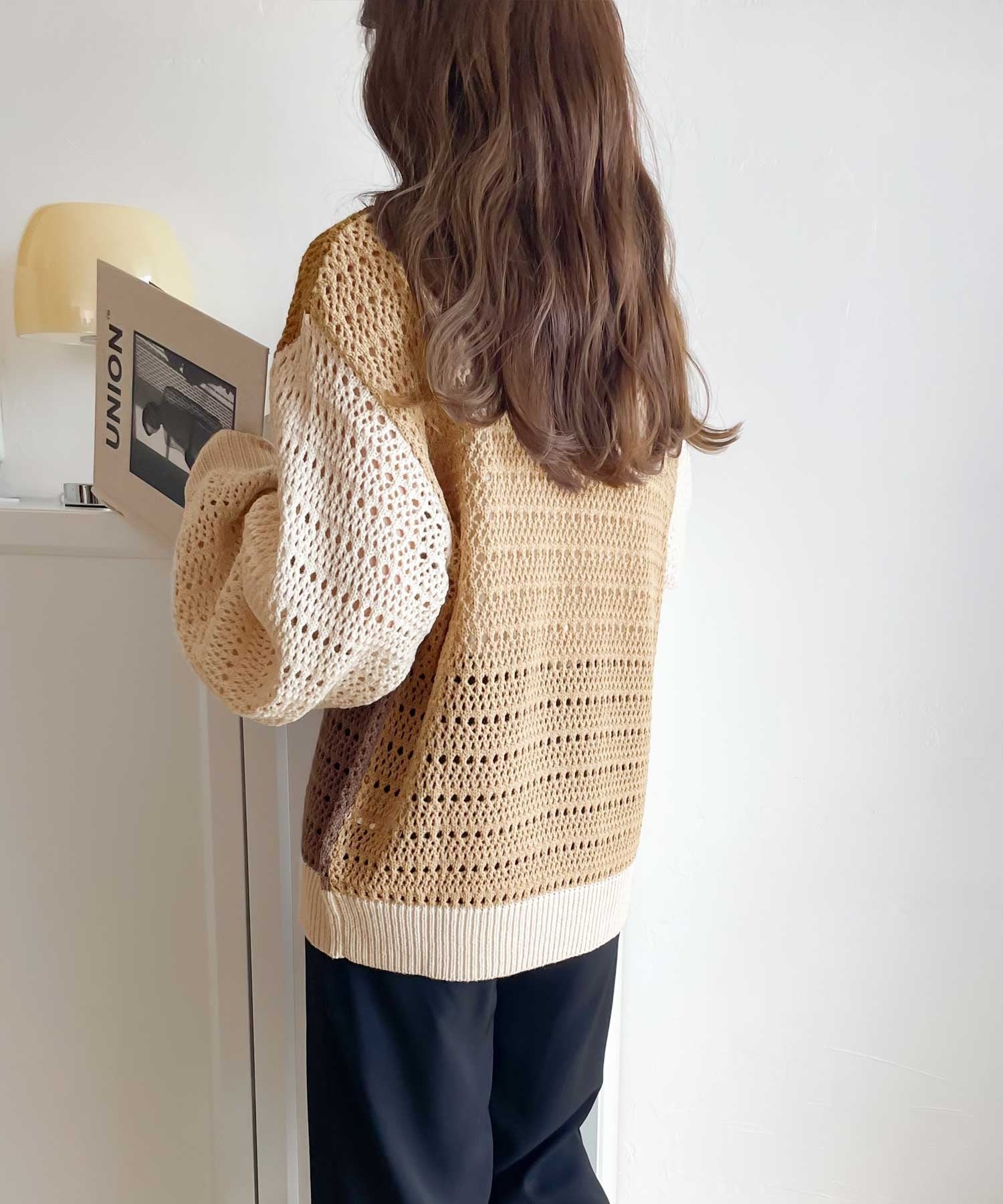 レイヤードコーデを楽しむ、大人の個性派透かし編みニット。