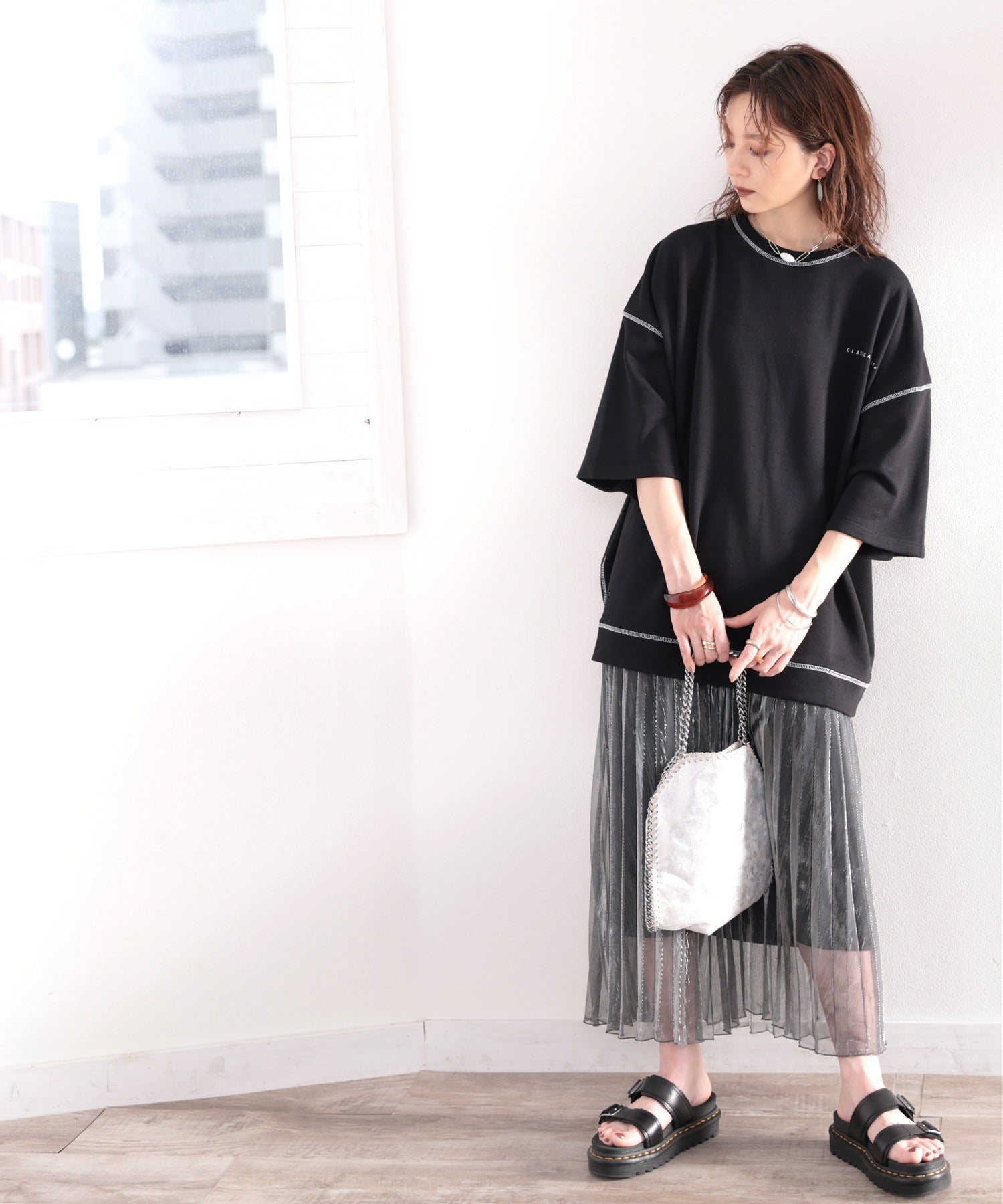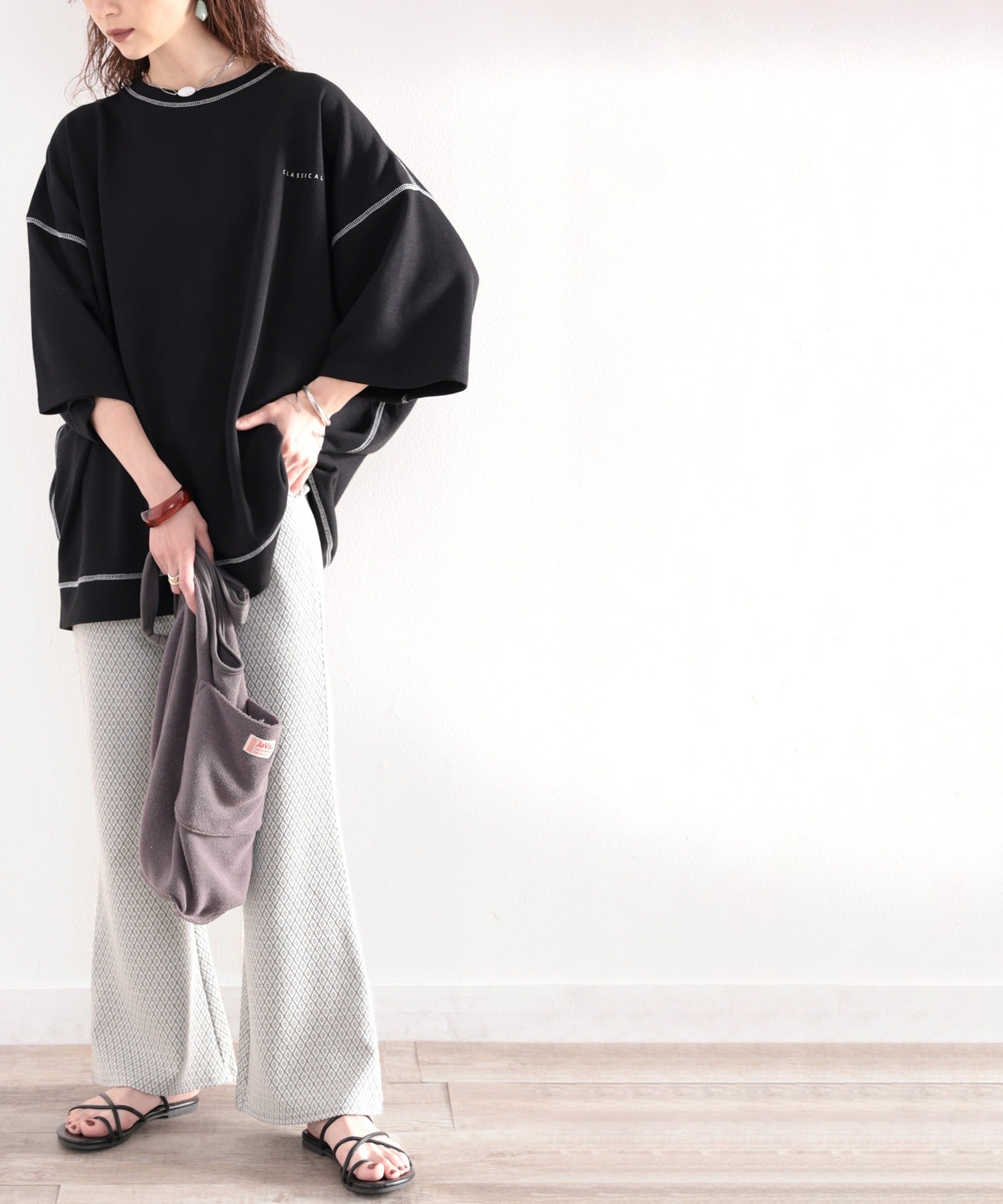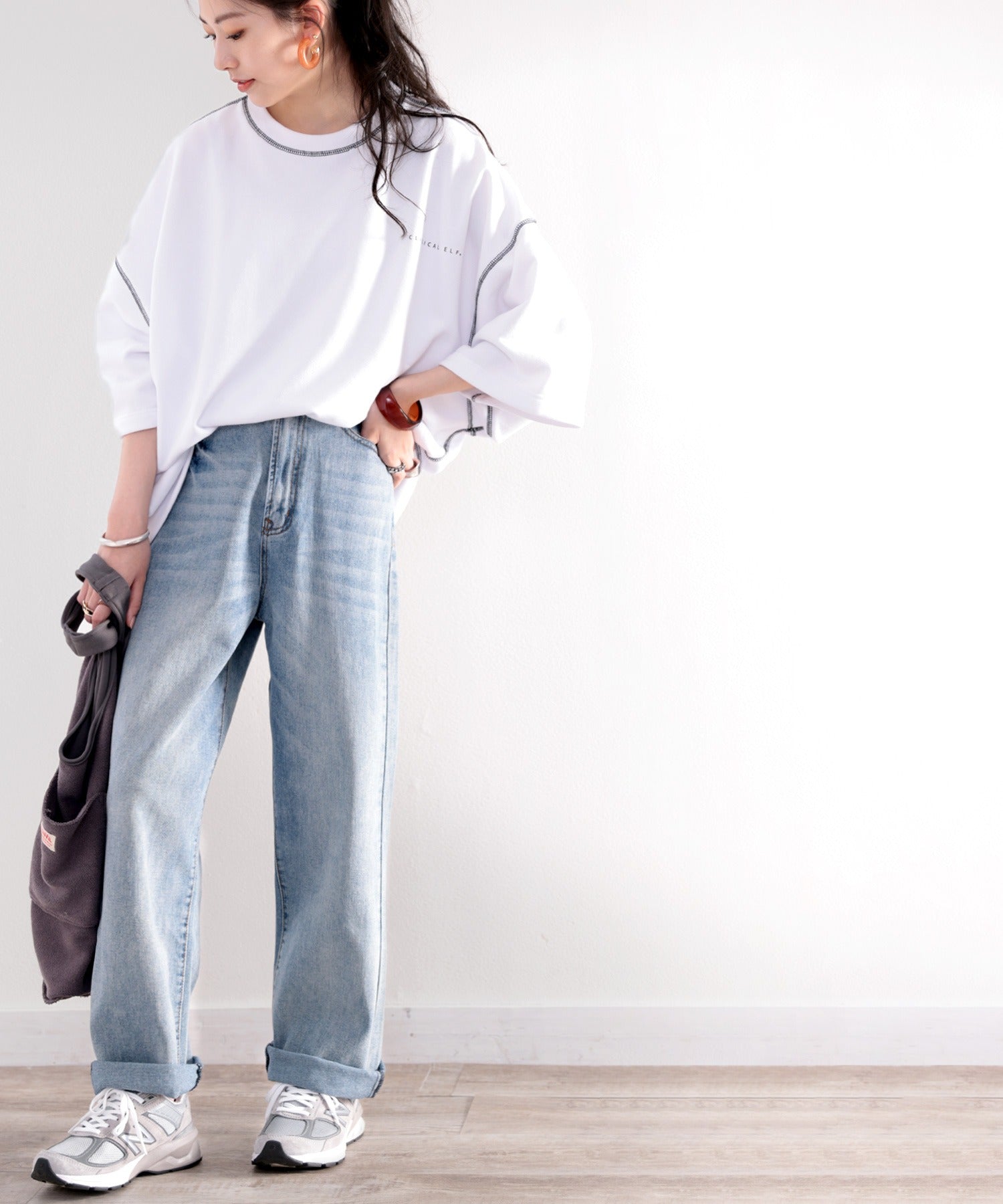 ワイドな身幅やお尻が隠れるくらいの丈感がゆるっとオーバーサイズな着こなしを演出。