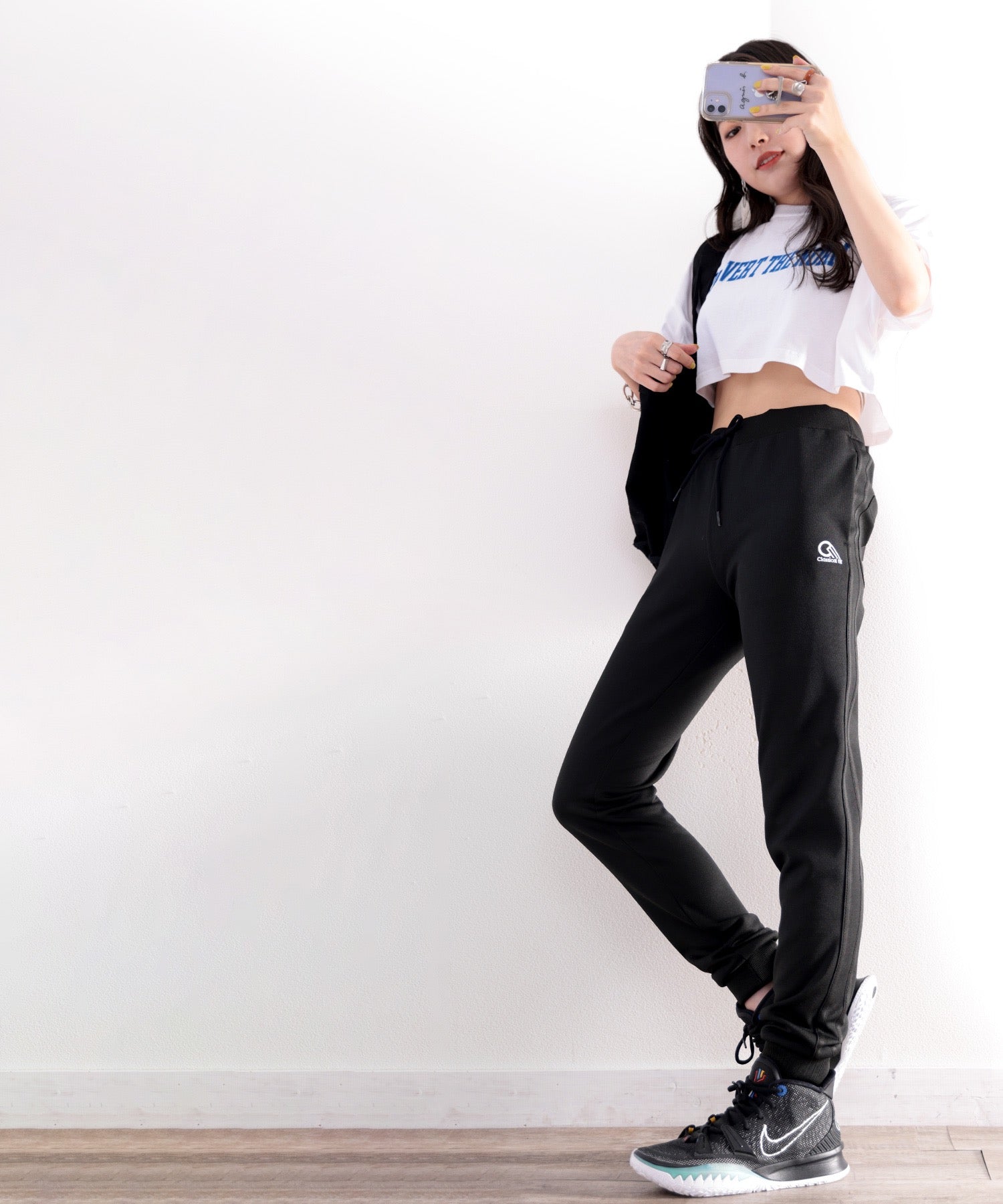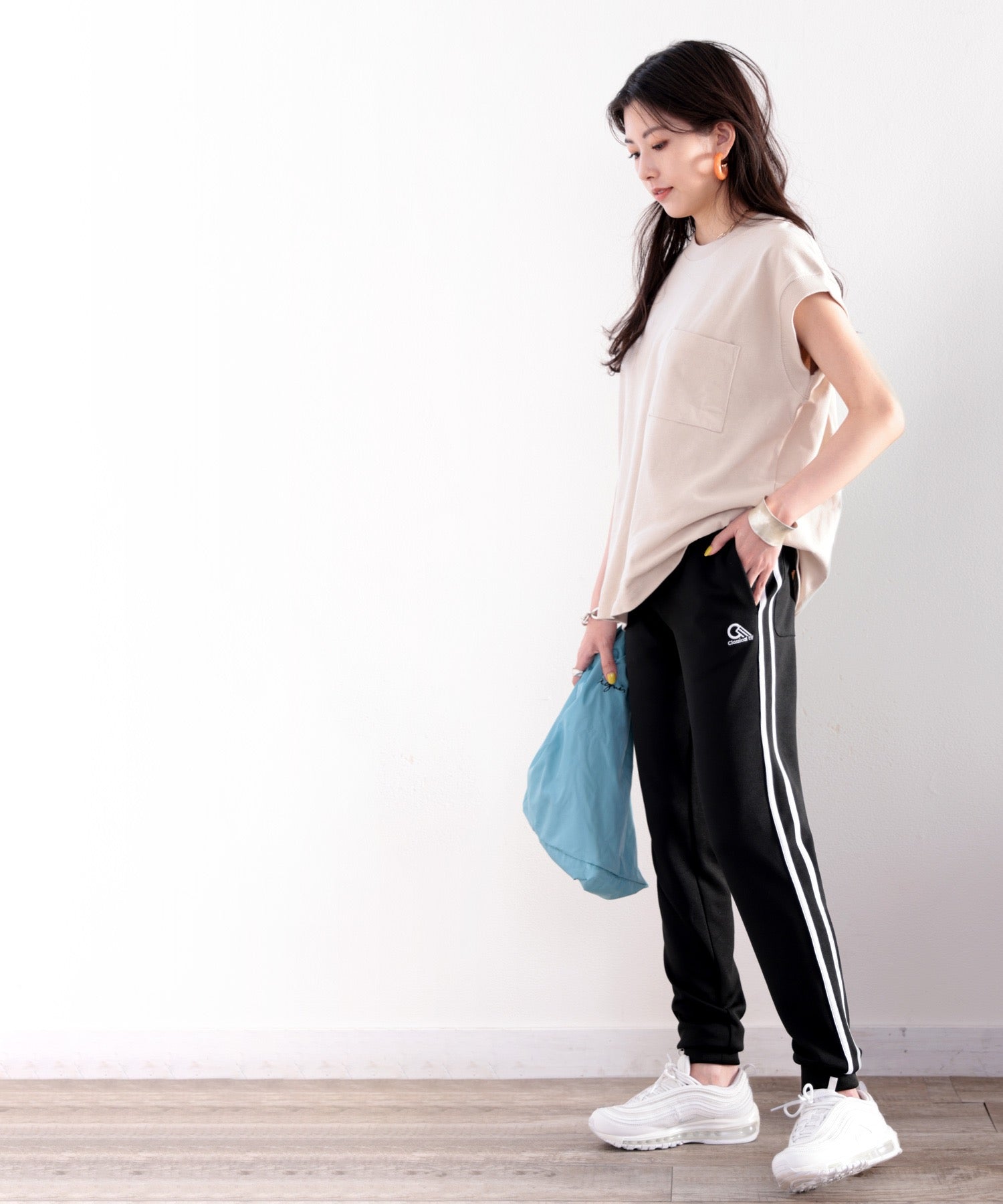 サイドの2本のラインと裾のリブが脚をキュッと細く長く見せてくれます。