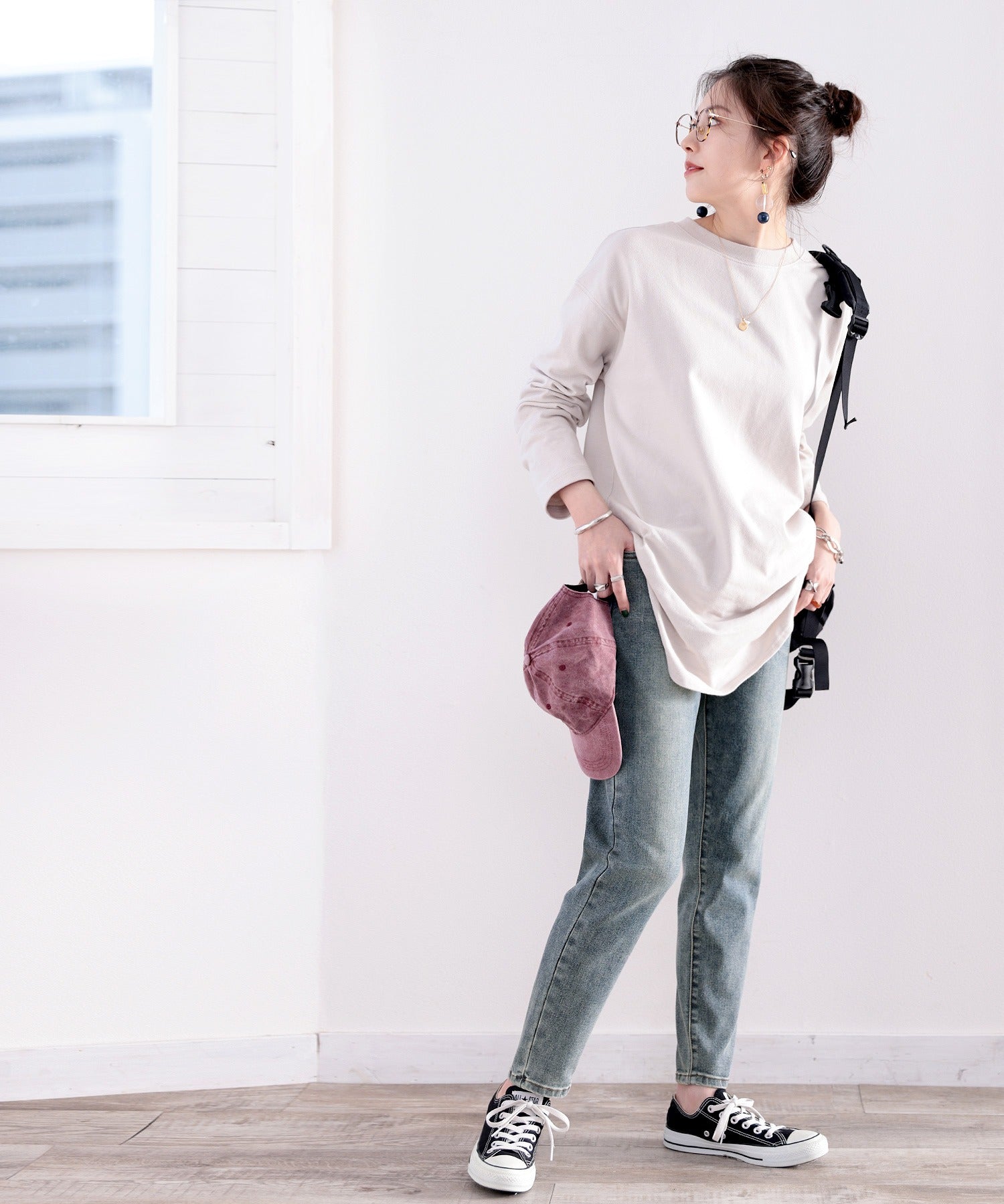 ゆるめのシルエットのシャツやカットソーと合わせれば着痩せ効果も期待できます。