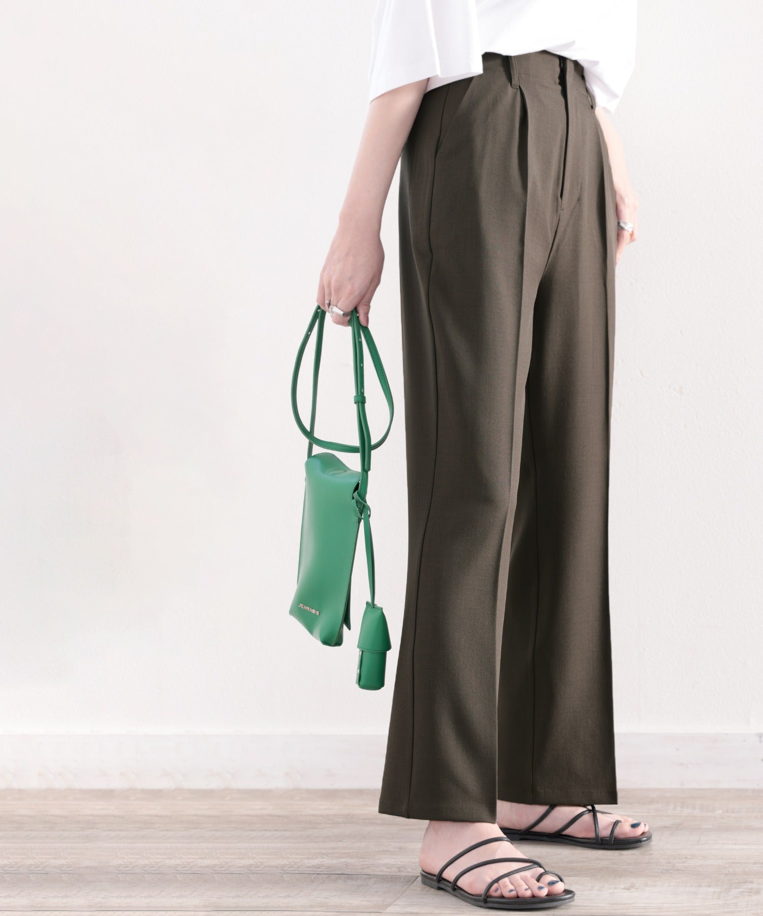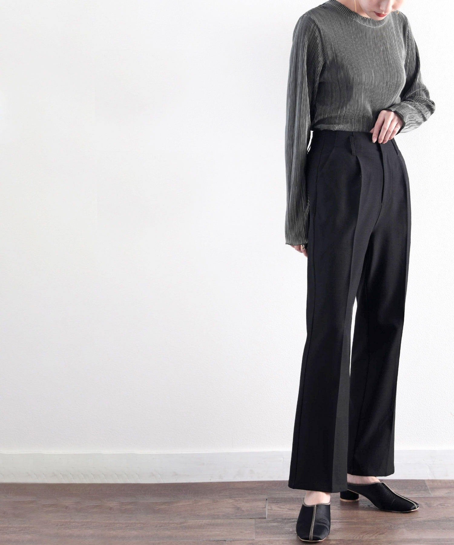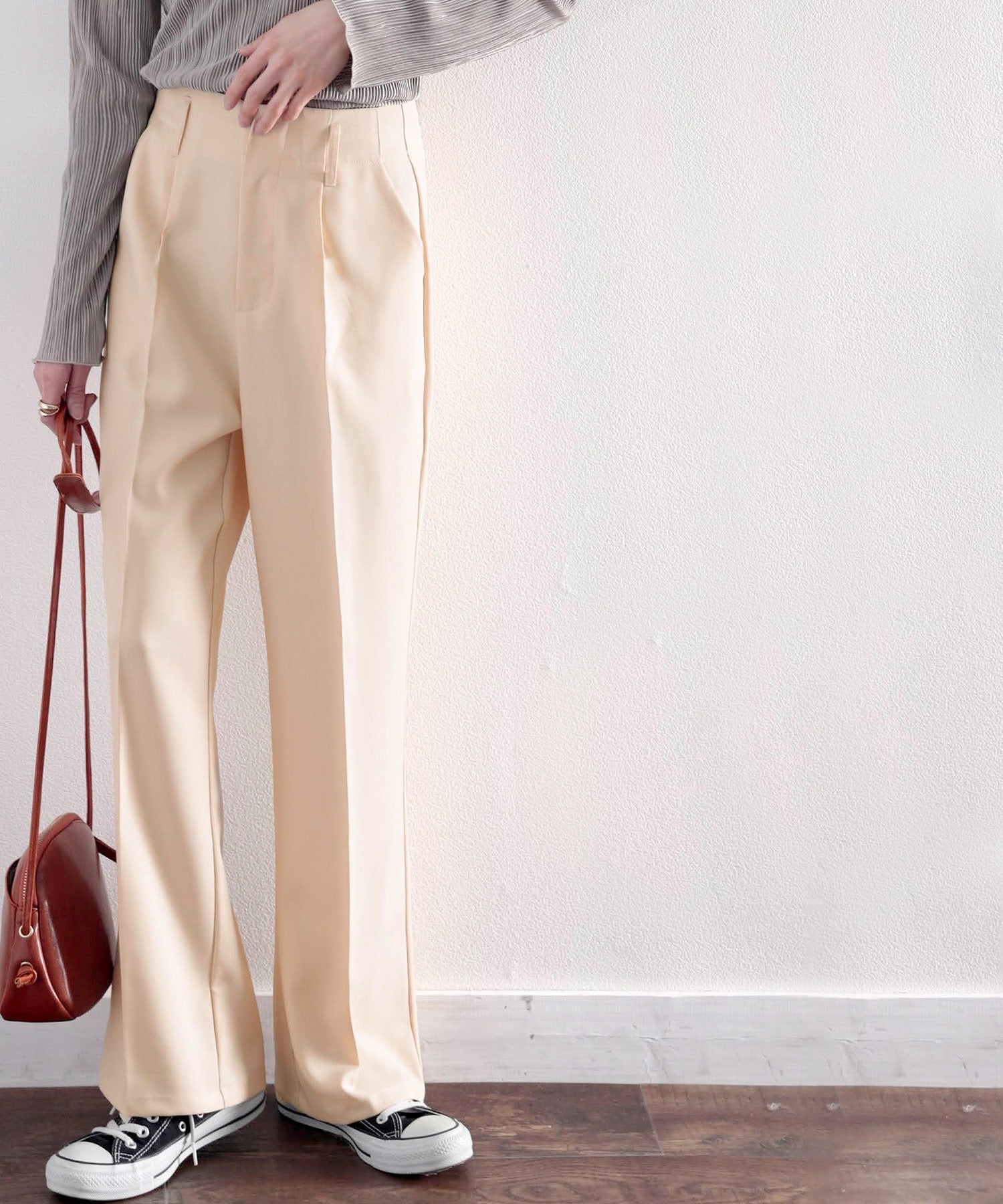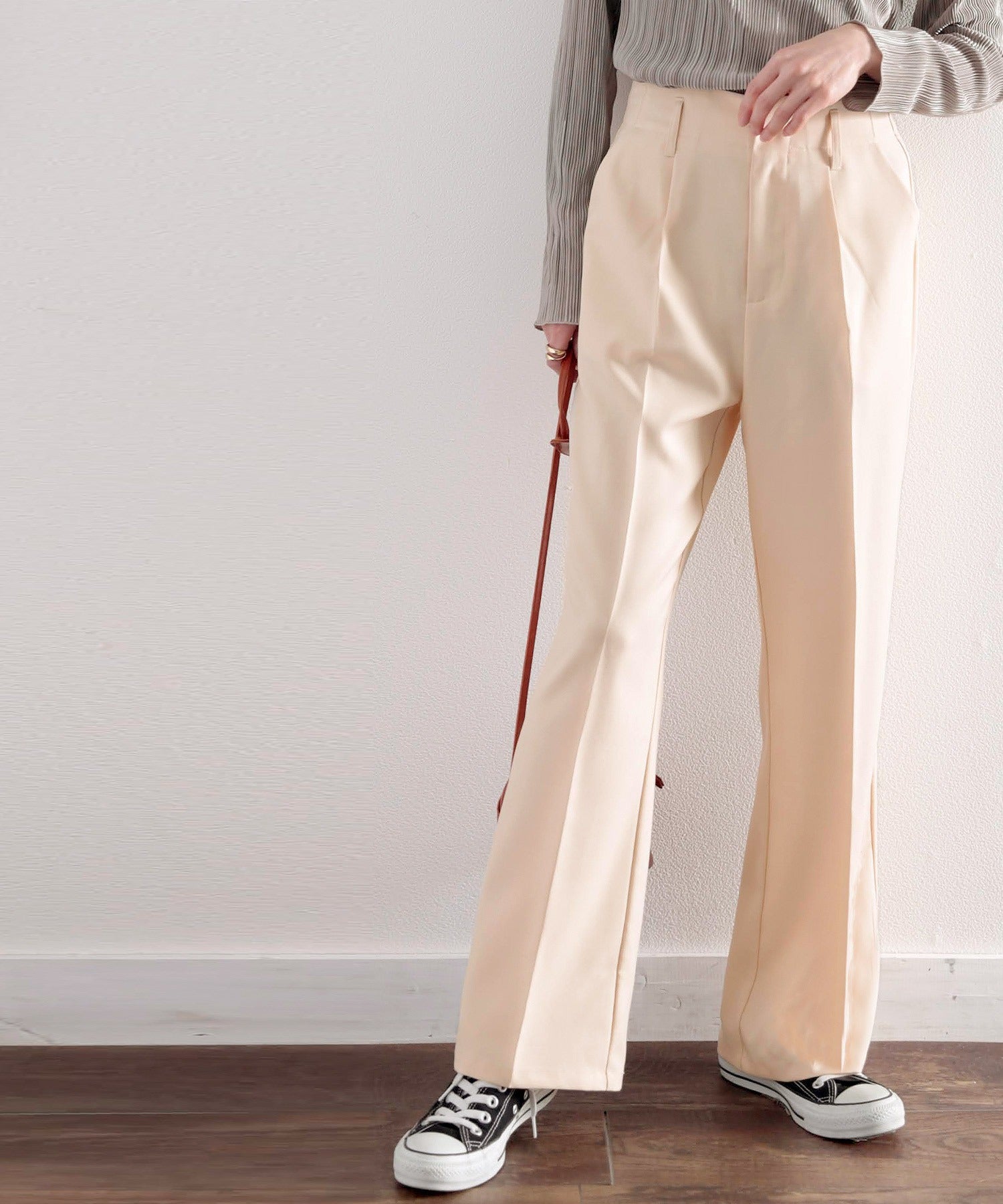 美シルエットが人気の細見せセンタープレスフレアパンツ。