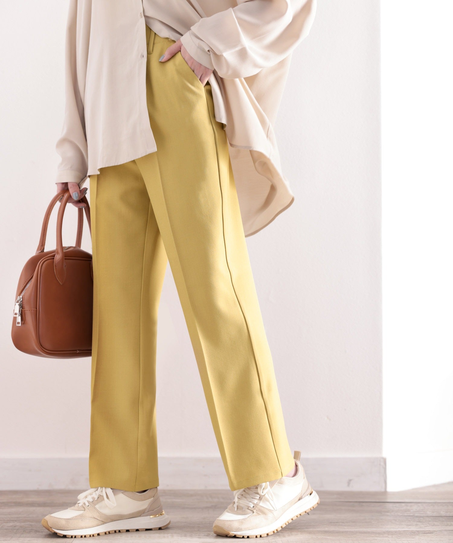 裾に向かってほど良く広がるフレア感とセンタープレスで縦長効果が期待できる優秀な1着。