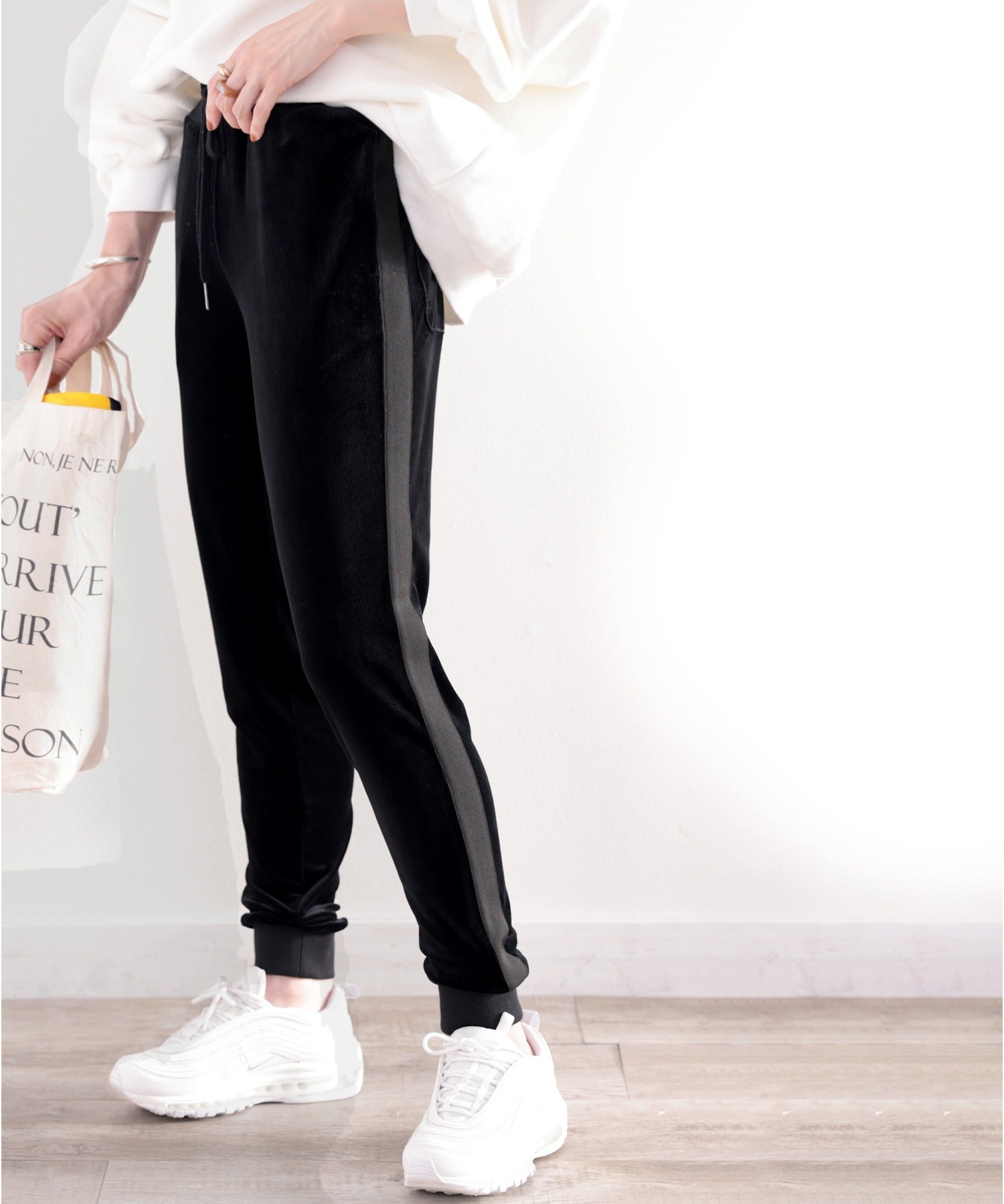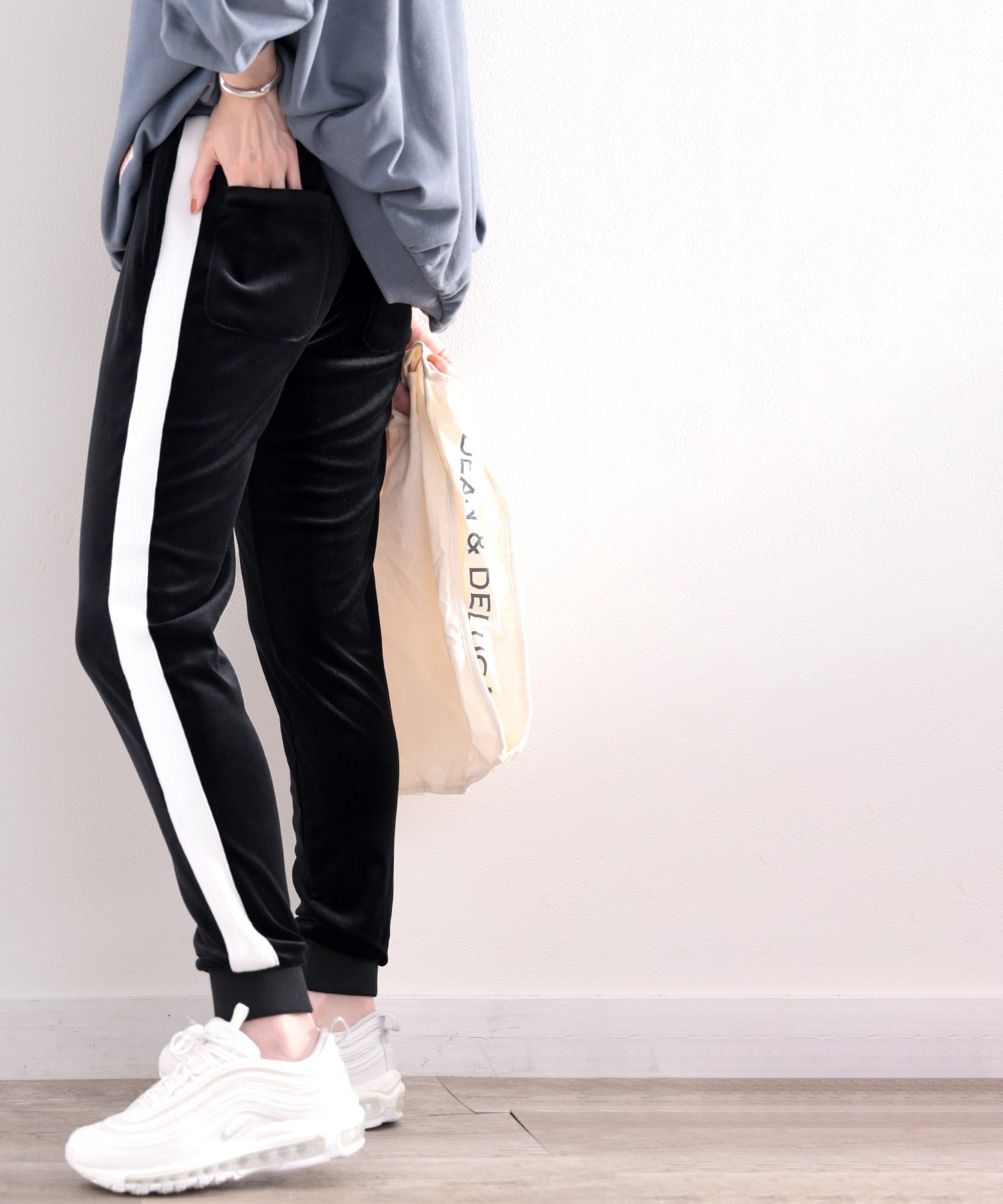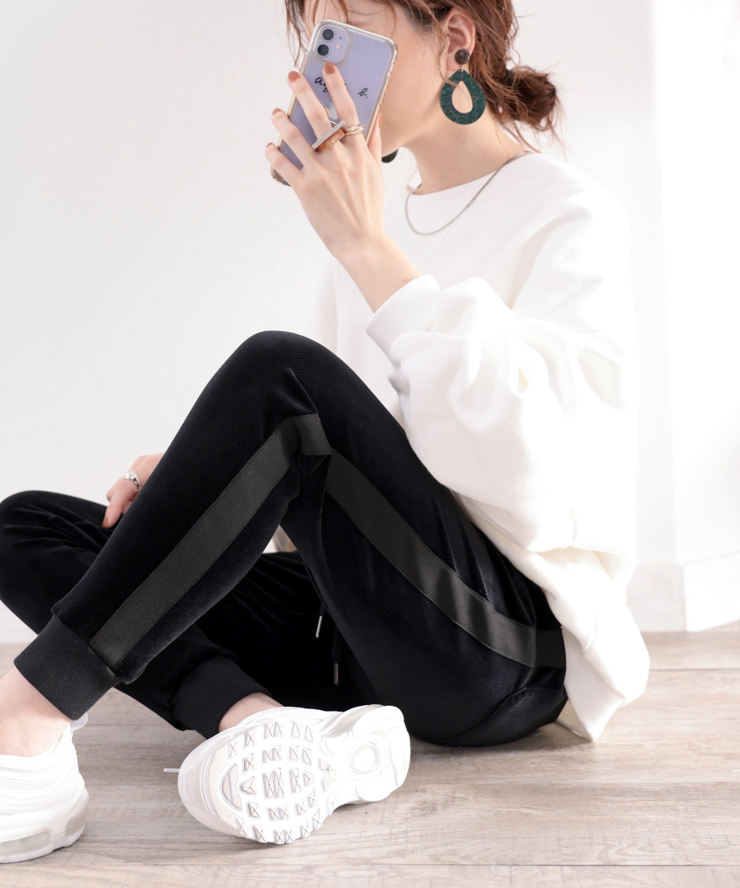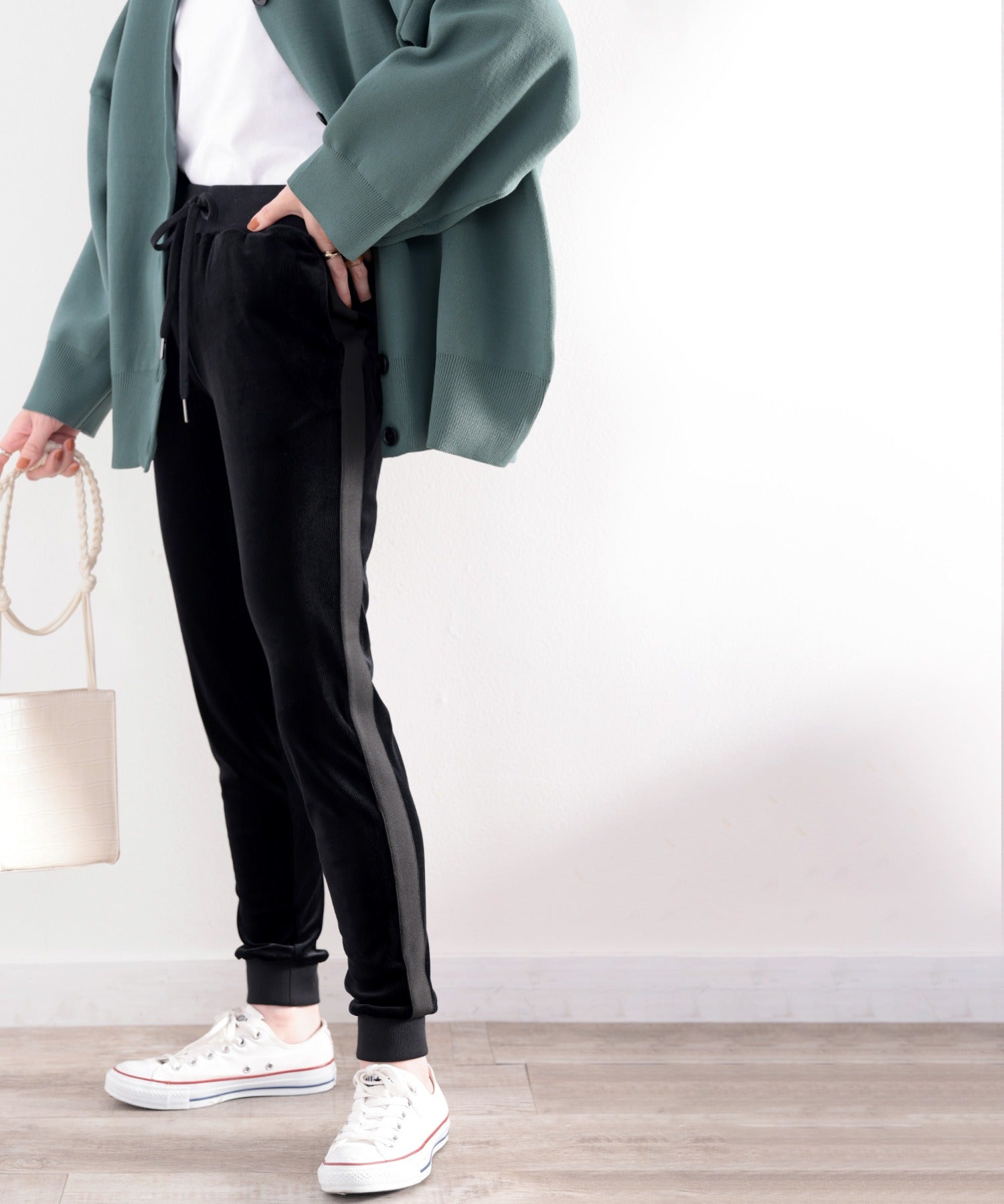 ベロアのとろみのある素材感にサイドラインがスポーティなアクセントになっていて