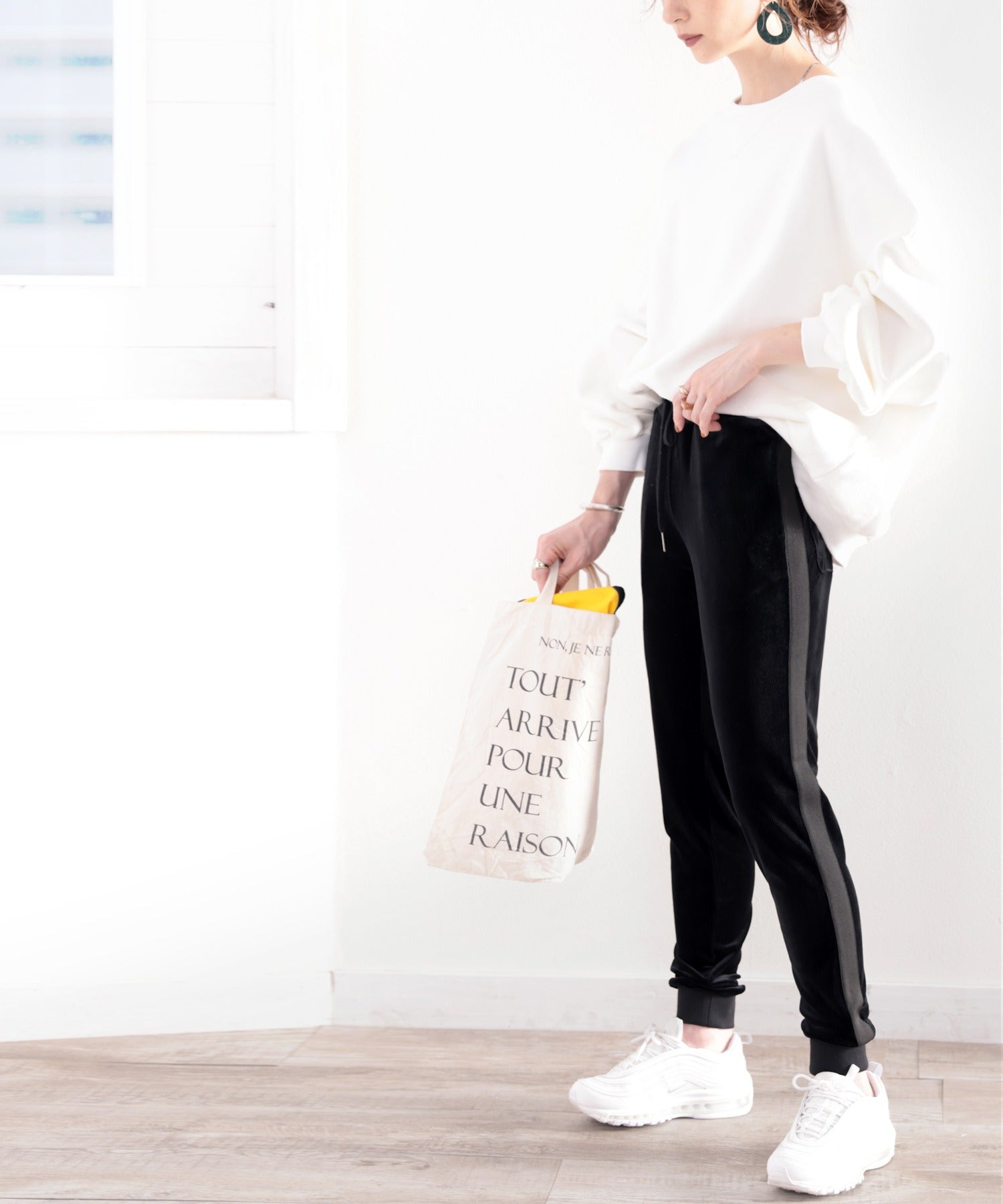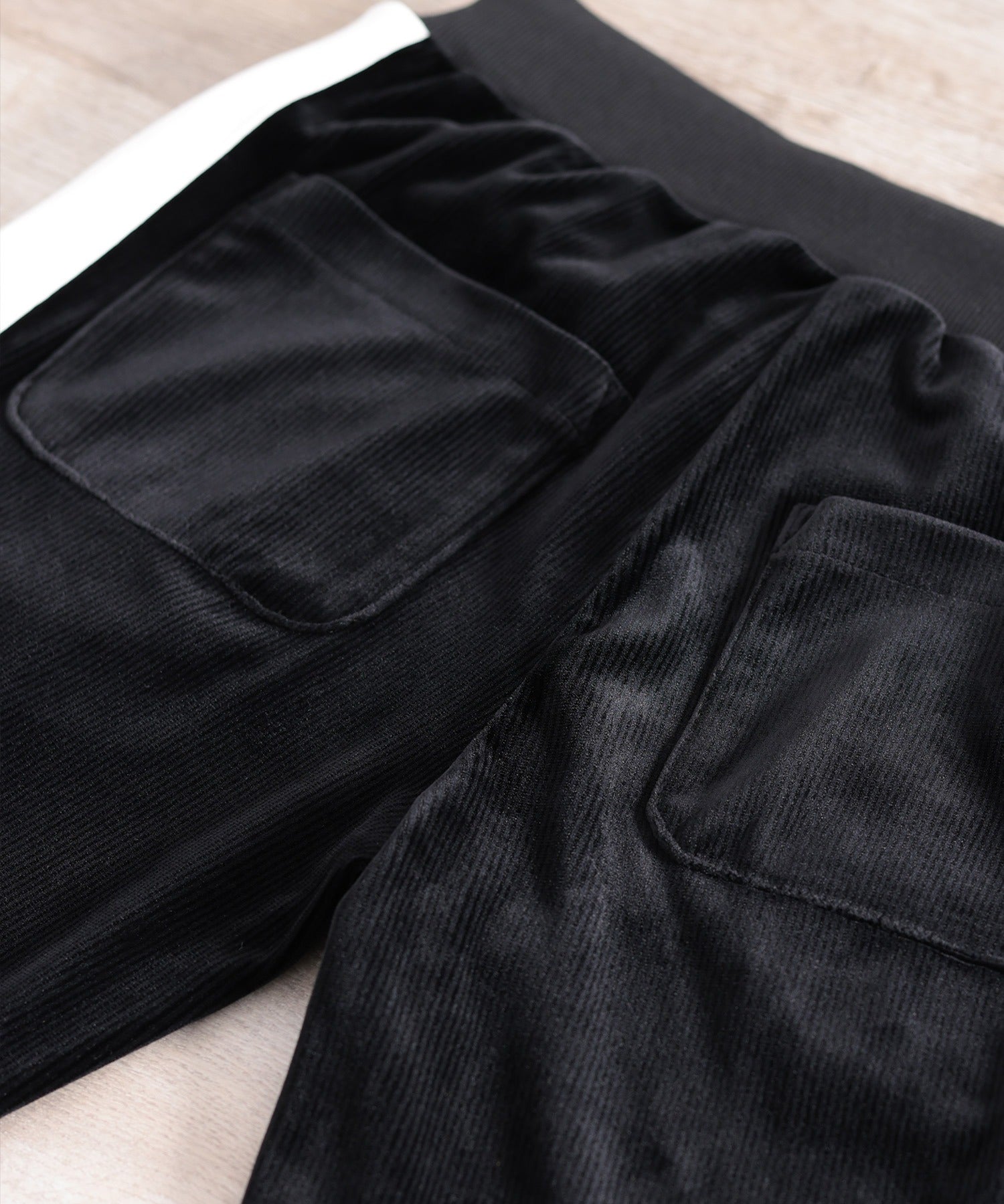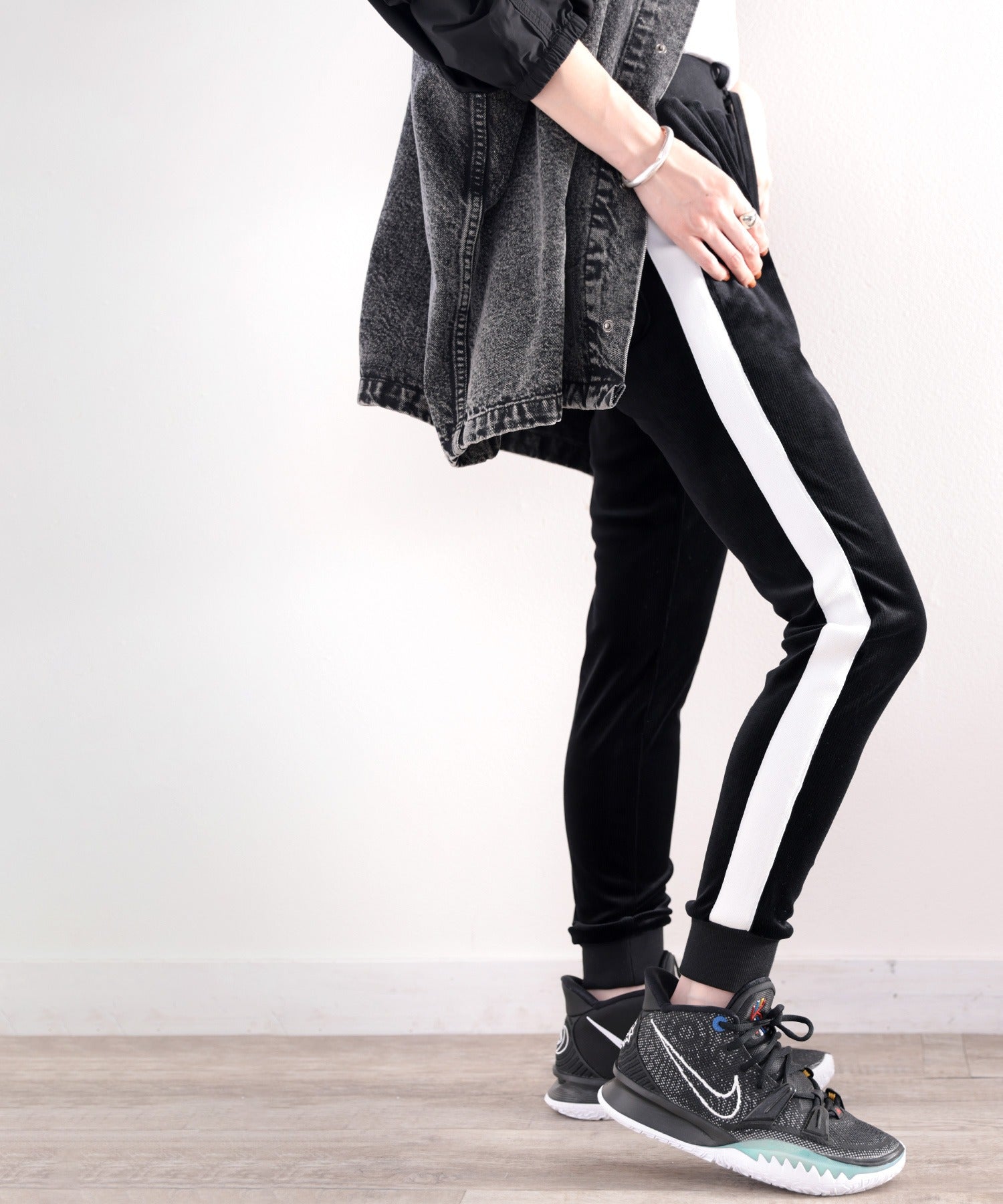 ベロアのとろみのある素材感にサイドラインがスポーティなアクセントになっていて