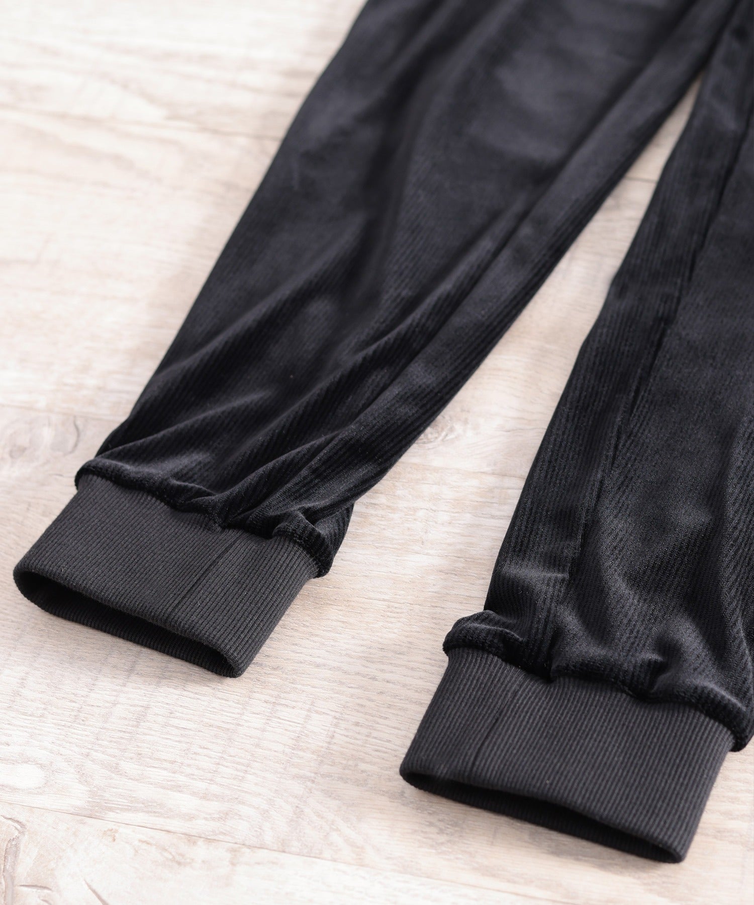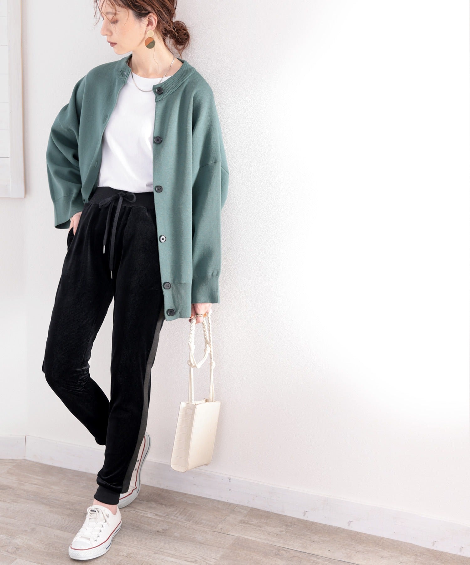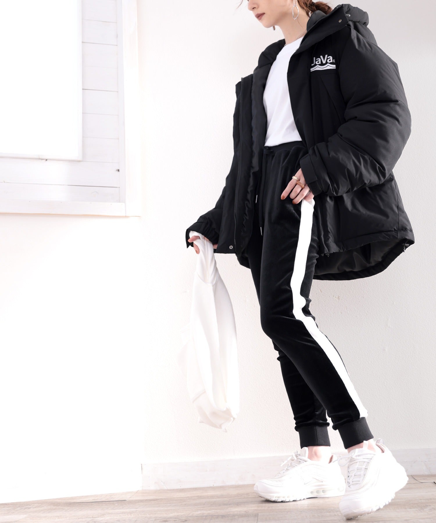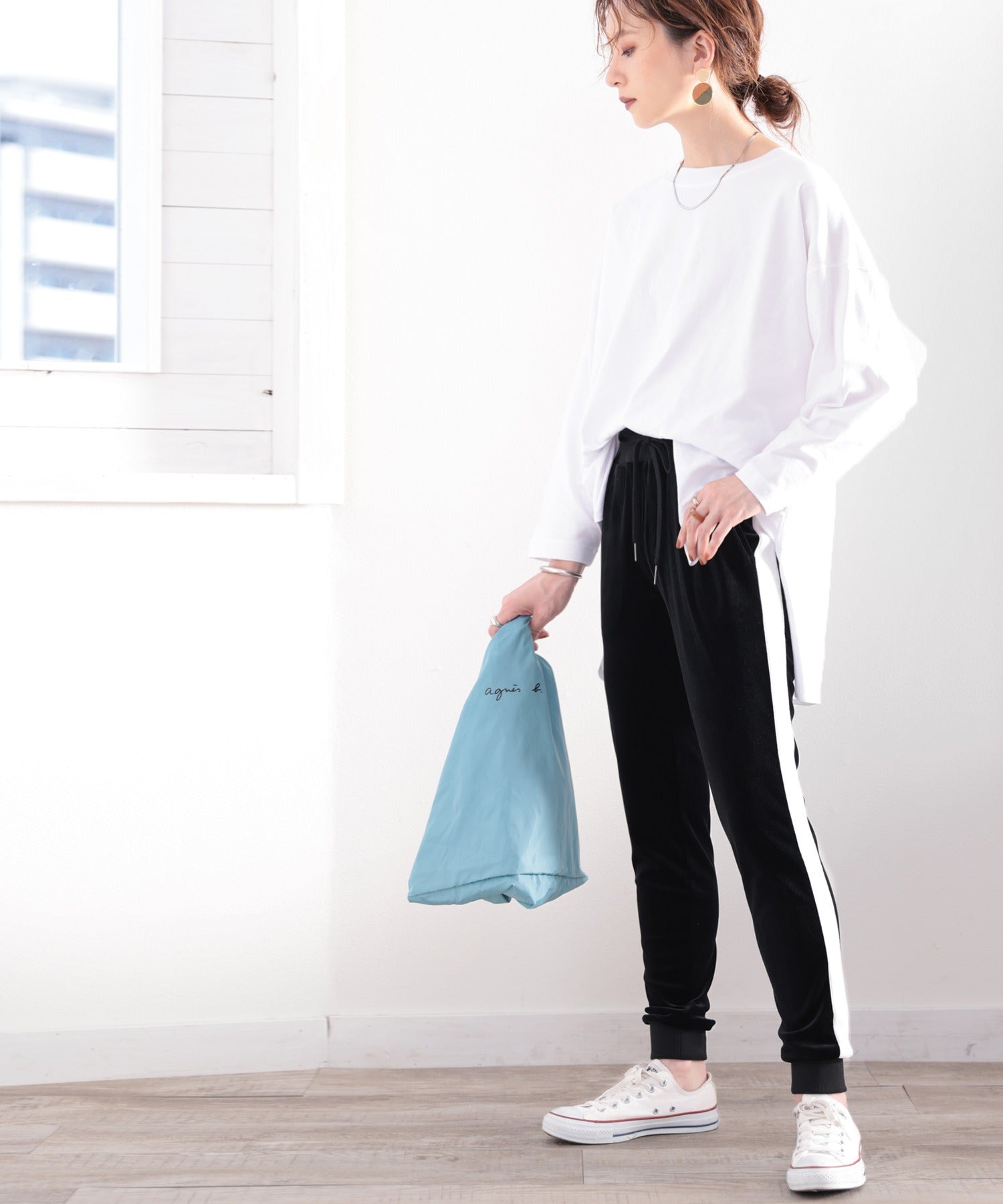 ベロアのとろみのある素材感にサイドラインがスポーティなアクセントになっていて