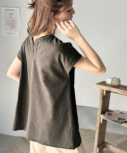 襟元と袖口は切り替えデザインで、ステッチを施しシンプルながら