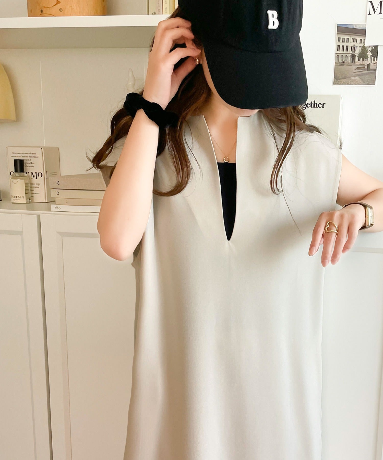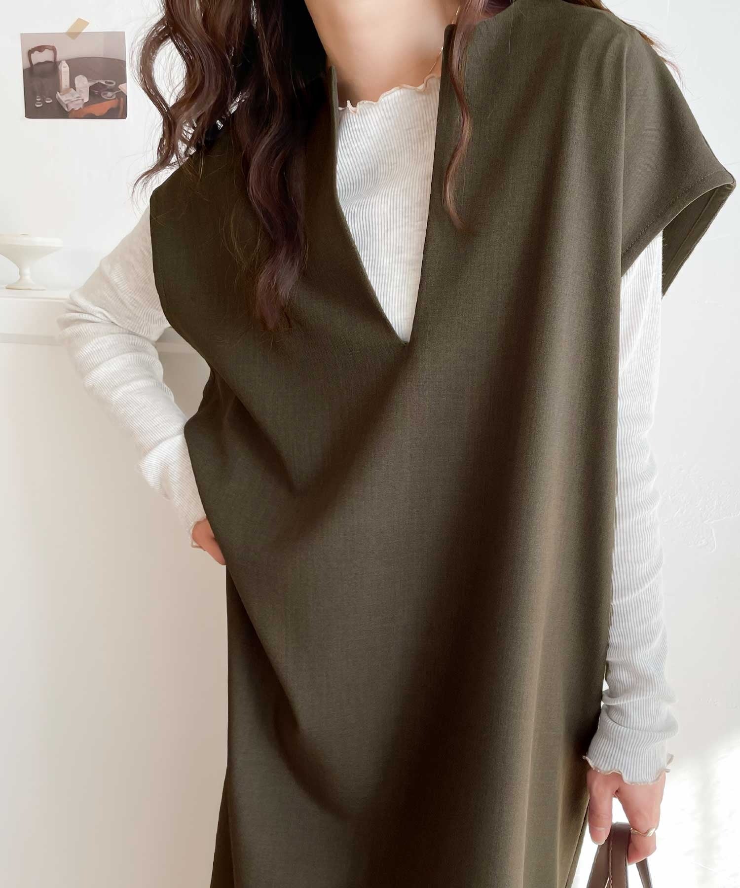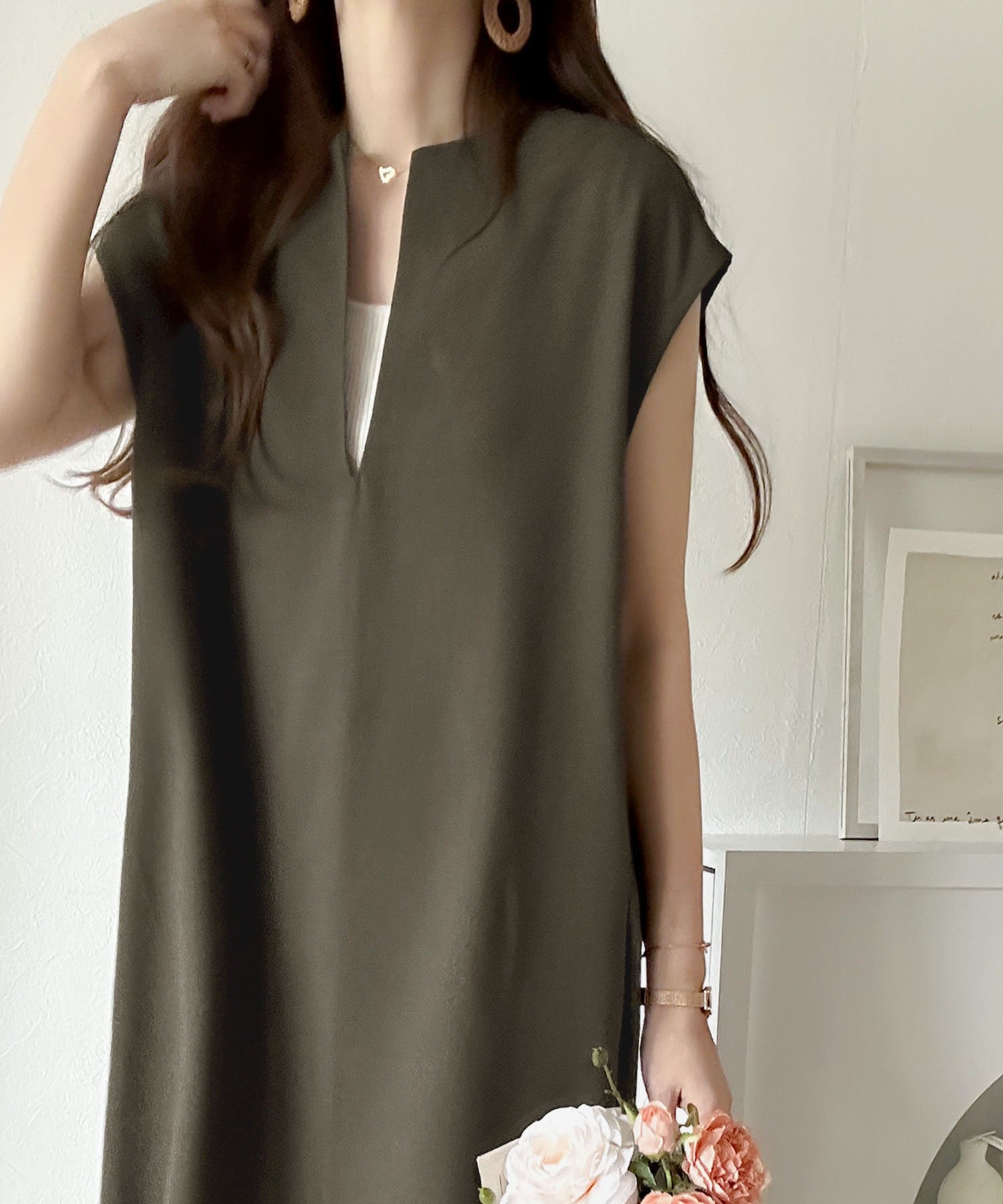深めのVネックで大人っぽく、裾は前後差をつけたサイドスリット入りで